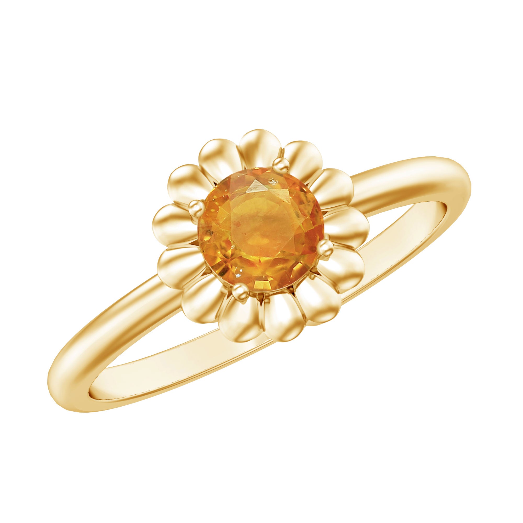 A stunning Solitaire ring featuring a dazzling round cut Orange Sapphire in a golden flower design. The Orange Sapphire is set in a classic prong setting and is surrounded by delicate petals, creating a unique and beautiful piece of jewelry. Perfect for a special occasion, this engagement ring is sure to become a cherished treasure.