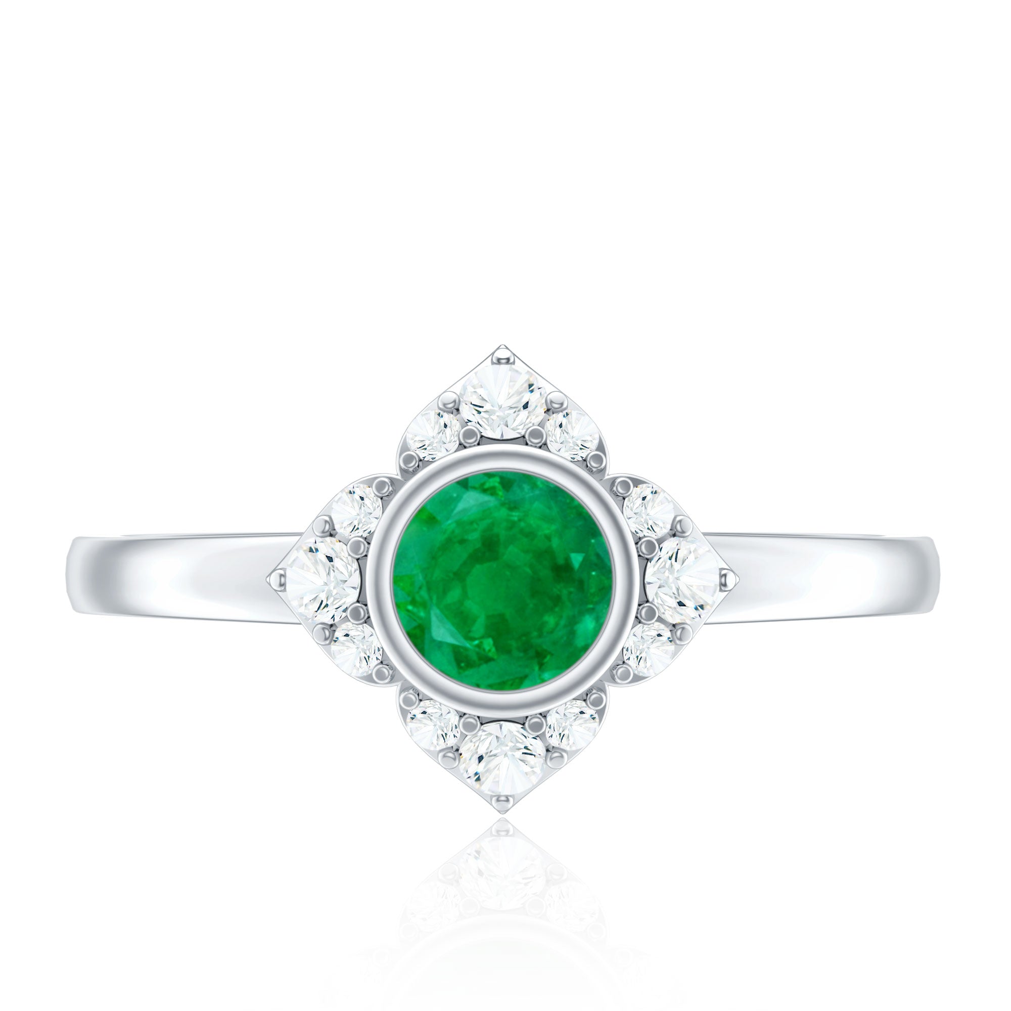 Natural Bezel Set 5mm Emerald Flower Engagement Ring with Diamond