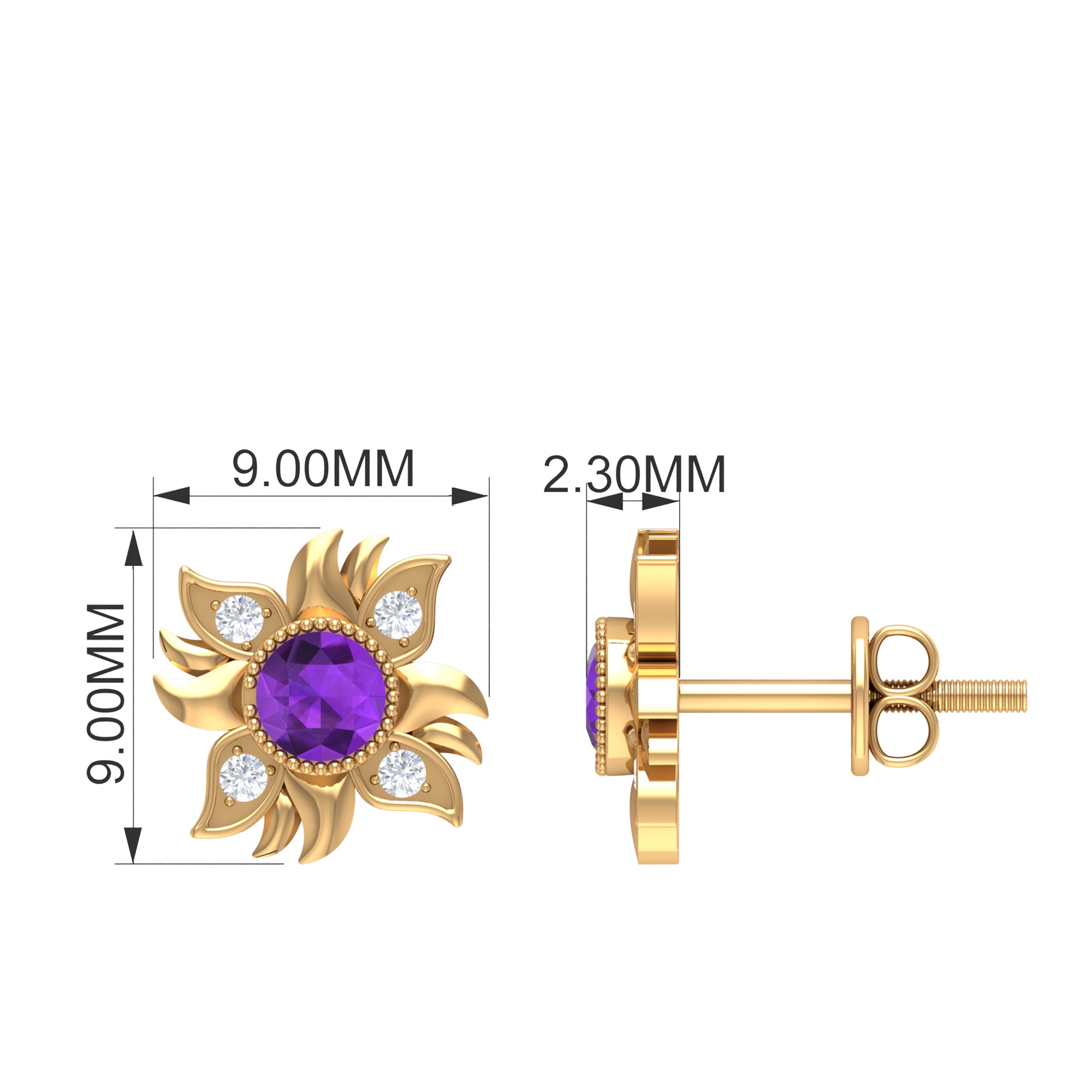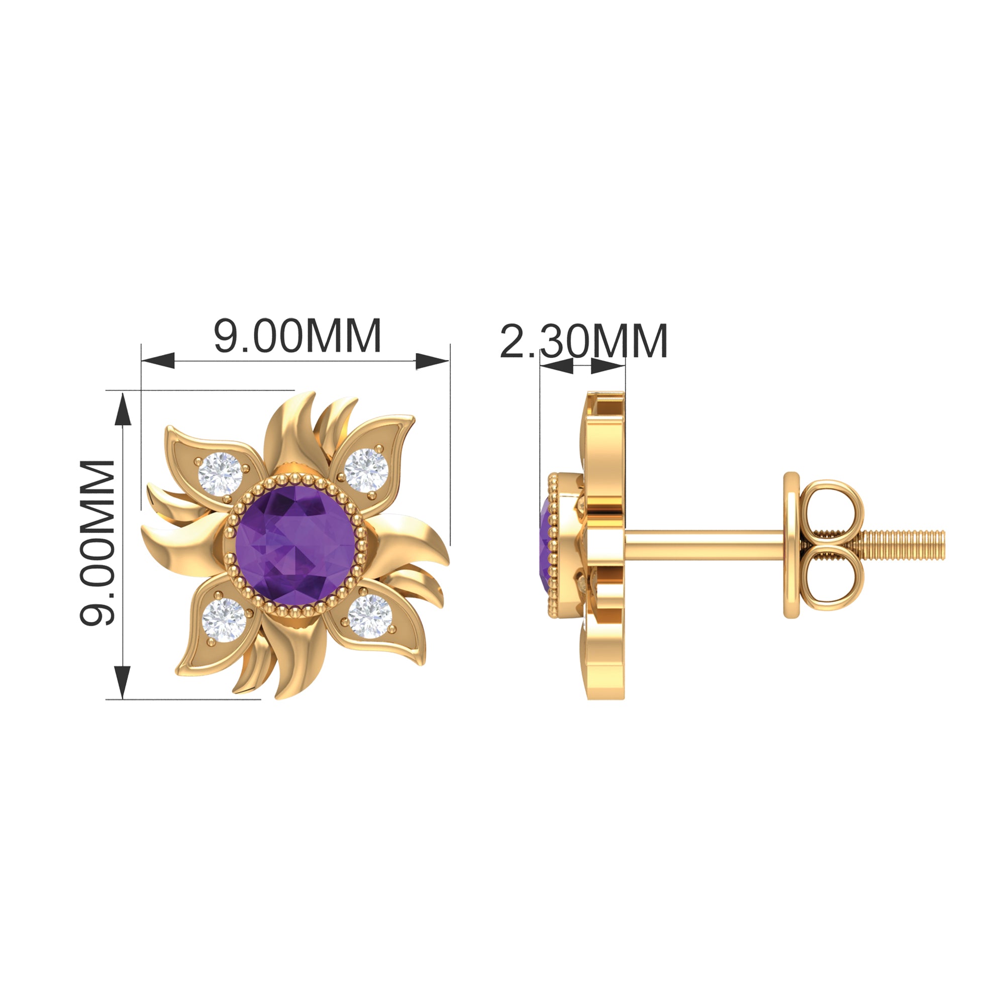 1/2 CT Round Shape Amethyst and Diamond Sunburst Stud Earrings