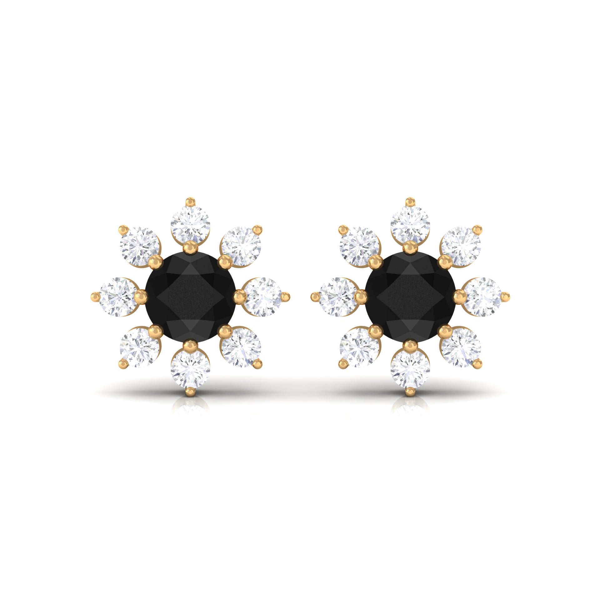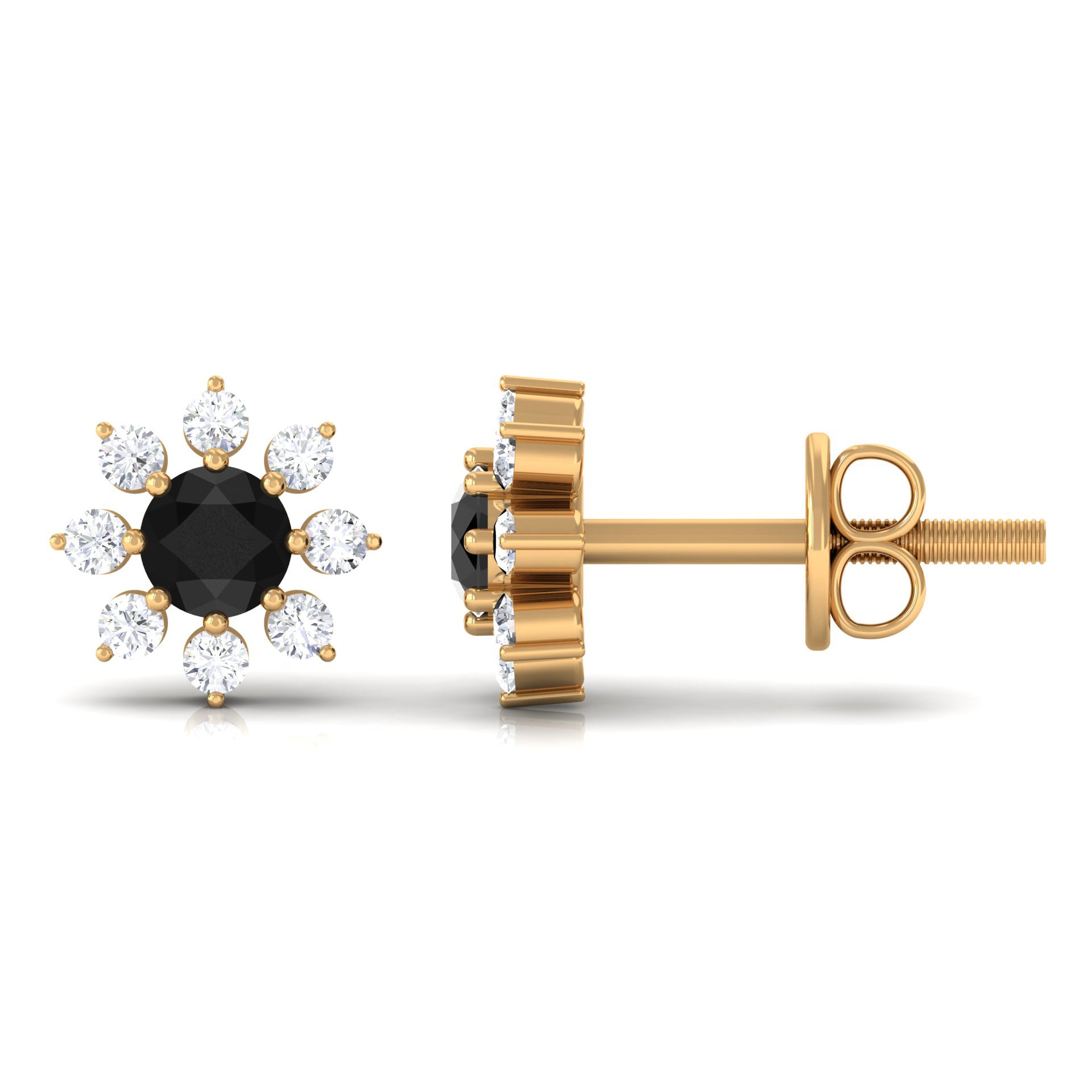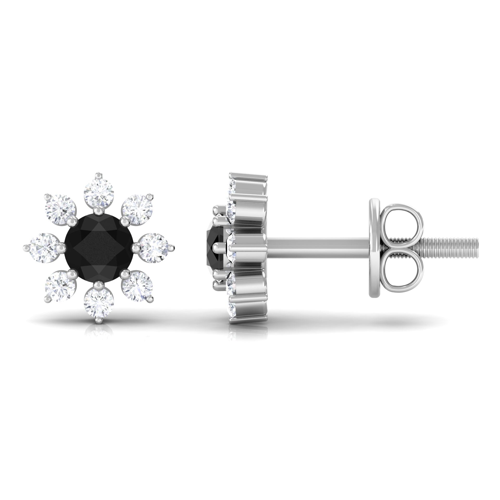An enchanting Floral Stud Earring is adorned with Round Shape Black Diamond is encircled with Round Shape Diamond Gemstone in Prong Setting with Screw Back safety. So grab it soon to gift it as a Wedding Earring to someone very close to you.