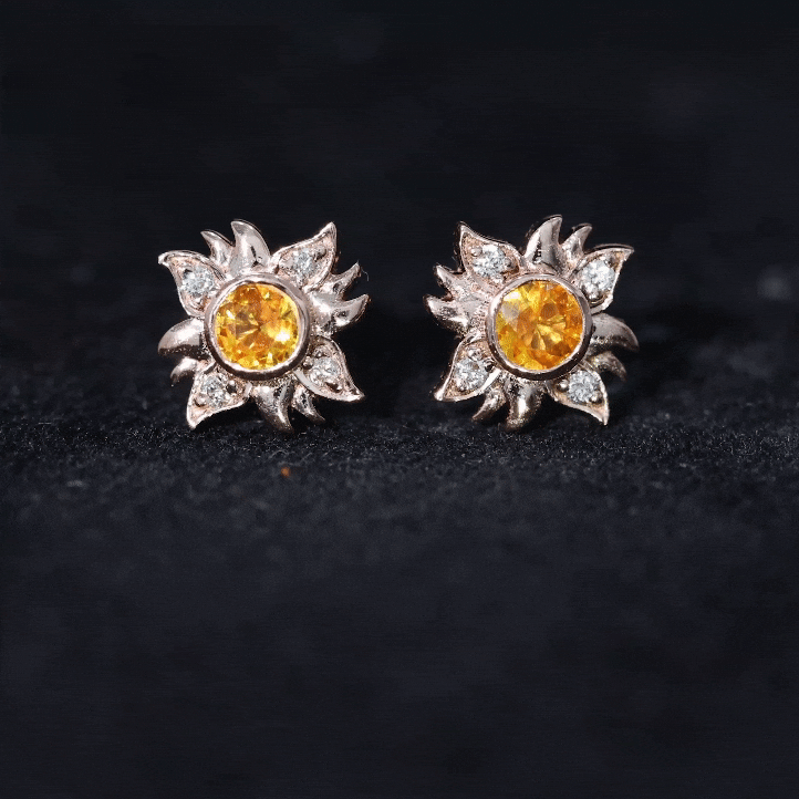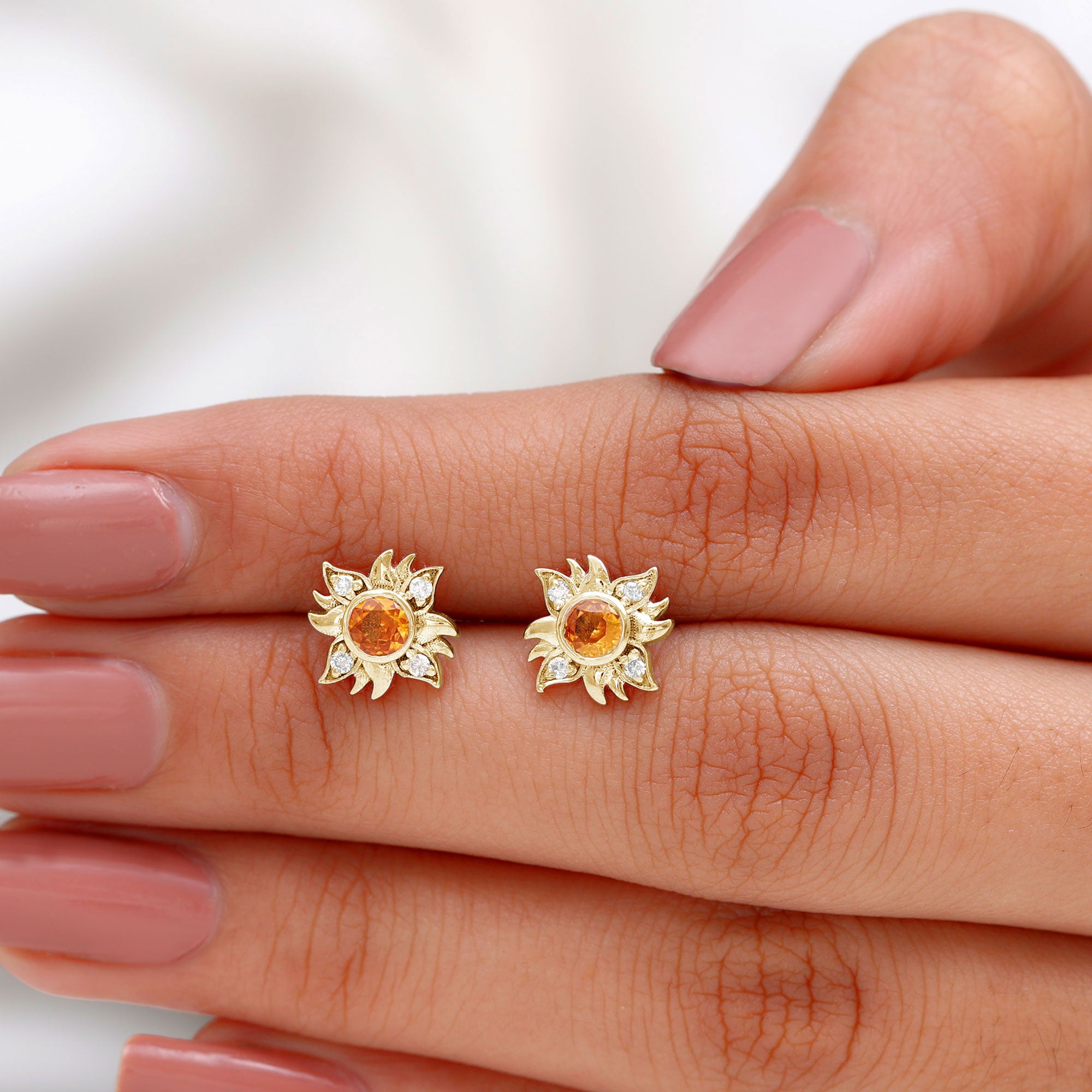 This Sunburst Stud Earrings is embellished with Round Shape Orange Sapphire is set at the center in a Bezel Setting and round shape Diamond are set as floral pattern.