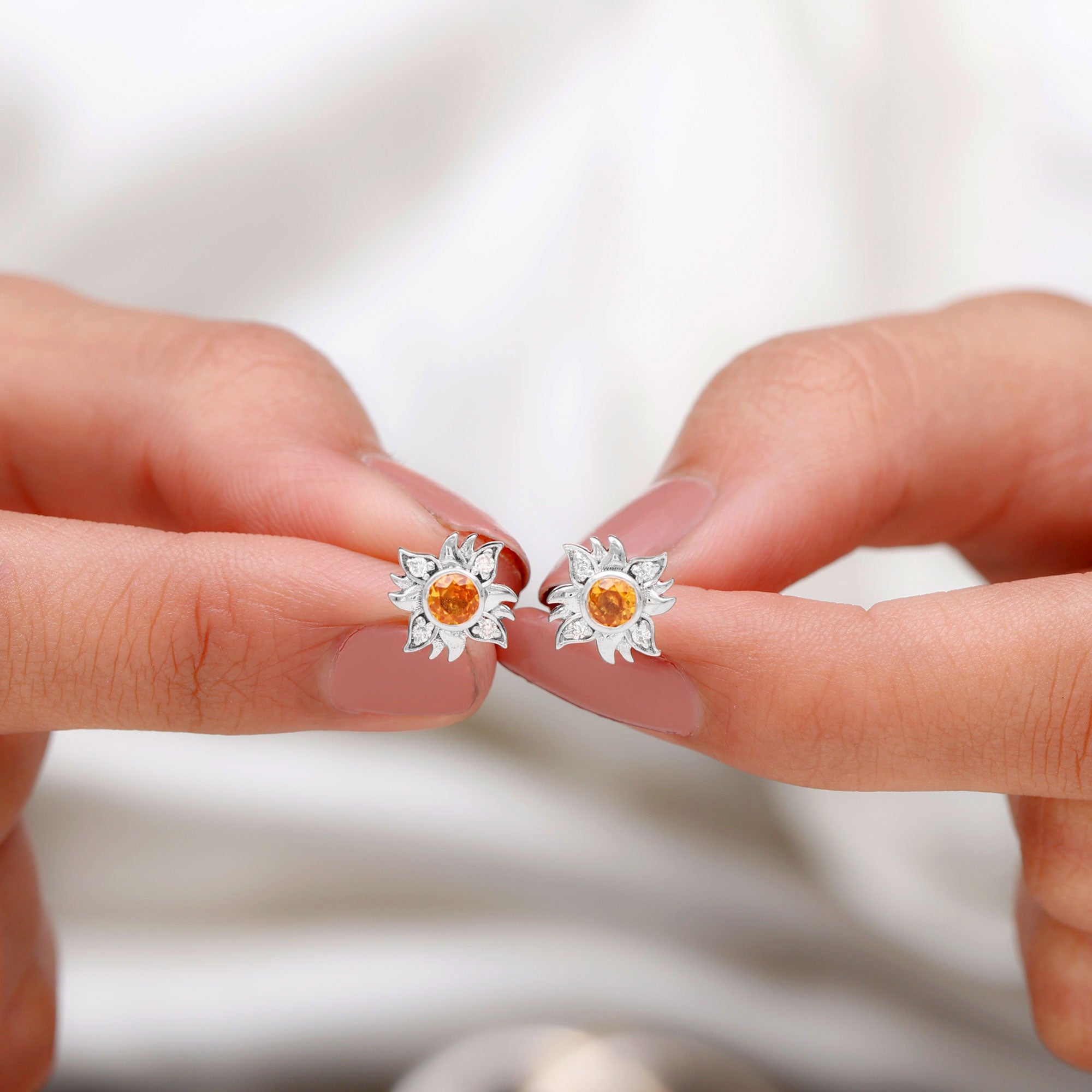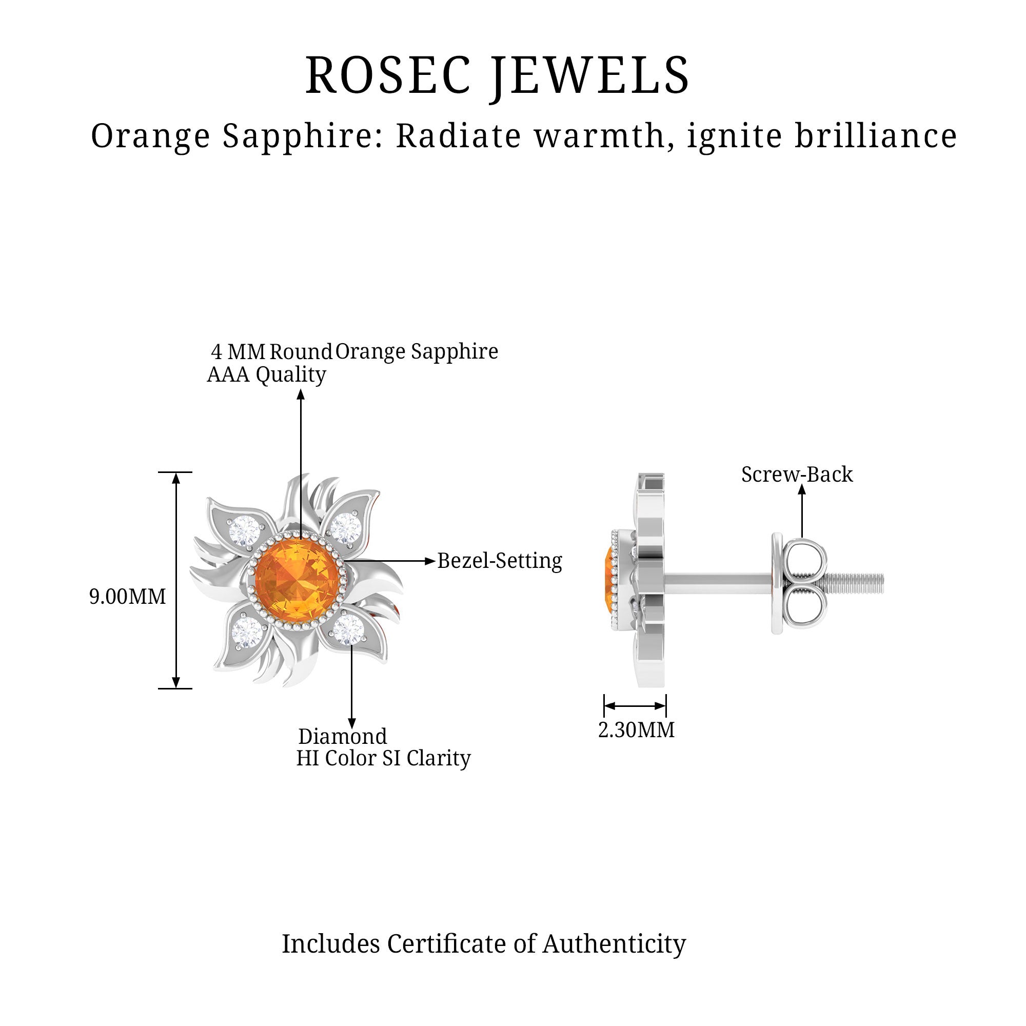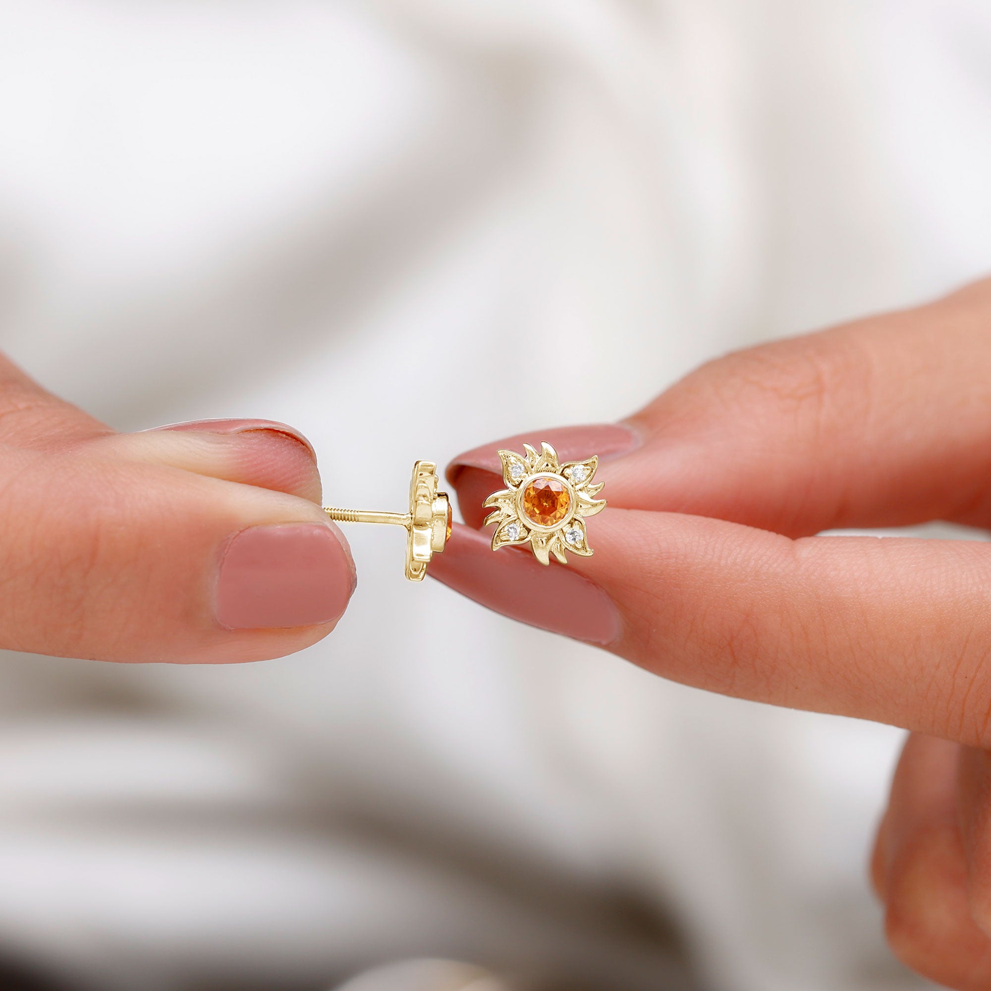 1/2 CT Round Shape Orange Sapphire and Diamond Sunburst Stud Earrings