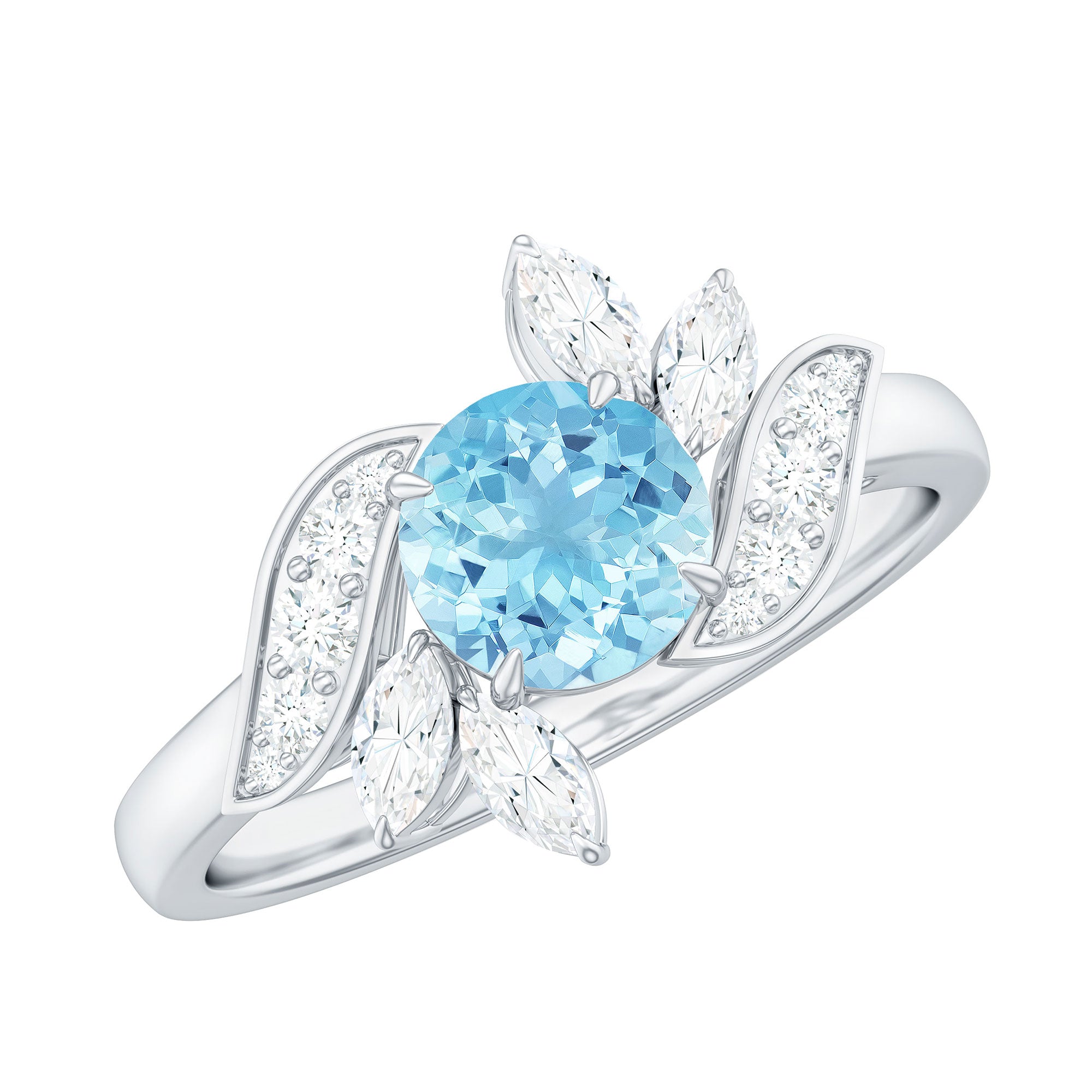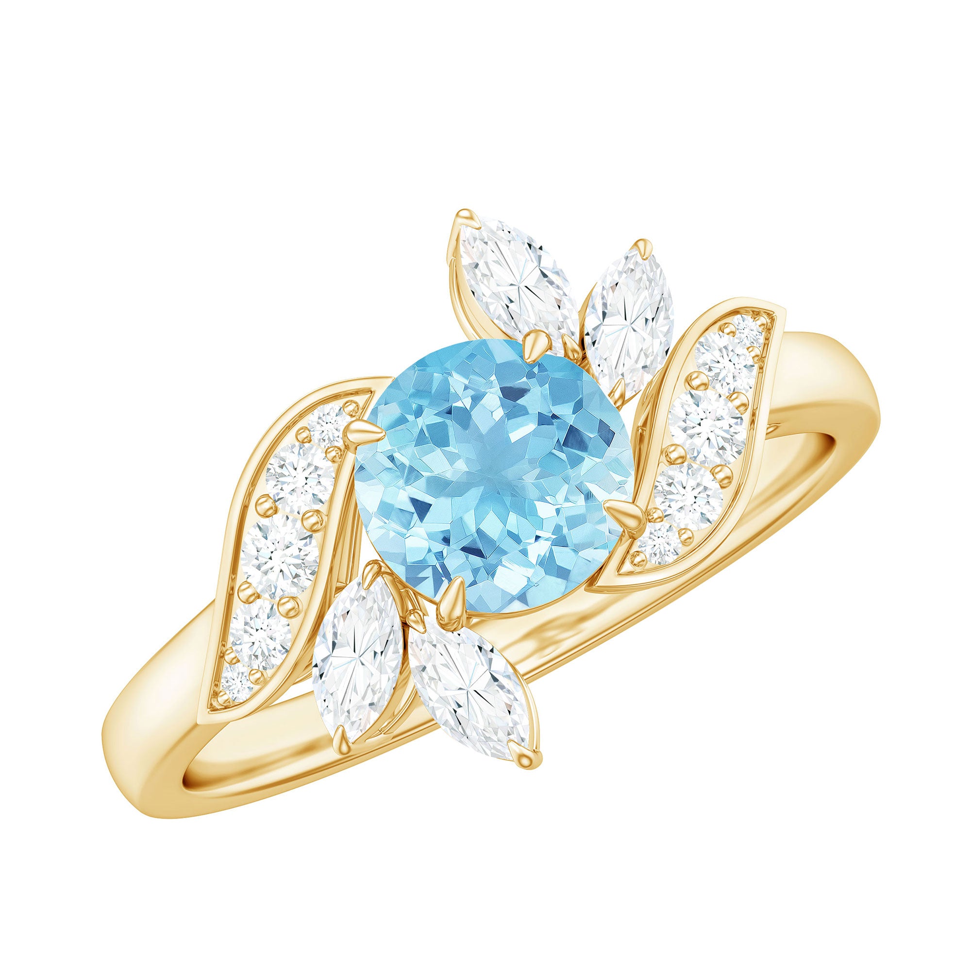 Celebrate your magical love with this enchanting flower engagement ring, perfect for the one who has brought magic into your life. This stunning ring features a captivating round-cut aquamarine gemstone, which takes center stage in a secure claw setting. The unique shank of the ring is adorned with a combination of marquise and round-cut Diamond gemstones, adding extra sparkle and brilliance to the already dazzling design. Crafted from solid gold, this engagement ring is both luxurious and durable, making it a perfect choice for your fiancé to wear on her happiest day. With its captivating beauty and unique design, this ring is a wonderful way to express your love and commitment to your partner.