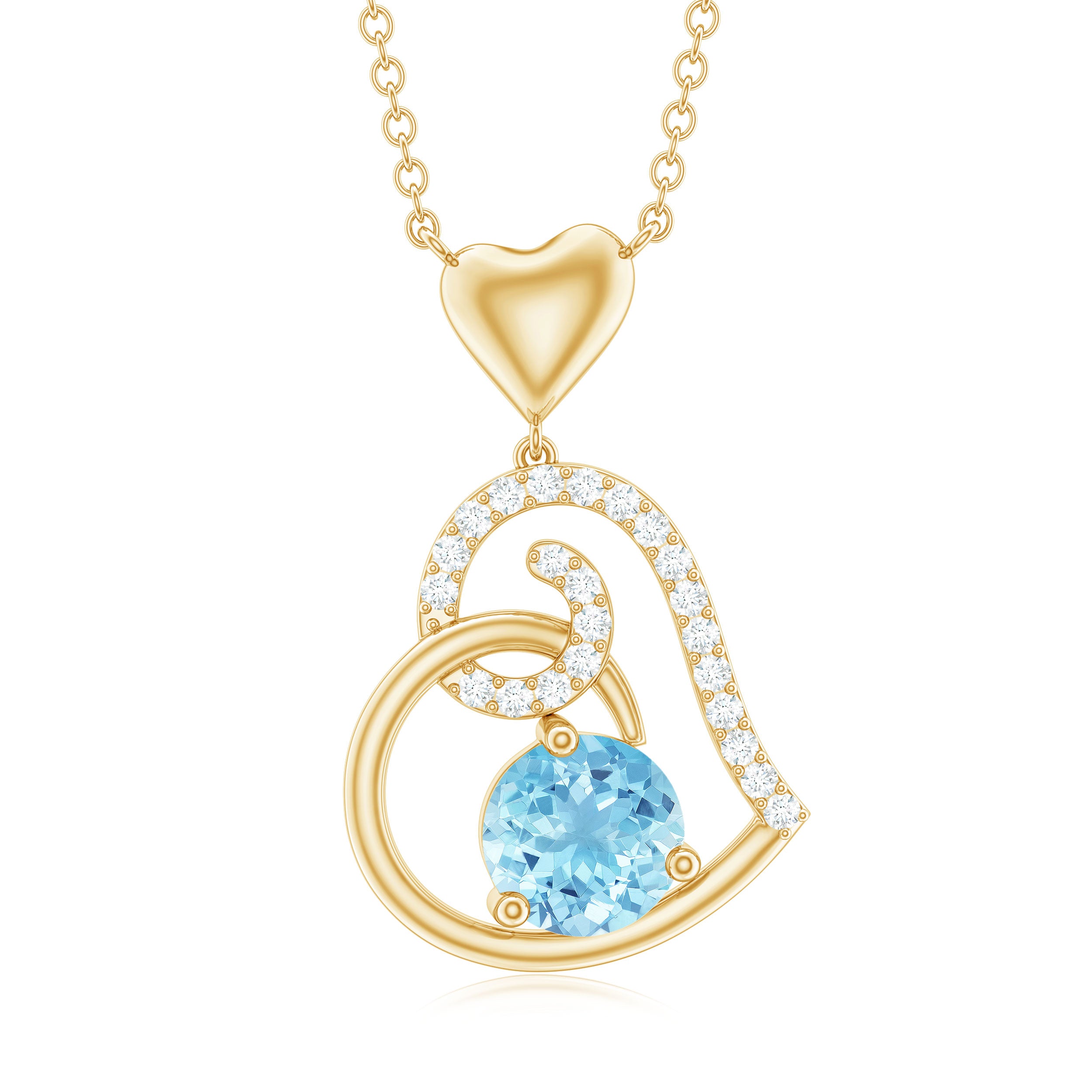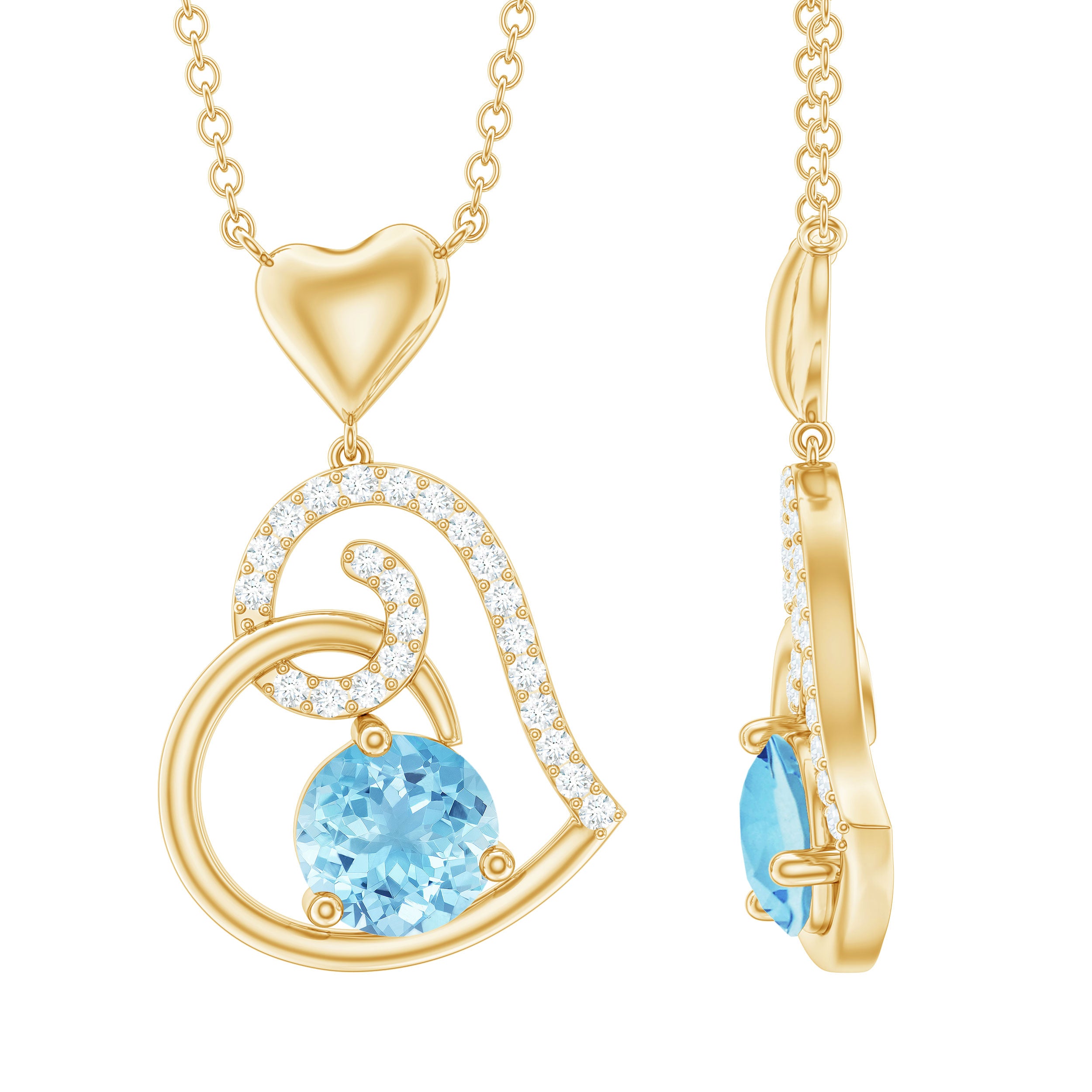 Be Dazzle with these beautiful Heart Drop Pendant embellished with Round Shape Aquamarine as Solitaire in 3 Prong Setting and Round Shape Diamond in Prong Setting, Crafted in Solid Gold.
