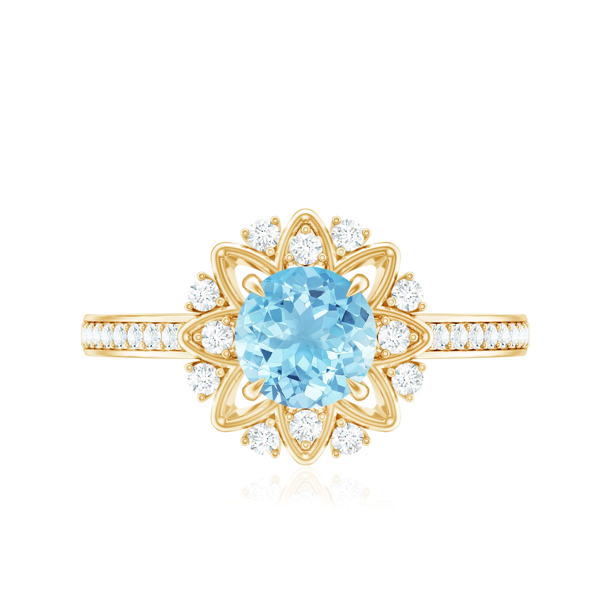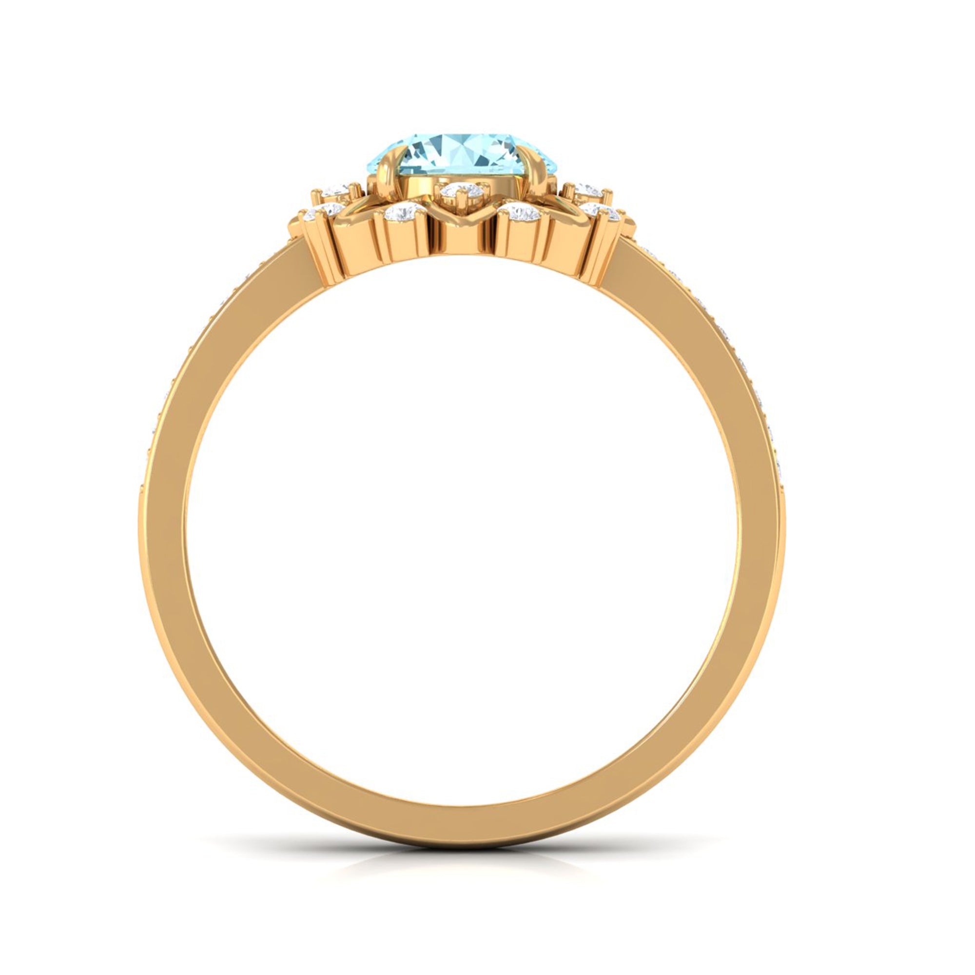 Claw Set Round Aquamarine Ring is accentuated with Gold Floral Pattern and Round Diamond in between and also as Side Stones. This Aquamarine and Diamond Engagement Ring is full of beauty and charm. Elate your pretty lady with this Aquamarine Engagement Ring on her special day.