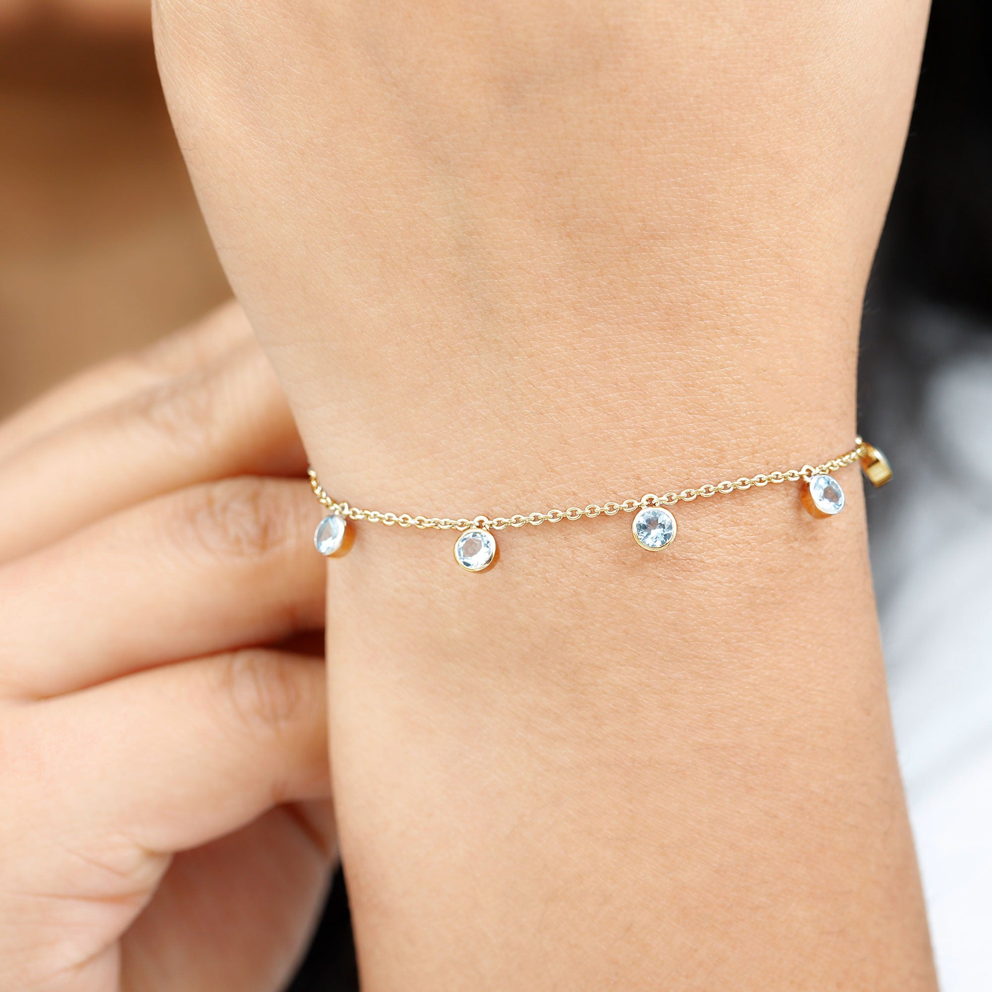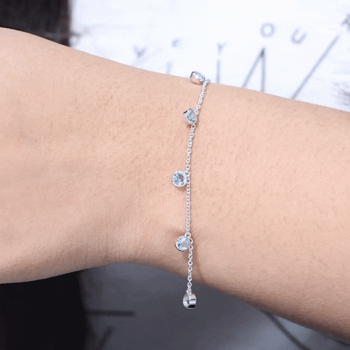 Grab this shinning Station Chain Bracelet for your Girl embellished with Round Cut Aquamarine in Solid Gold with Bezel Setting. She is going to definitely love your surprise Present.