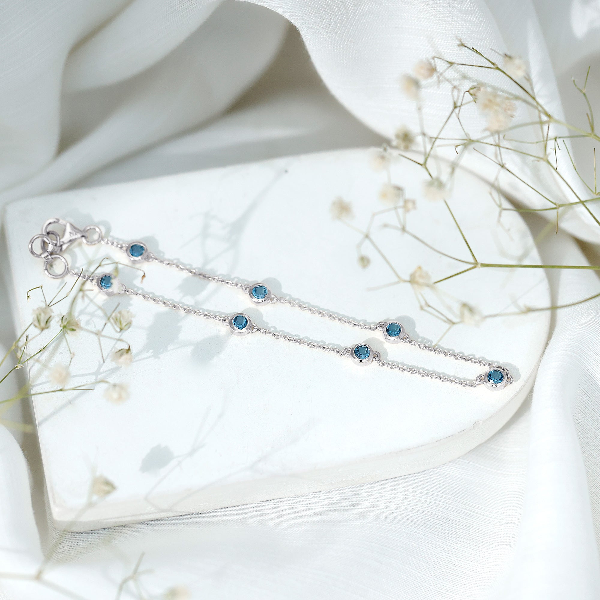 Express your love and make her happy by giving her this glossy London Blue Topaz Bracelet this Valentine. This Gold Chain Bracelet will magnify the beauty of your wrist and make your wrist glossy. This Eternity Bracelet is perfectly composed of Solid Gold and decorated with Round Cut London Blue Topaz in a Bezel Setting over Station Chain.