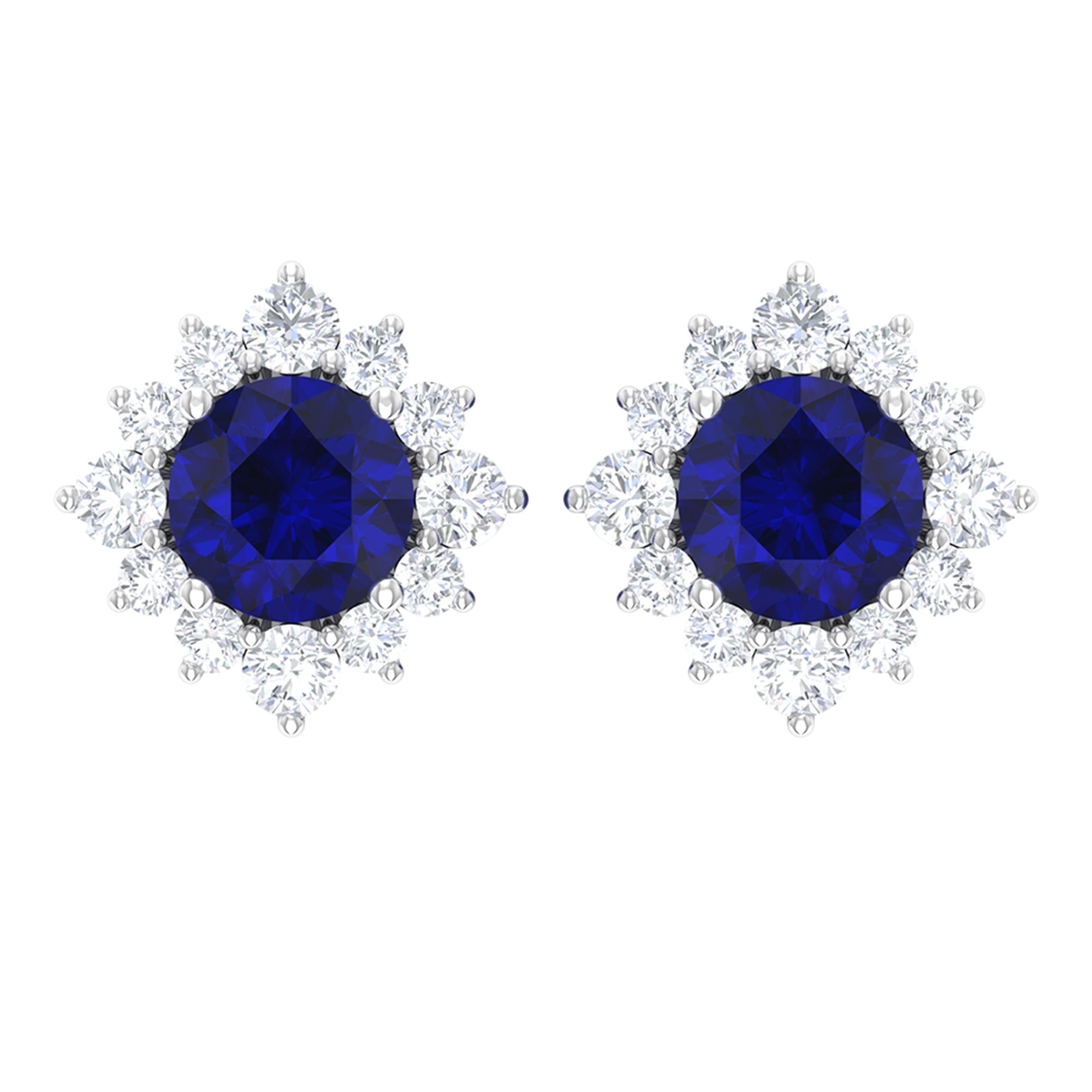 Make a statement with our Classic Stud Earrings featuring Round Shape Blue Sapphire Solitaire and Diamond Halo adorned in 14K Solid Gold.