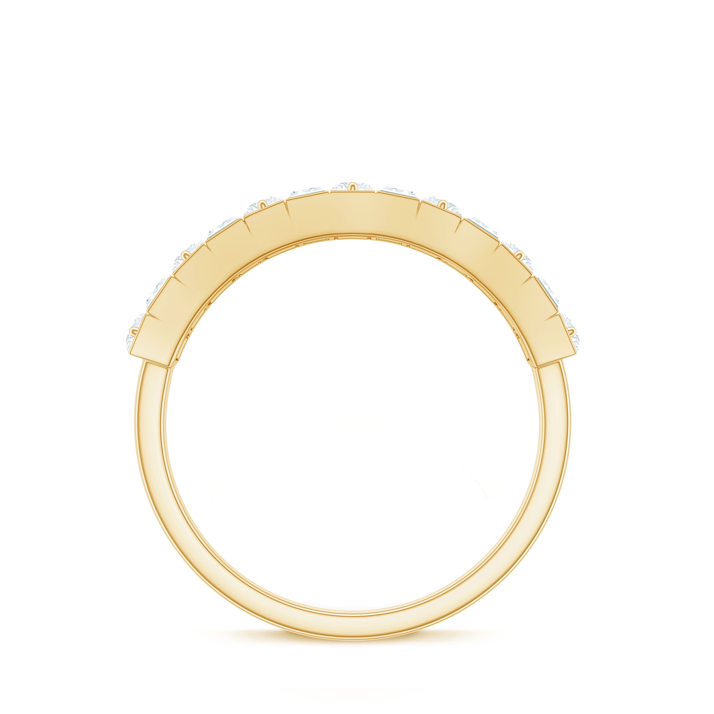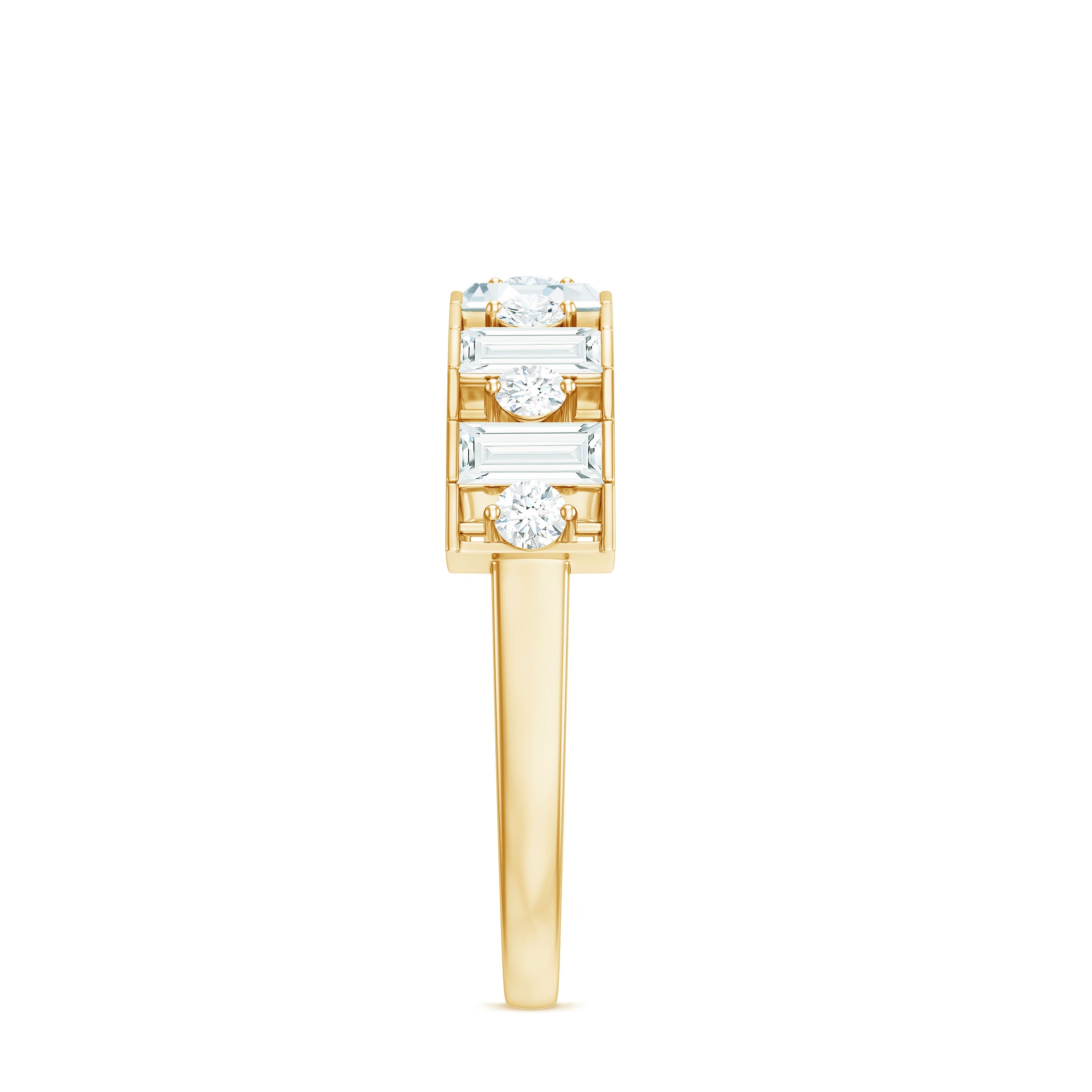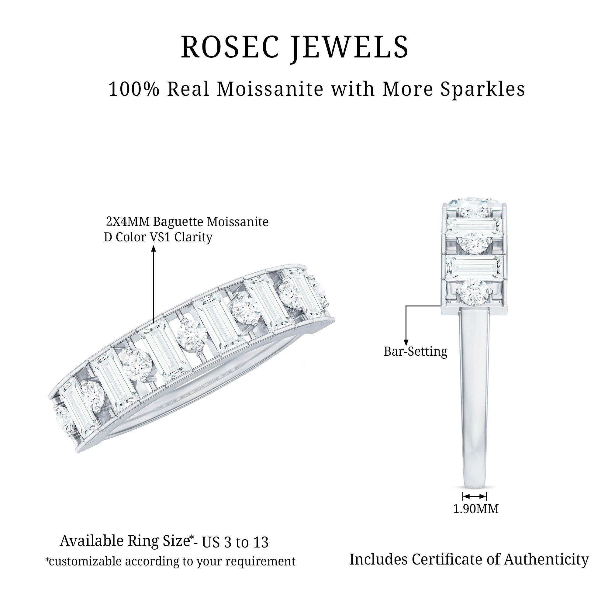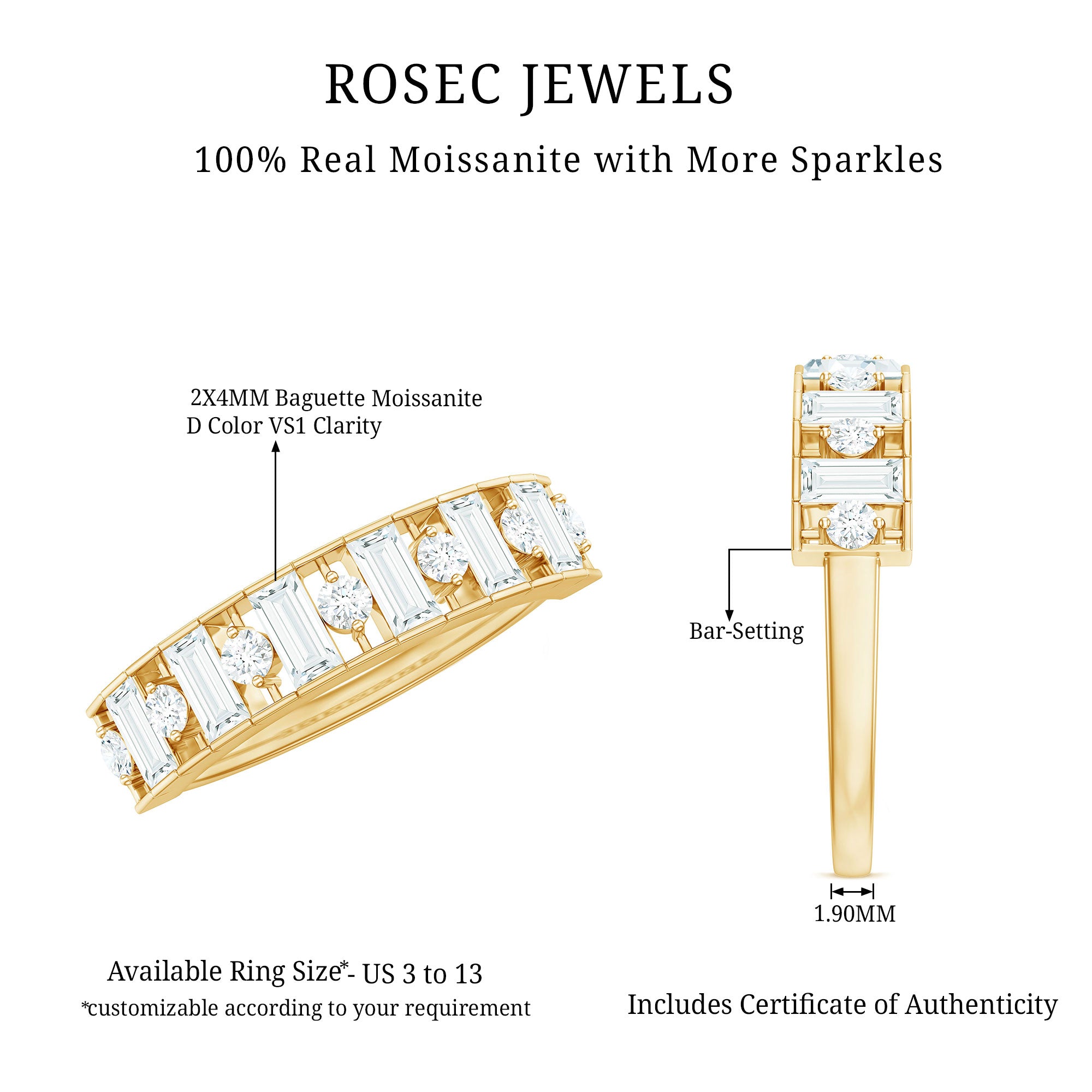 Simple and full of shine, this Moissanite Half Eternity Band brings classic style and everyday comfort together. The front of the Eternity Wedding Band features a beautiful mix of baguette and round cut moissanite stones. The baguette stones give a modern look, while the round stones add a sparkling glow. The two shapes are placed in an alternating pattern, creating a lovely rhythm of sparkle across the top. The back of the Wedding Anniversary Band is smooth and plain, making it very comfortable to wear all day. Whether you are working at a desk, going out, or just relaxing, this Moissanite Stackable Ring feels light and easy on your finger. This Moissanite Wedding Band is a great choice for many occasions. It works perfectly as a modern wedding band, a thoughtful anniversary gift, or a stylish stackable ring. You can wear it alone to let it shine on its own or pair it with your engagement ring for a complete and glamorous bridal look. It is a great mix of luxury and comfort, making it a piece you will want to wear every day.