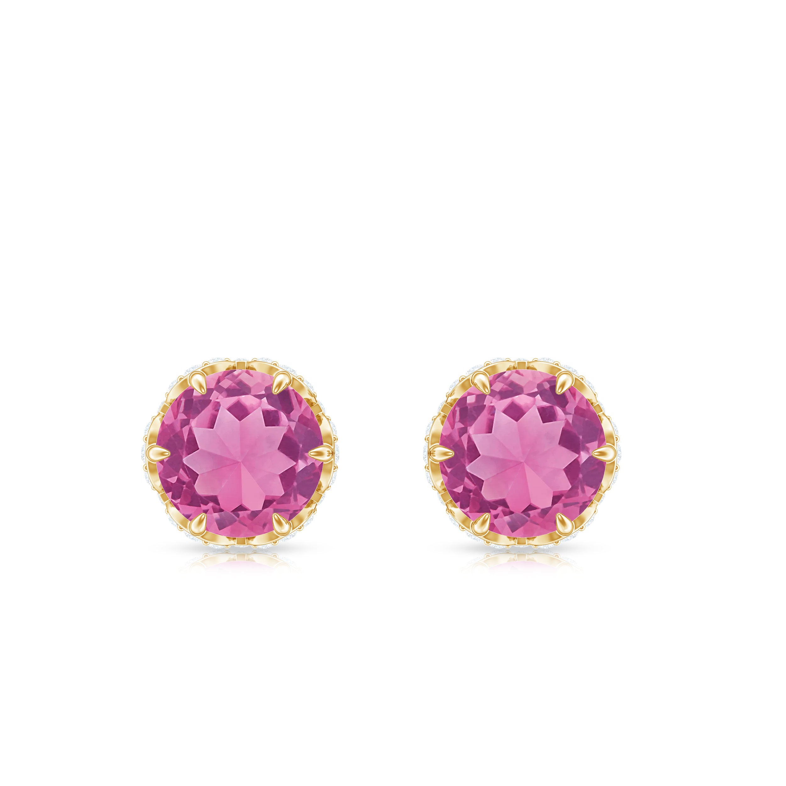 Enhance your Beauty with these Solitaire Stud Earrings embellished with Round Shape Pink Tourmaline set as Solitaire in Claw Setting and round shape Diamond is set in Decorative Setting. This Simple Stud Earring is Composed of Solid Gold.