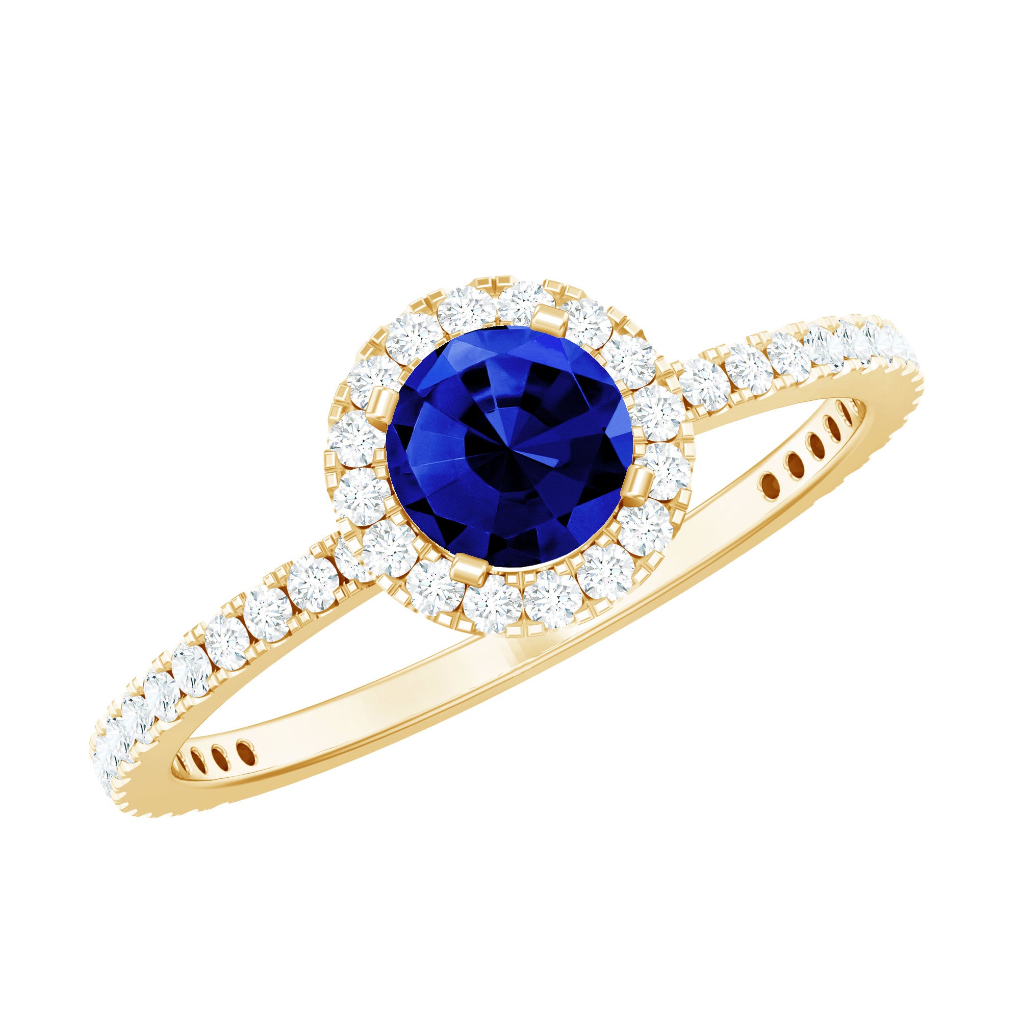 A Unique Engagement Ring is embellished with Round Shape Lab Created Blue Sapphire as Solitaire and Diamond is set in Side Stones and Halo Style makes a lovely piece. This Vintage Ring is Composed in Solid Gold. Grab this lovely Created Sapphire Ring and let your lady love you a little more.