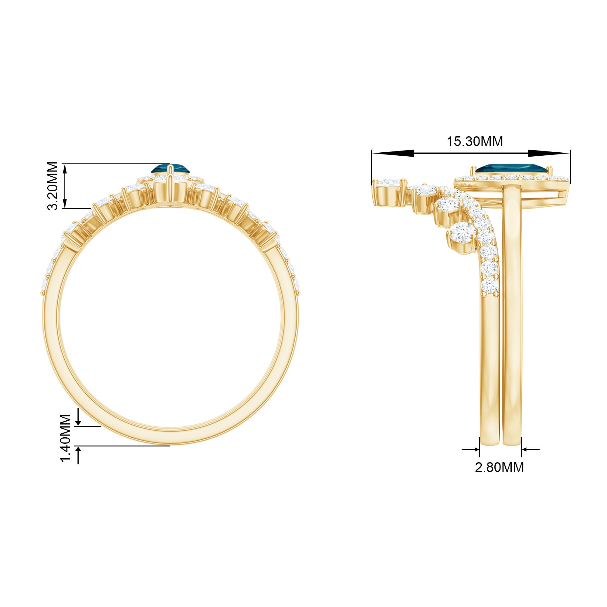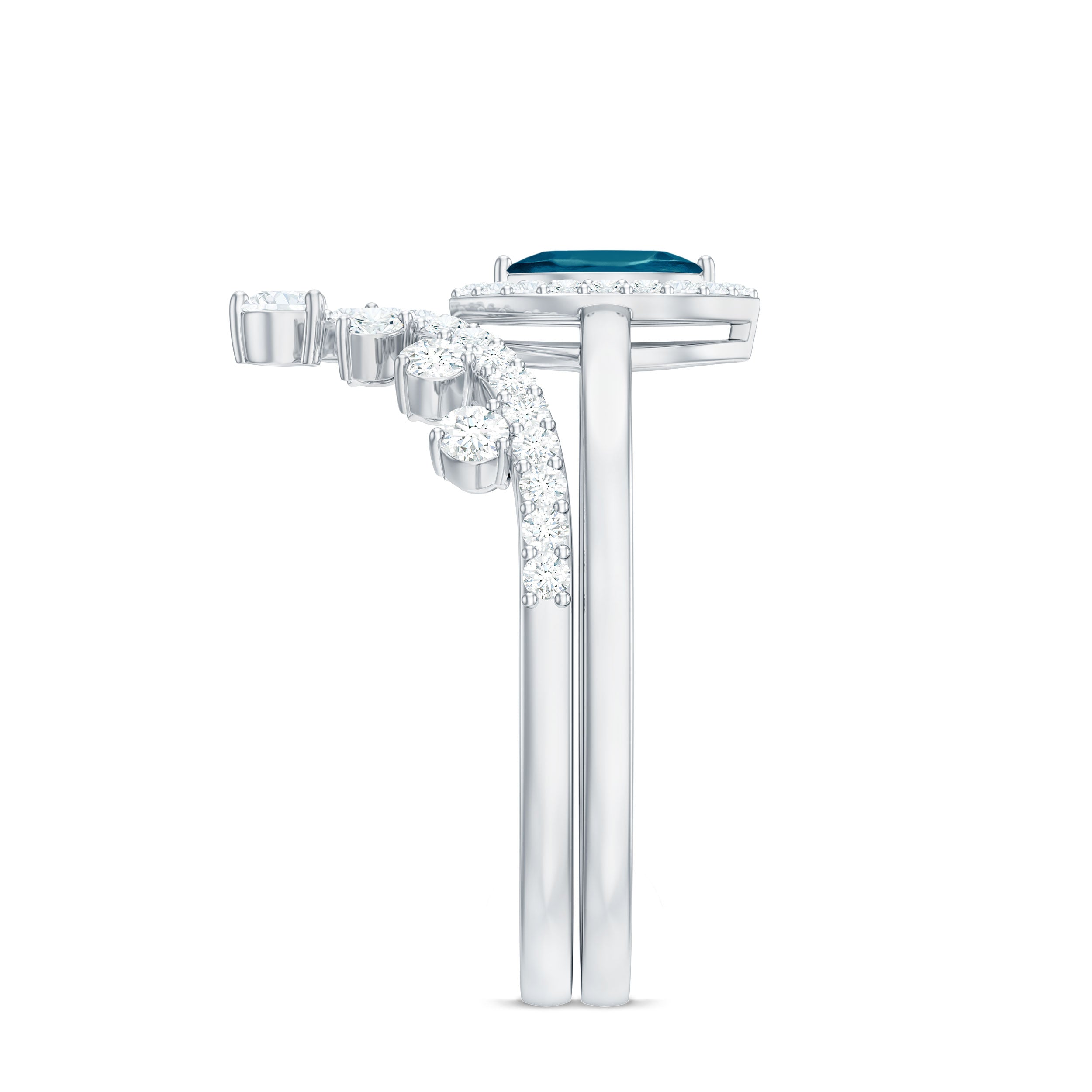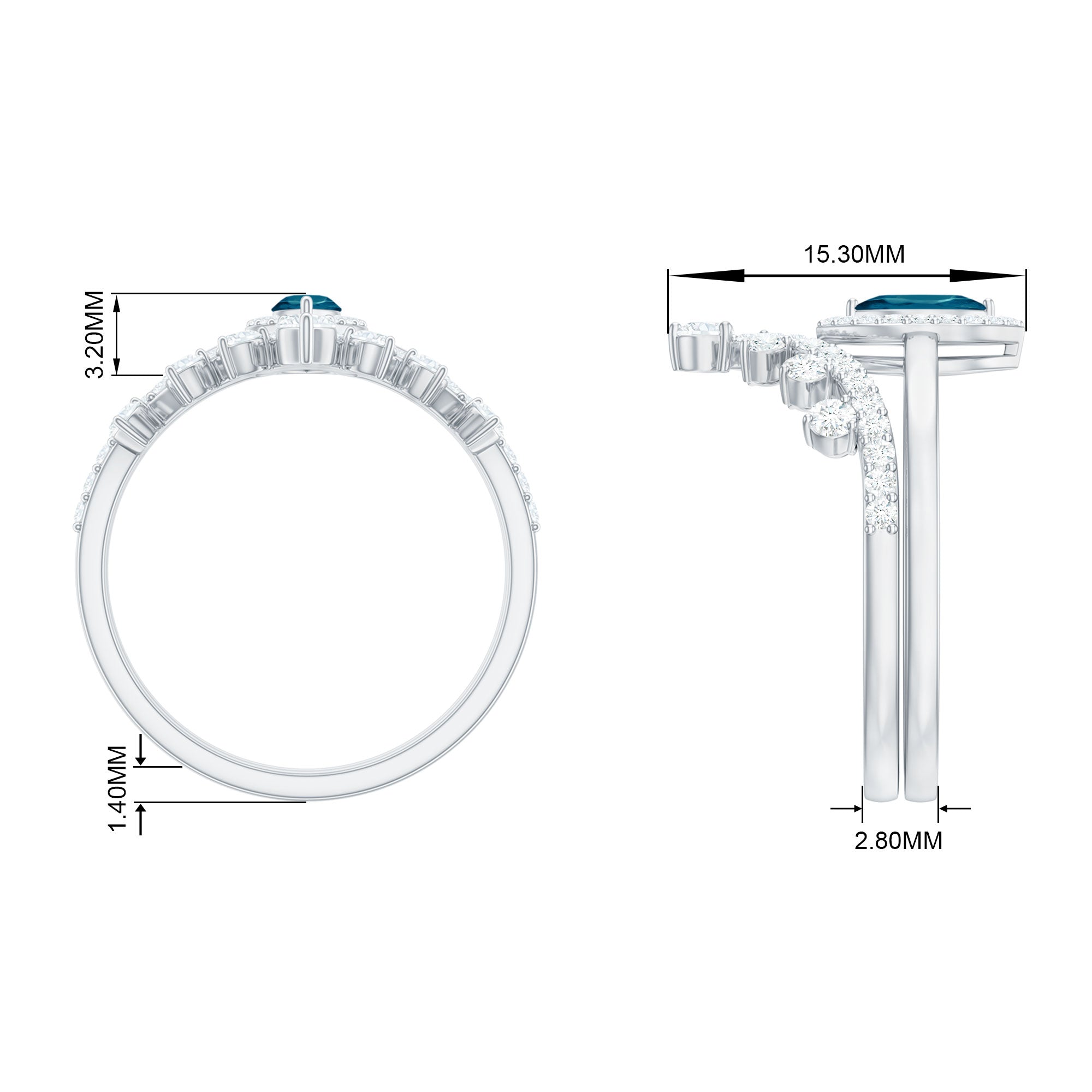 Illuminate your forever with an exquisite blend of contemporary brilliance and timeless elegance. This sophisticated Blue Topaz Bridal Ring Set features a halo engagement ring paired with a complementary chevron wedding band, meticulously crafted to honor love in an everlasting manner. At the heart of the engagement ring lies a stunning 3X6 MM marquise cut London Blue Topaz, celebrated for its striking silhouette and luminous sparkle. Encircled by a delicate halo of round Diamond stones, the central gem glimmers from every perspective, producing a refined and radiant appearance. The accompanying chevron wedding band gracefully wraps around the engagement ring, introducing a modern flair. It is also embellished with petite round Diamond stones, enhancing the Halo Bridal Set with a beautifully layered and polished aesthetic. Carefully crafted with precision and meticulous attention to detail, this Marquise Wedding Ring Set merges breathtaking design. Offered in US ring sizes 3 to 13, this Engagement Ring and Wedding Band Set is designed for comfort and to accommodate a range of styles. Whether you are preparing for a proposal or seeking a heartfelt anniversary present, the rings come presented in an elegant jewelry box, ready to be cherished for many years ahead.