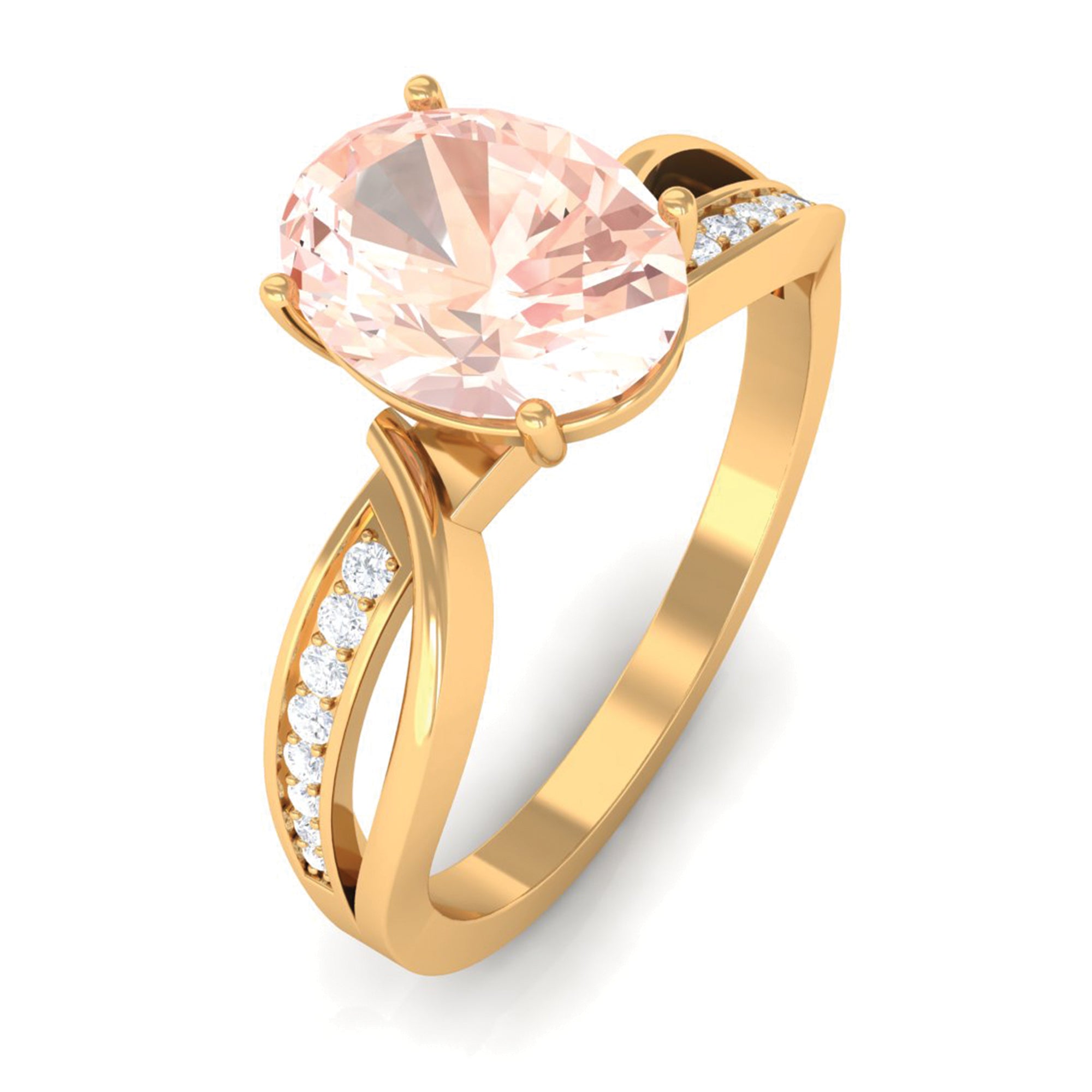 Morganite Engagement Ring is crafted in Gold, embellished with round Diamond side stones to give this ring a perfect look. The Oval Cut Morganite is held in 4 Prong Setting for a better and secure look. This Morganite and Diamond Engagement Ring has an exquisite Infinity Shank, make this ring perfect for your lady.
