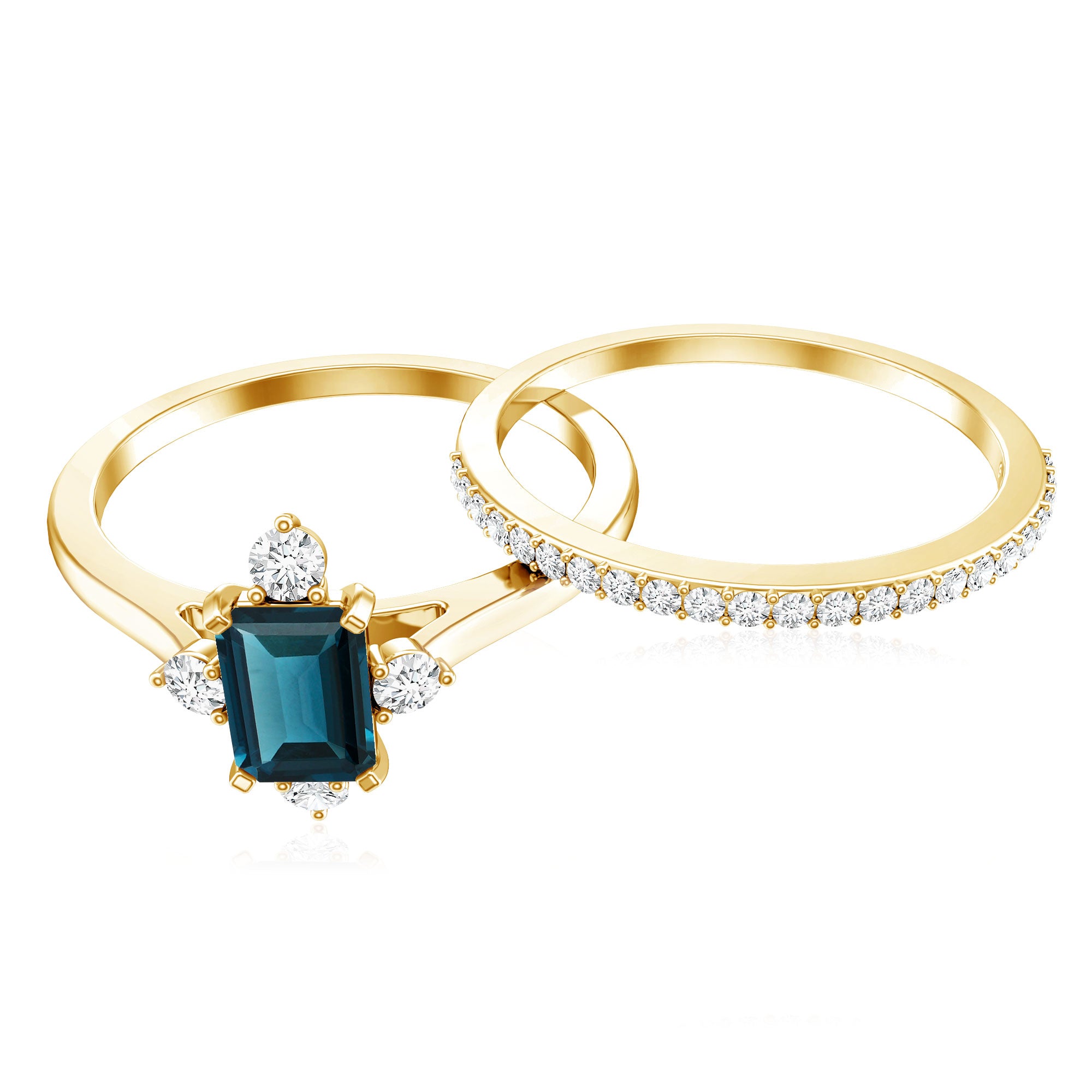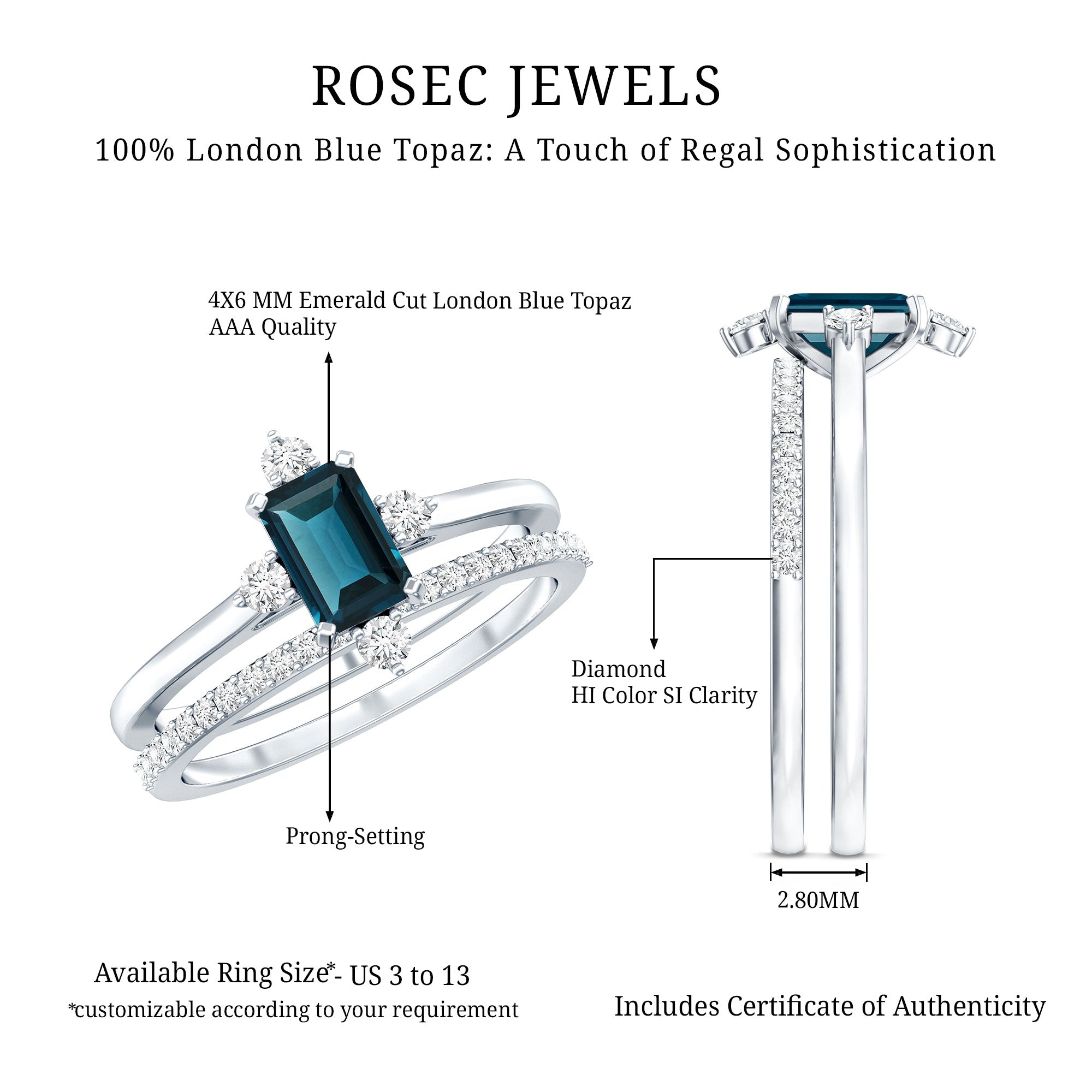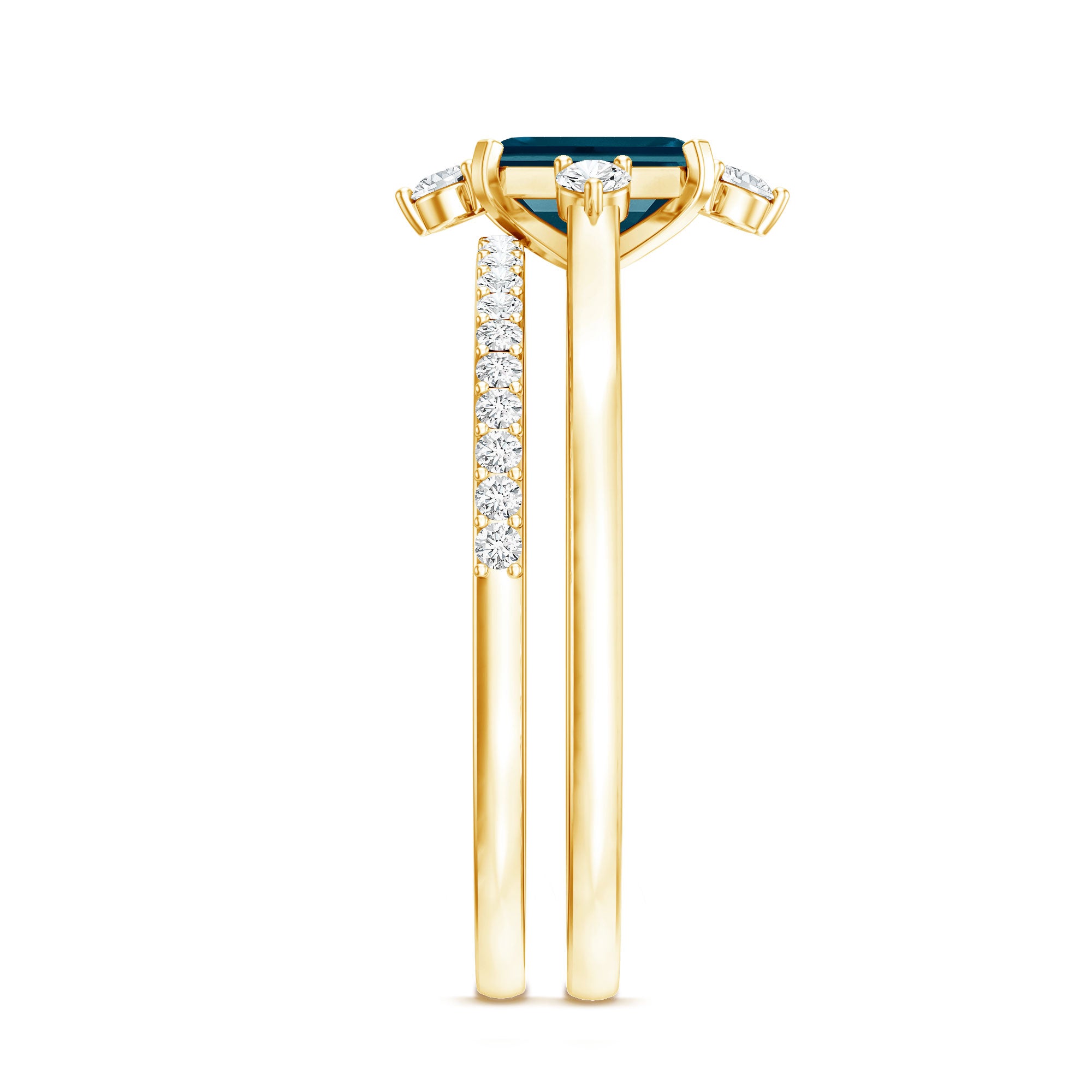Mark a meaningful chapter in your love story with this beautifully designed Blue Topaz Wedding Ring Set, crafted to reflect elegance, strength, and connection. At the heart of the engagement ring is a 4X6 MM emerald cut London Blue Topaz, held securely in a prong setting. The engagement ring is accented with sparkling round diamonds, offering a delicate contrast that enhances the center stone. Paired with this is a matching wedding band, designed to align perfectly and sit beside the engagement ring. The band features a row of round diamonds, adding extra brilliance and tying both pieces together in harmony. Whether worn as a Bridal Wedding Ring Set or separately, each ring carries its own charm and elegance. The sleek, stackable design ensures everyday comfort while maintaining a refined, graceful look. Crafted with AAA quality london blue topaz and HI-SI quality diamonds, the stones are hand-selected for their brilliance and quality. Available in US sizes 3 to 13, the London Blue Topaz Ring Set is made to fit comfortably and last through every moment. This piece comes packaged in an elegant jewelry box and includes a certificate of authenticity for added confidence. Timeless and modern all at once, this Engagement Ring with Wedding Band Set is a beautiful reminder of the bond you share and the future you are building together.