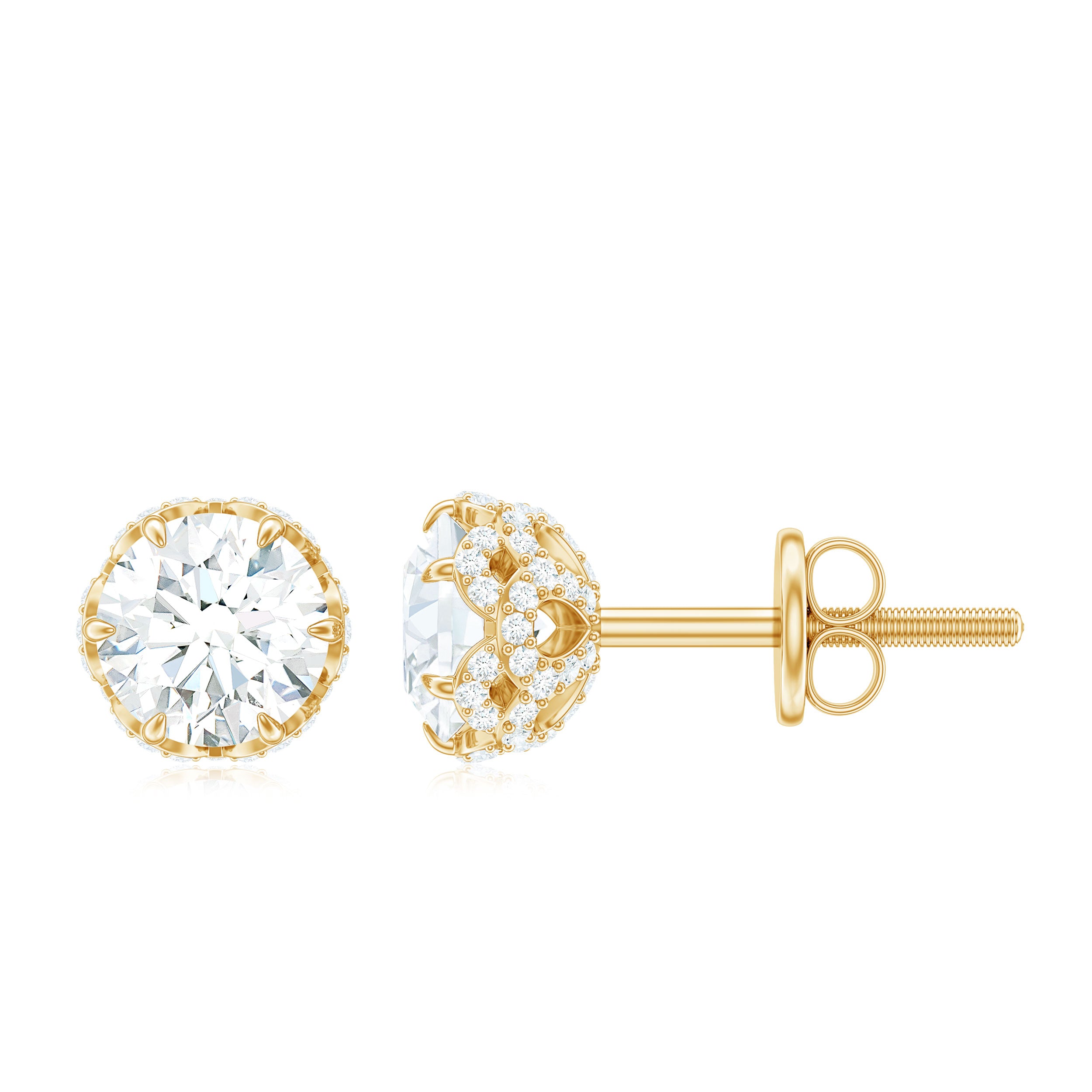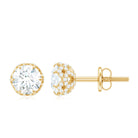 Celebrate your big day by wearing these beautiful Solitaire Stud Earrings and make your evening memorable. These Decorative Stud Earrings are perfectly adorned with Round Cut Moissanite set as Solitaire in a Prong Setting and also Round Cut Moissanite set in a Decorative Setting.