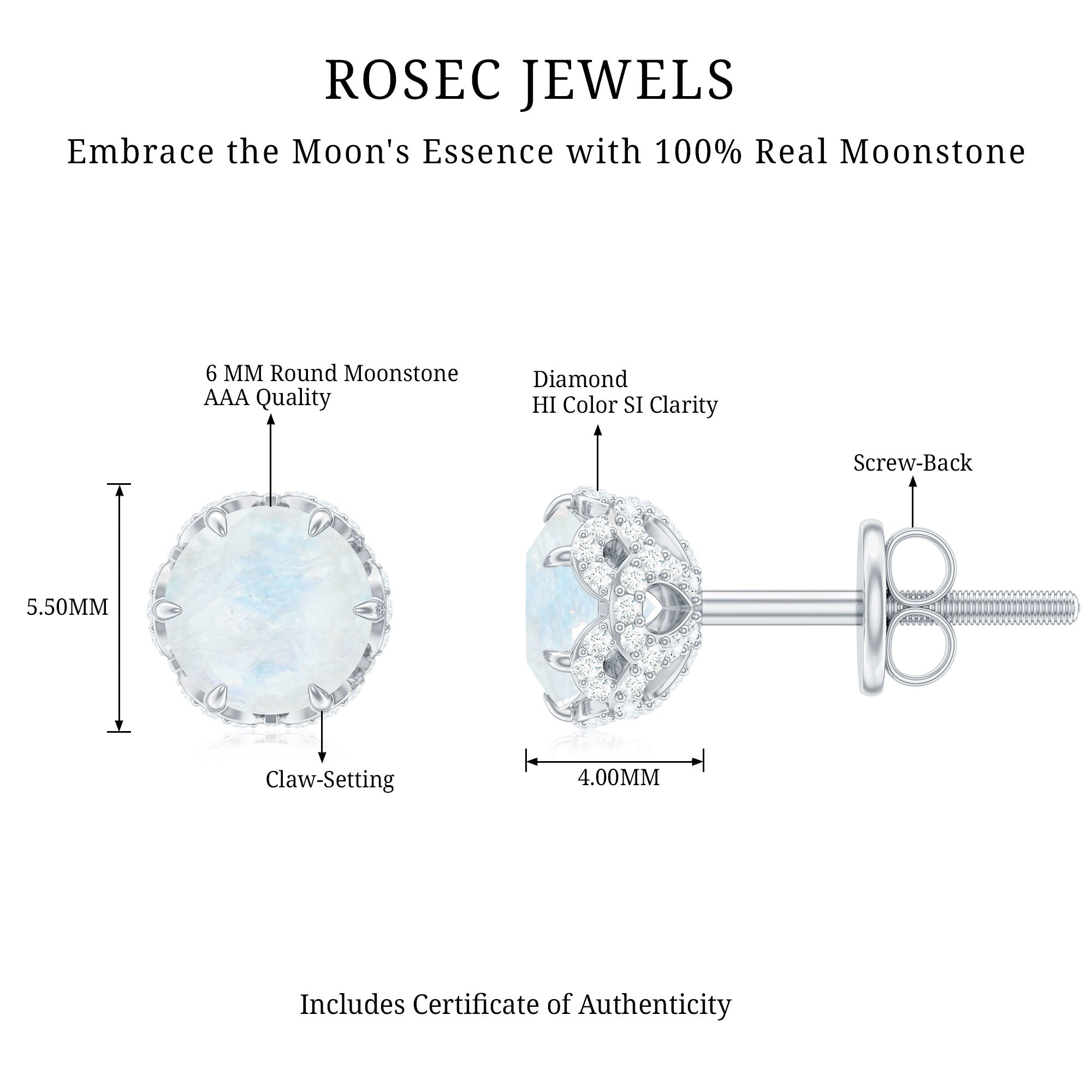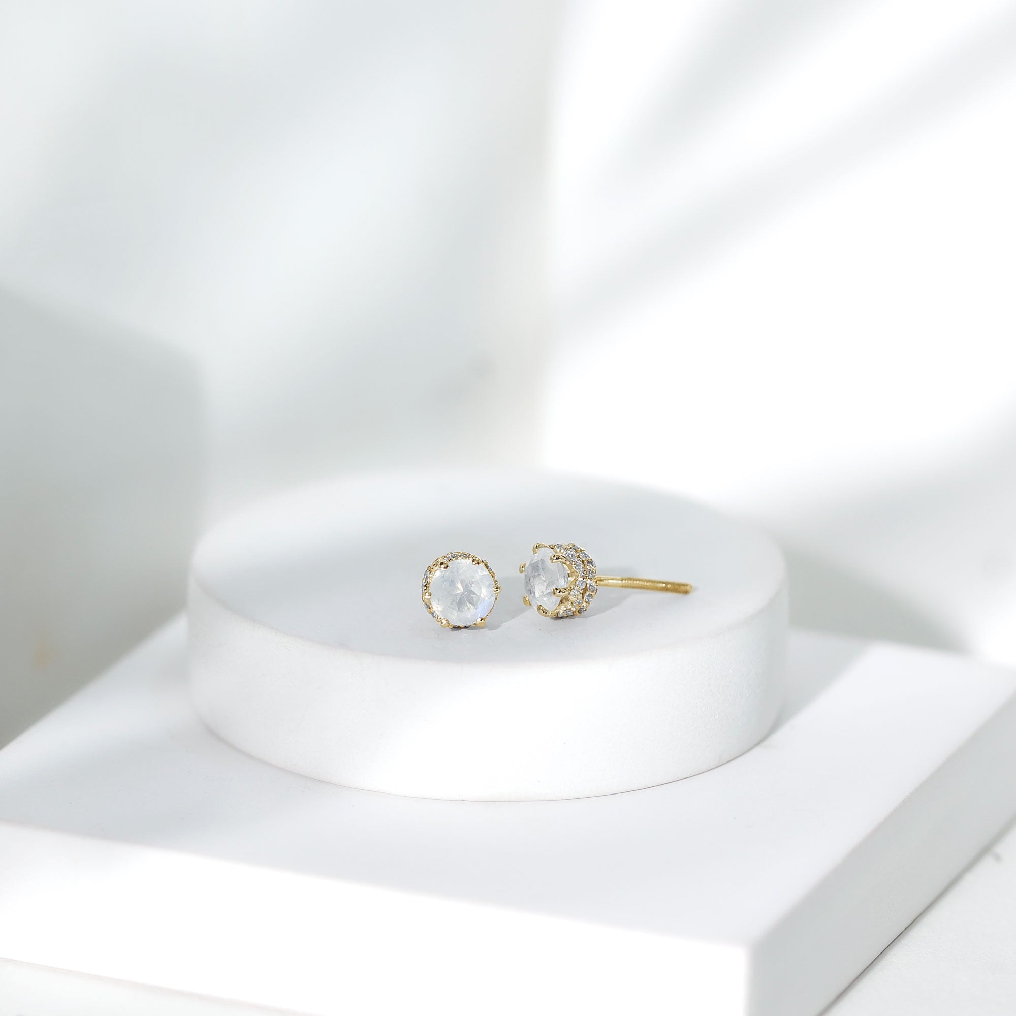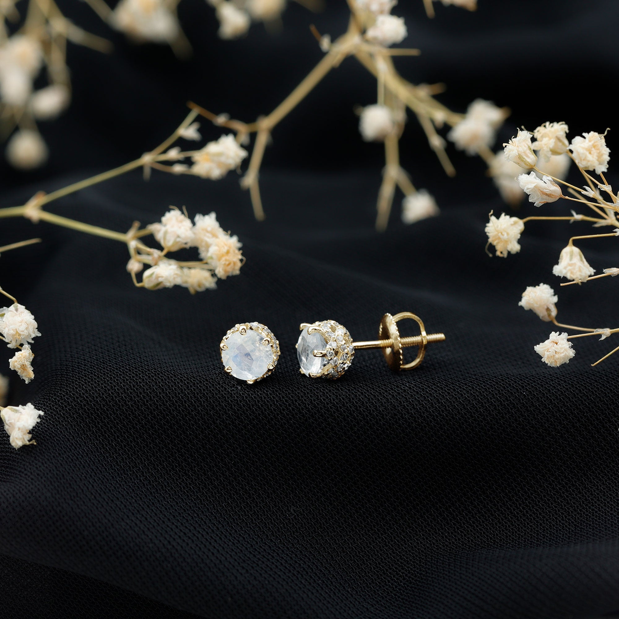 Enhance your Beauty with these Solitaire Stud Earrings embellished with Round Shape Moonstone set as Solitaire in Claw Setting and round shape Diamond set in Decorative Setting.