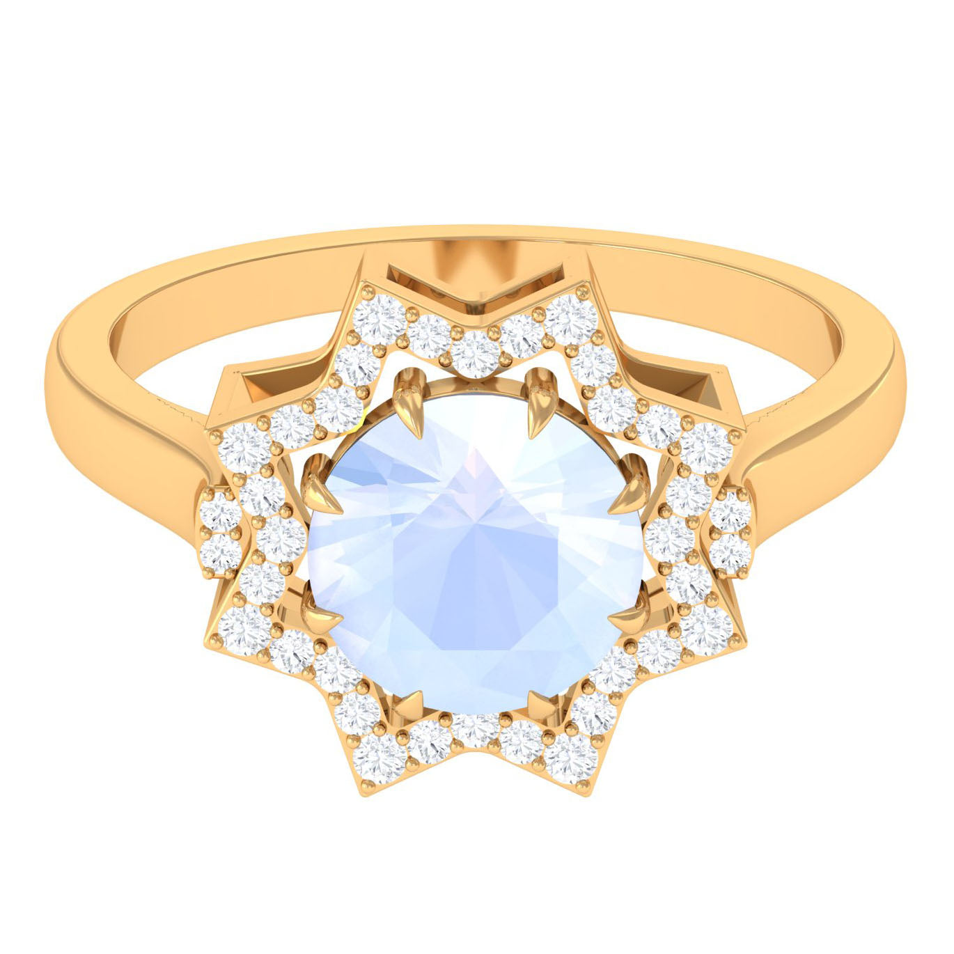 Shine like a star in our Moonstone Engagement Ring featuring Round Shape Moonstone in Claw Setting with Diamond creating a star shape all the center gemstone. This Statement Engagement Ring is adorned in Gold and is the perfect excuse for you to spoil your favorite women. This delicate and timeless Moonstone Jewelry is the perfect symbol of your love.