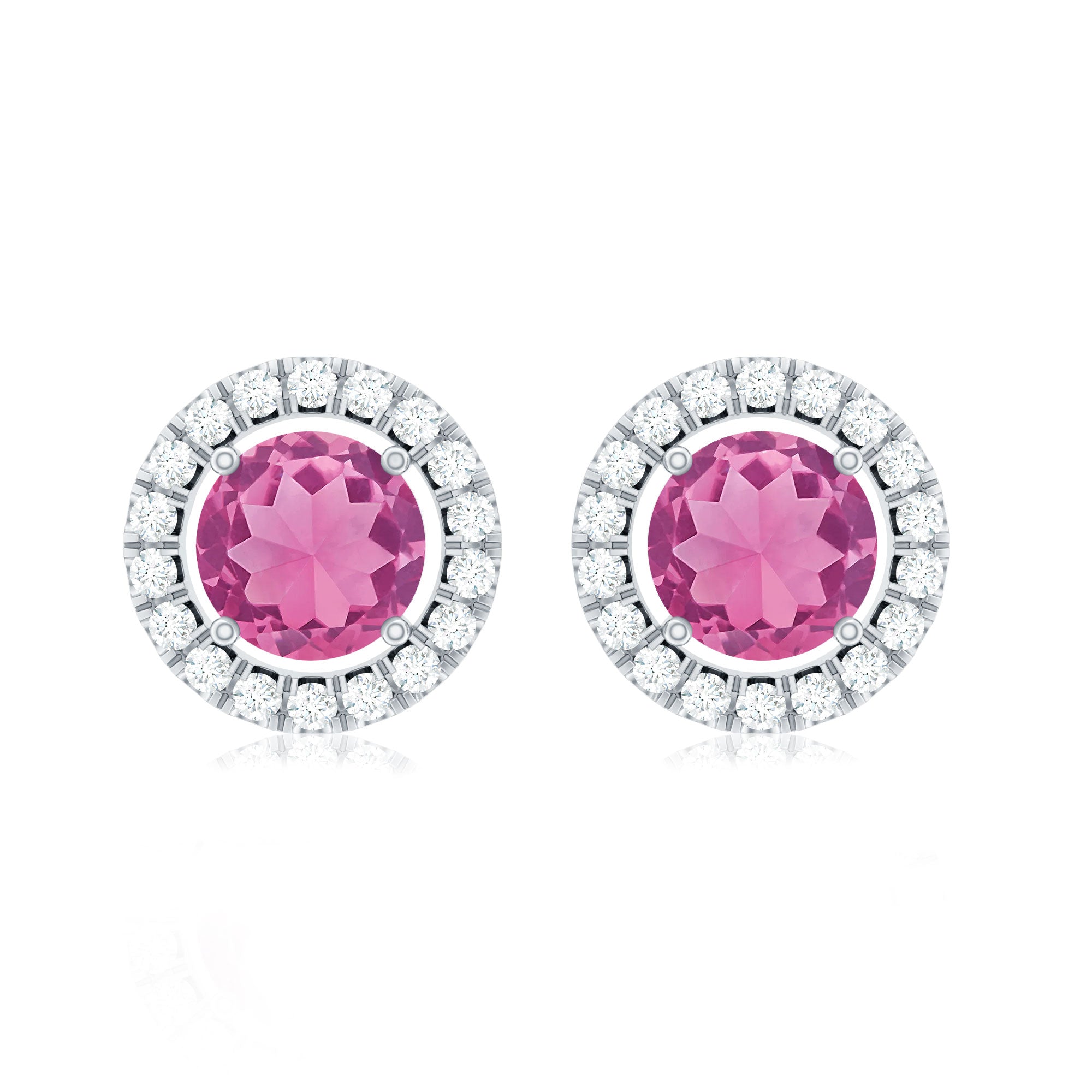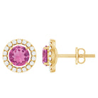 Express your love to your loved one on Valentines Day by presenting this Stud Earrings. These Earrings are perfectly composed of Solid Gold and adorned with Round Shape Pink Tourmaline in Prong Setting with Diamond Halo.