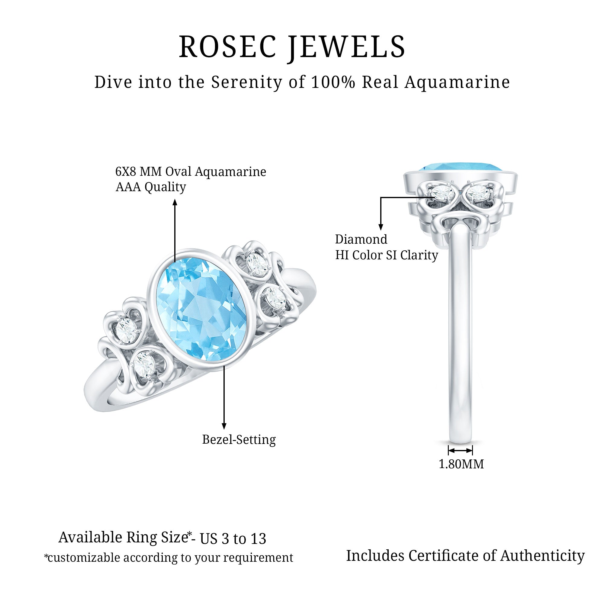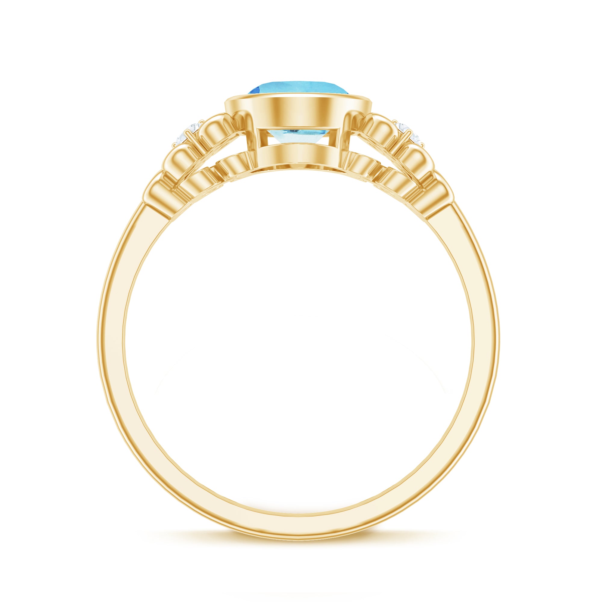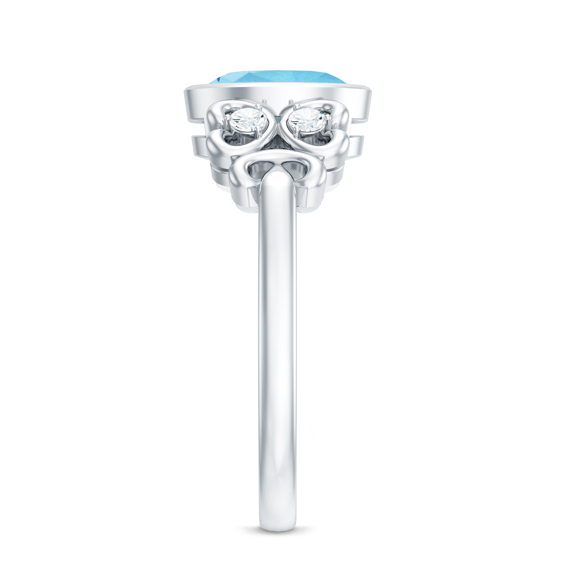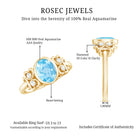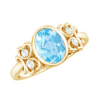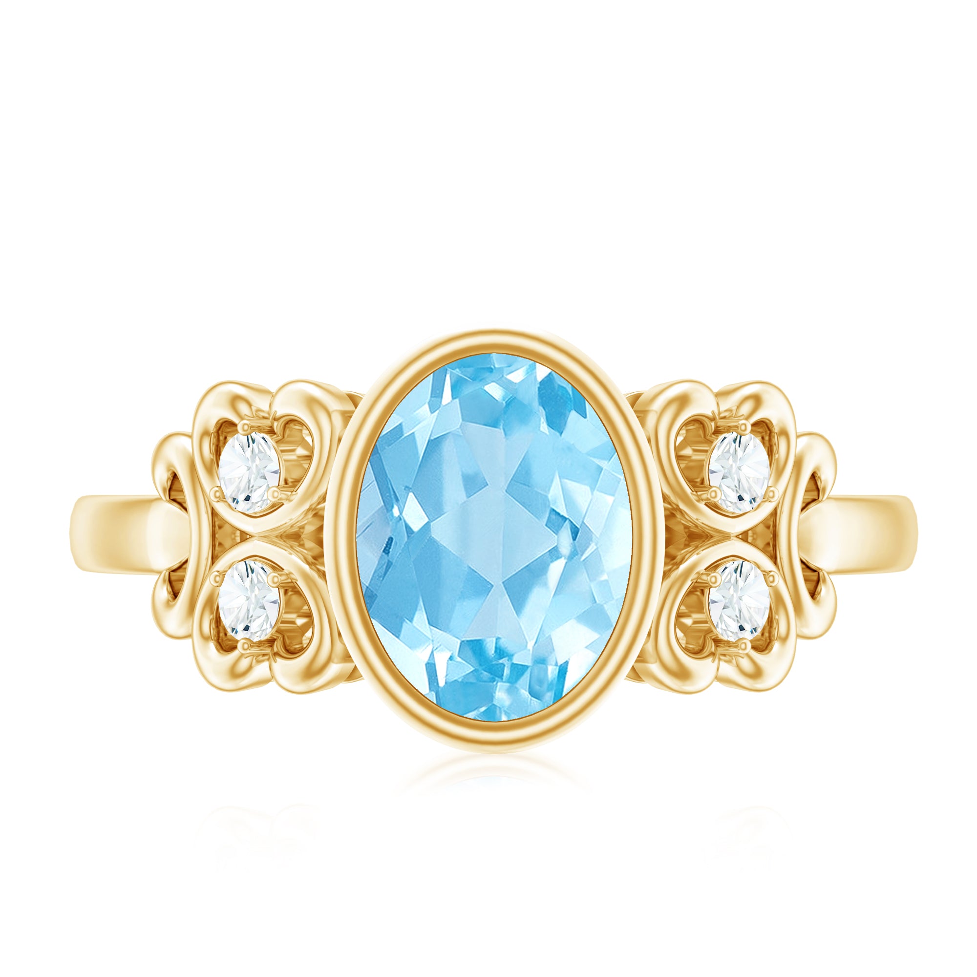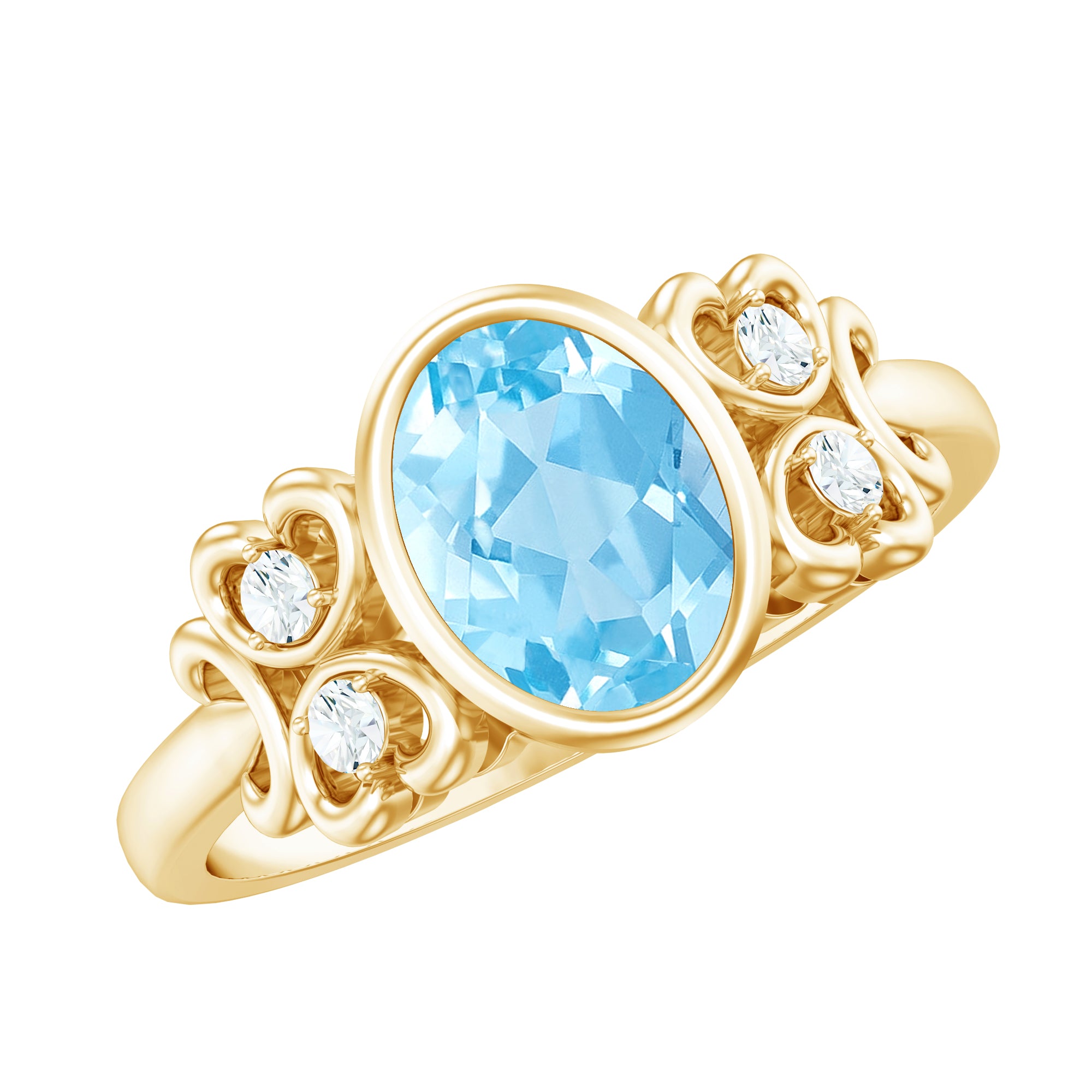 Intricate scrolls are a unique aspect of vintage designs, it make this Aquamarine Engagement Ring an alluring Statement Ring too. The Oval Shape Aquamarine is set in Bezel Setting, give this ring a subtle look, embellished with Round Diamond. Get this Aquamarine Solitaire Ring for your lady and impress her with your choice.