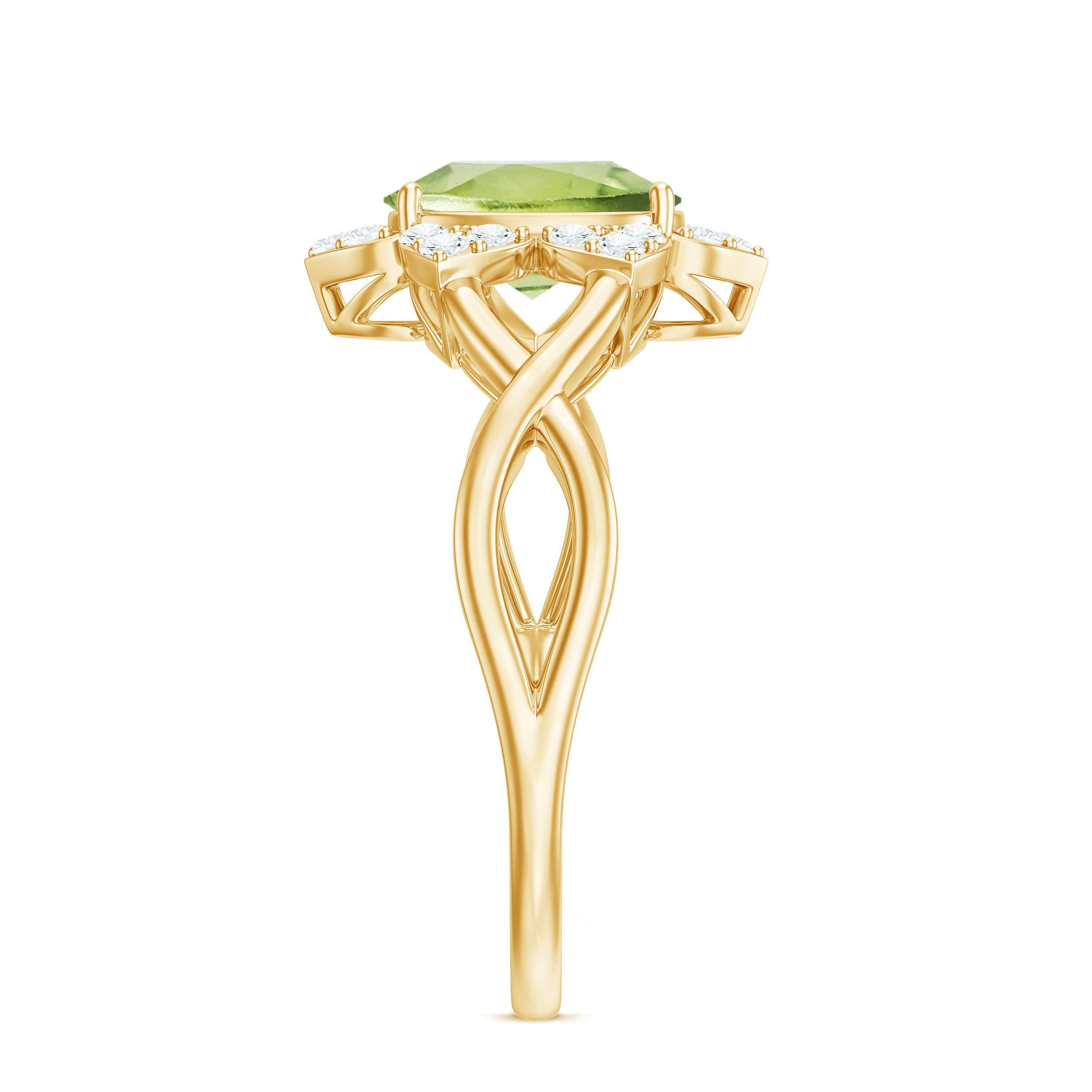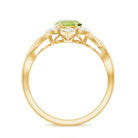 Put this shining Flower Ring on to create a stylish look. This elegant Peridot Solitaire Ring is embellished with Oval Cut Peridot in Prong Setting and Diamond Accent. This Peridot Stone Ring is crafted with Gold and will give you a luxurious appearance. This Peridot and Diamond Ring will be an adorable gift for your lovely wife to make her feel special.