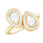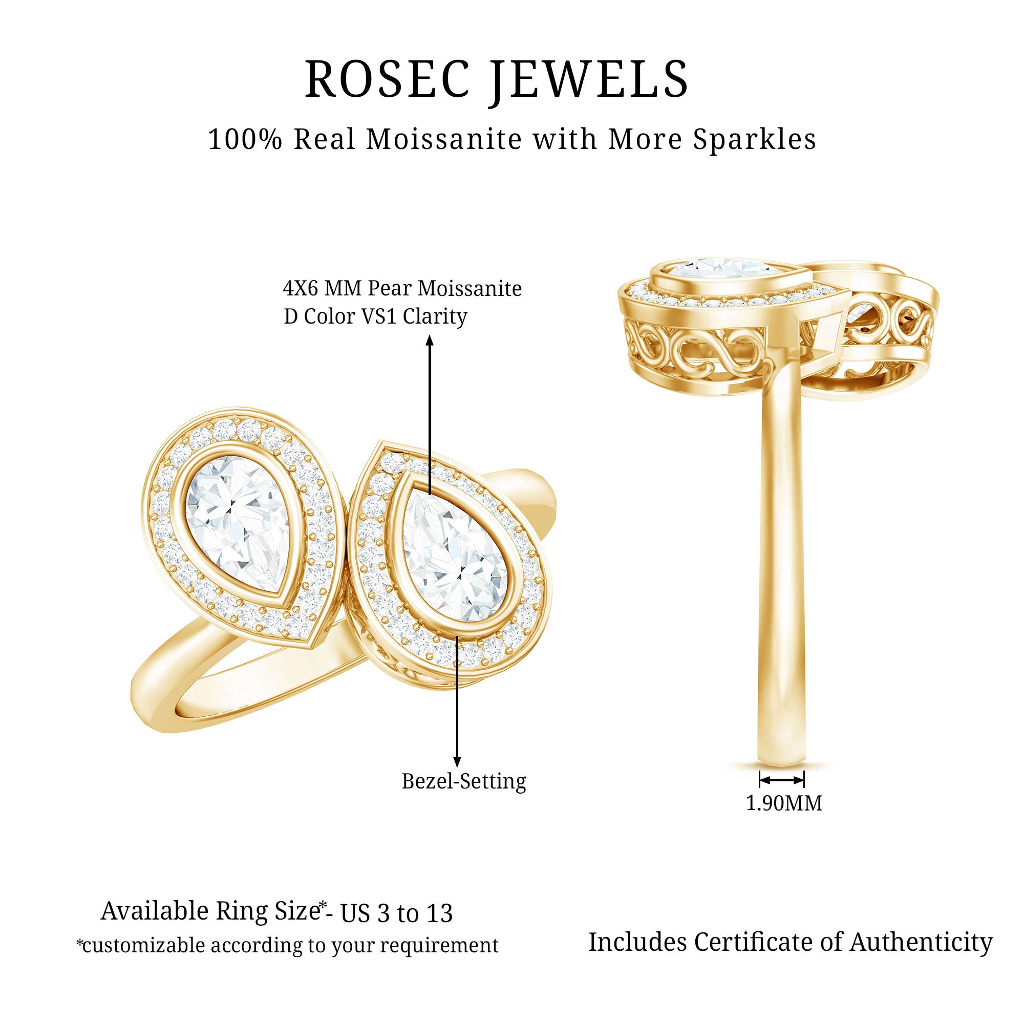 This beautiful Two Stone Engagement Ring, is a romantic and symbolic design that represents You and Me - two souls, two hearts, and one love. With its unique styling and radiant sparkle, this Toi Et Moi Ring makes a bold yet meaningful statement for engagements, proposals, or personal milestones. At the center of the design are two 4X6 MM pear shaped moissanite stones set in bezel setting. These stunning center stones are D color and VS1 clarity, offering the same brilliance and fire as a diamond but in a more sustainable and affordable way. Surrounding each pear shaped stone is a halo of round moissanite stones, adding extra sparkle and making the center stones appear even larger. This Pear Moissanite Engagement Ring also fits beautifully into the cocktail ring category, making it perfect for special events, evening wear, or moments when you want to feel extra special. Whether you are gifting it to your partner, wife, fiancee, or any special lady, this Halo Engagement Ring is crafted to shine forever and celebrate your unique bond with style and grace.
