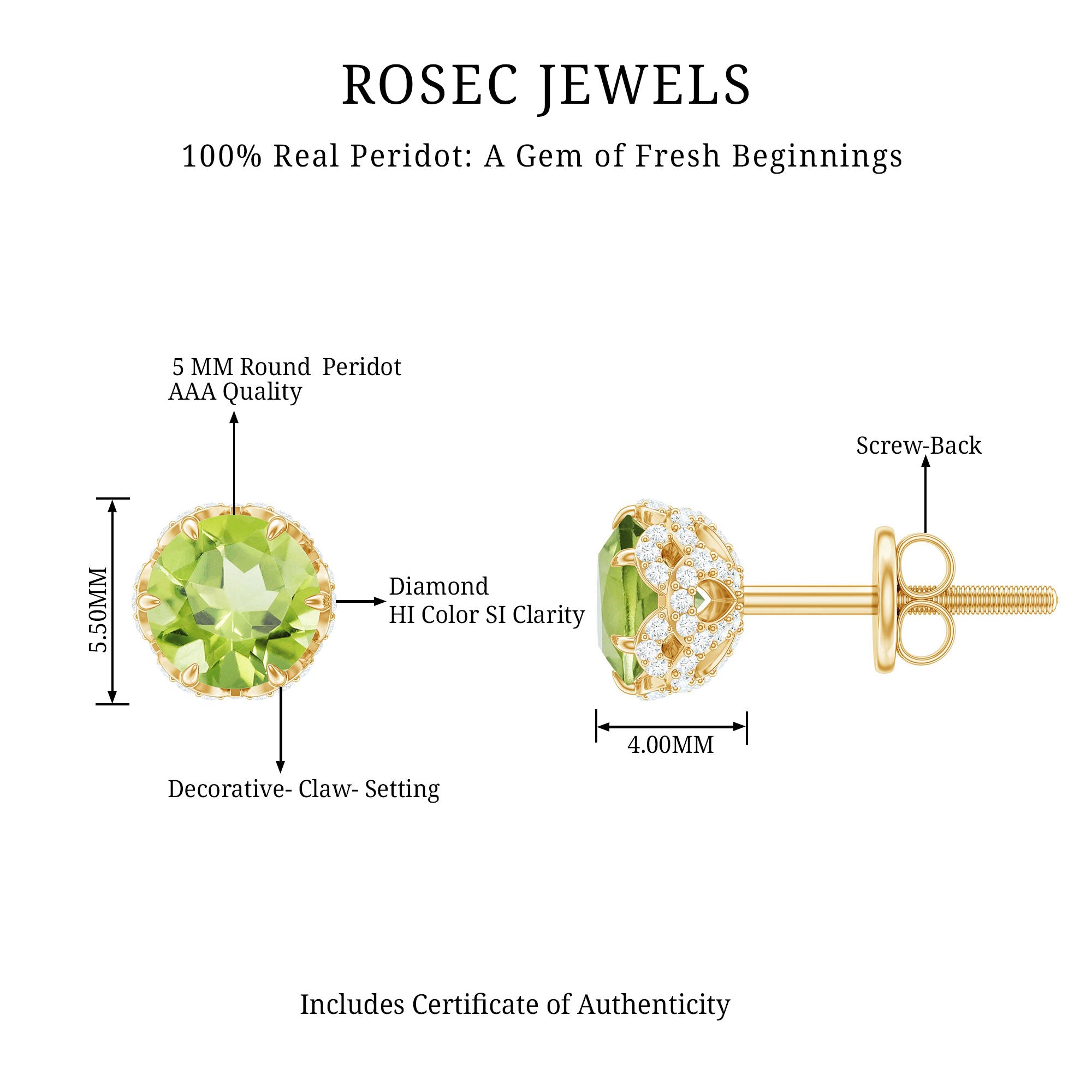 This Classic Stud Earring is embellished with Round Shape Peridot set as Solitaire and Diamond accent in Decorative Pattern.
