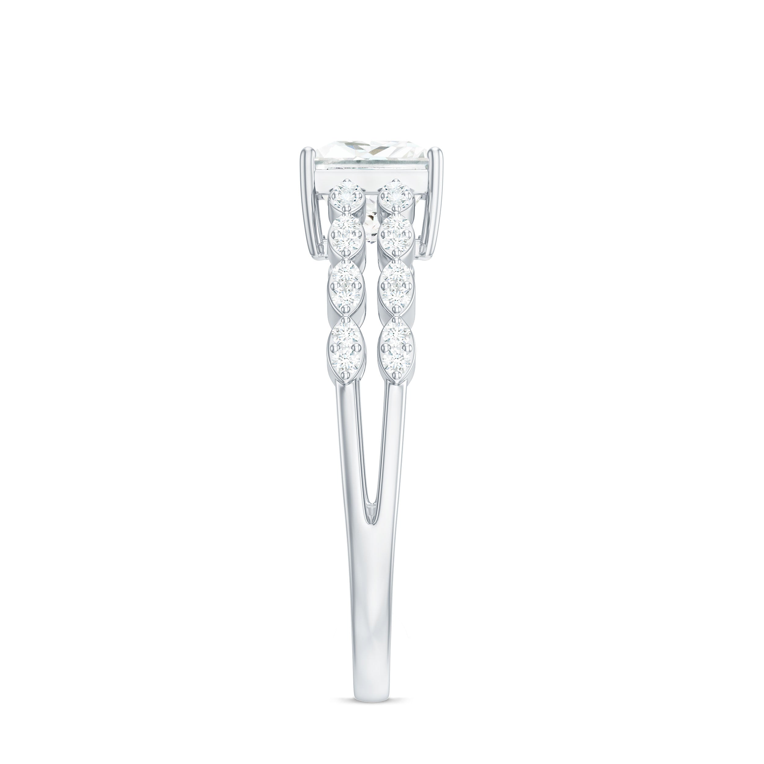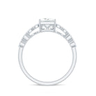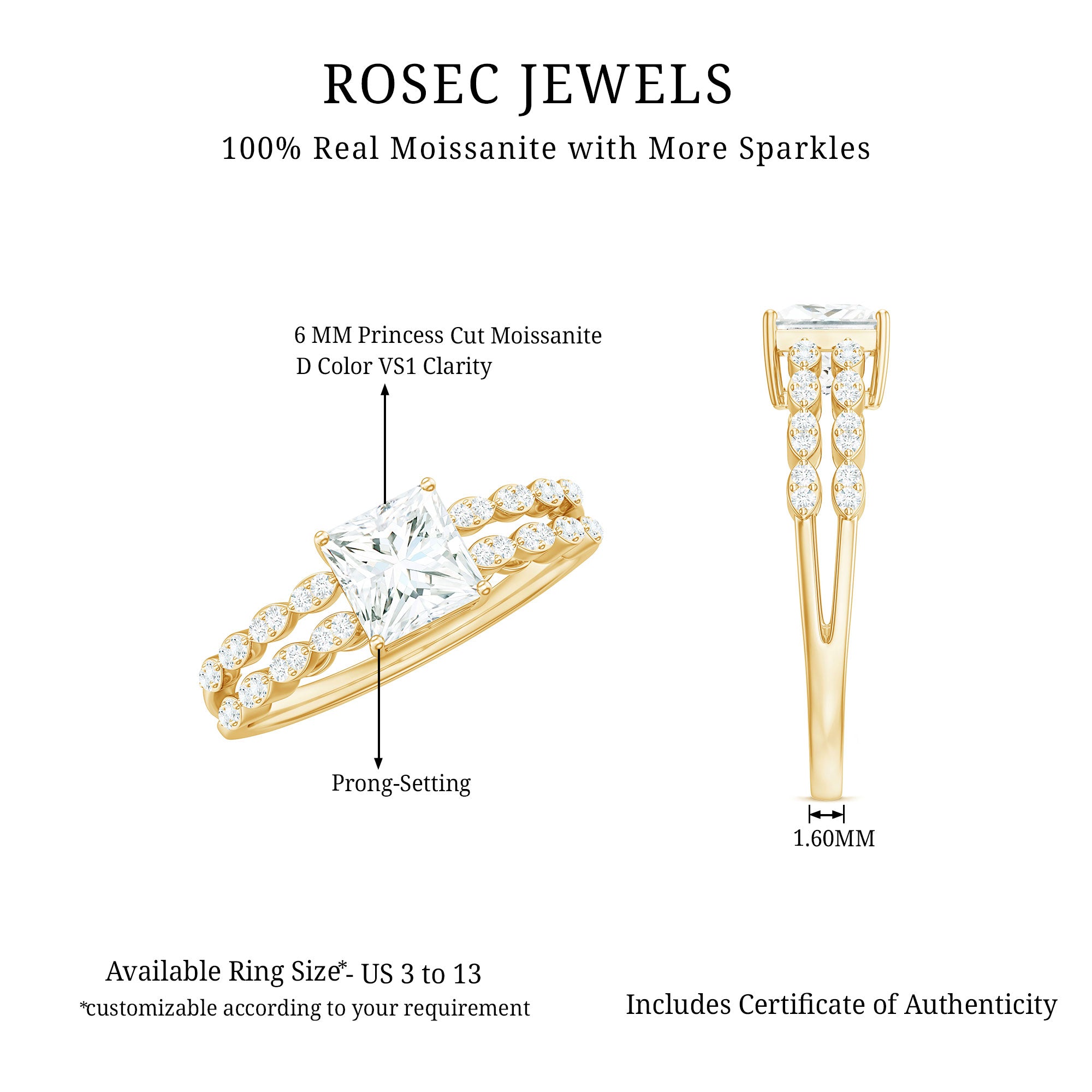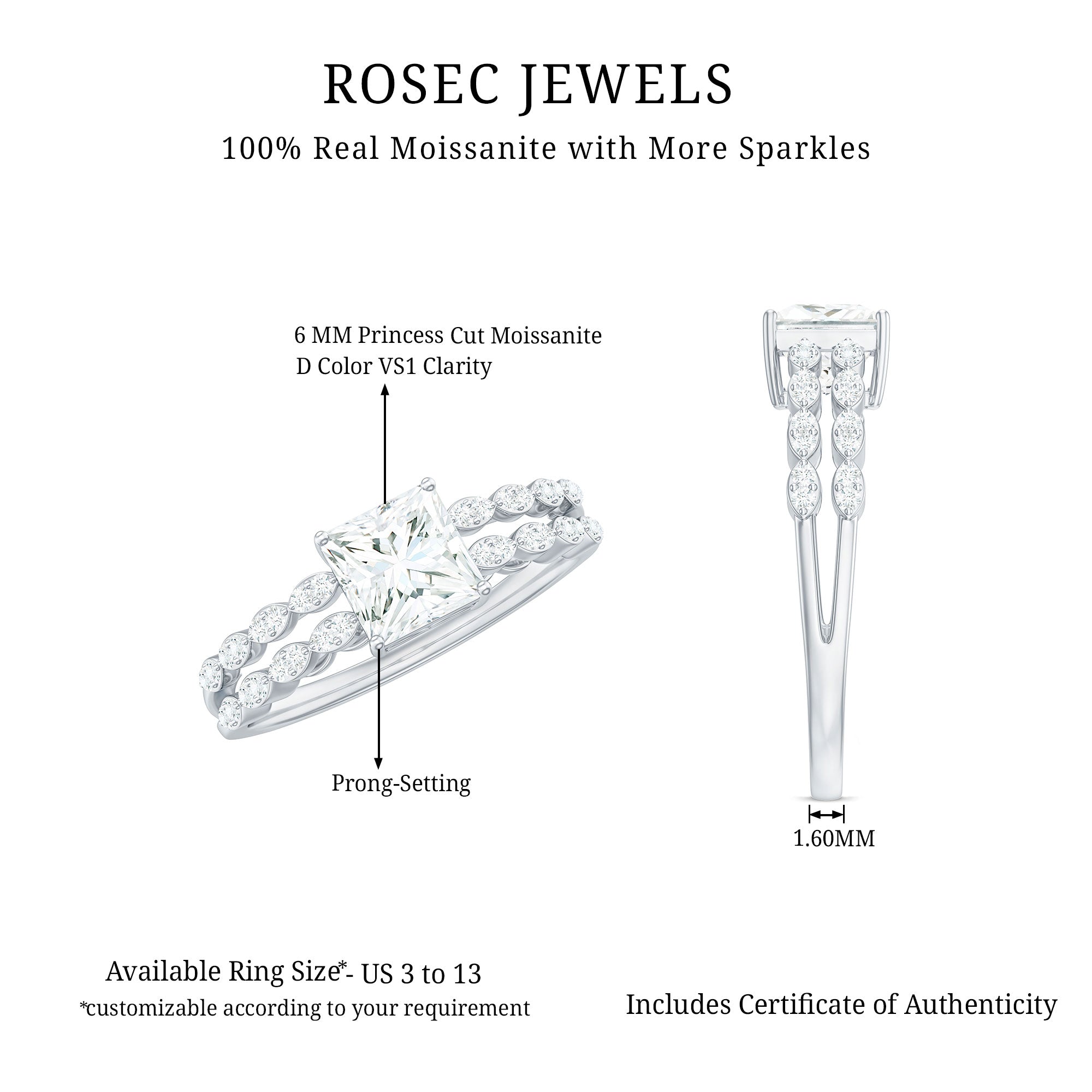 Win her heart with the stunning details of this Double Band Engagement Ring, featuring a 6 MM Princess Cut Moissanite (D-VS1 quality) securely set in prongs. The unique double band shank brings an artistic touch, adorned with round cut moissanite stones over metal marquise shapes, giving it a scalloped band appearance. Together, these elements in this Princess Cut Engagement Ring create the illusion of a stackable ring while providing the comfort of a single band. Designed to symbolize everlasting love, this Moissanite Engagement Ring is perfect for the bride who values elegance, individuality, and timeless beauty. This classic Square Engagement Ring beautifully narrates your unique love story, highlighting its lasting beauty and exceptional craftsmanship. Whether you want to make a bold statement with your engagement ring or simply seek a piece of jewelry that will always be in style, this ring is sure to make a memorable impact. Available in US ring sizes 3 to 13, and packaged in a beautiful gift box, this 1 Carat Moissanite Ring is ready to be treasured. For the woman who appreciates modern elegance with a hint of uniqueness, this ring brings timeless romance into today’s world - brilliantly.