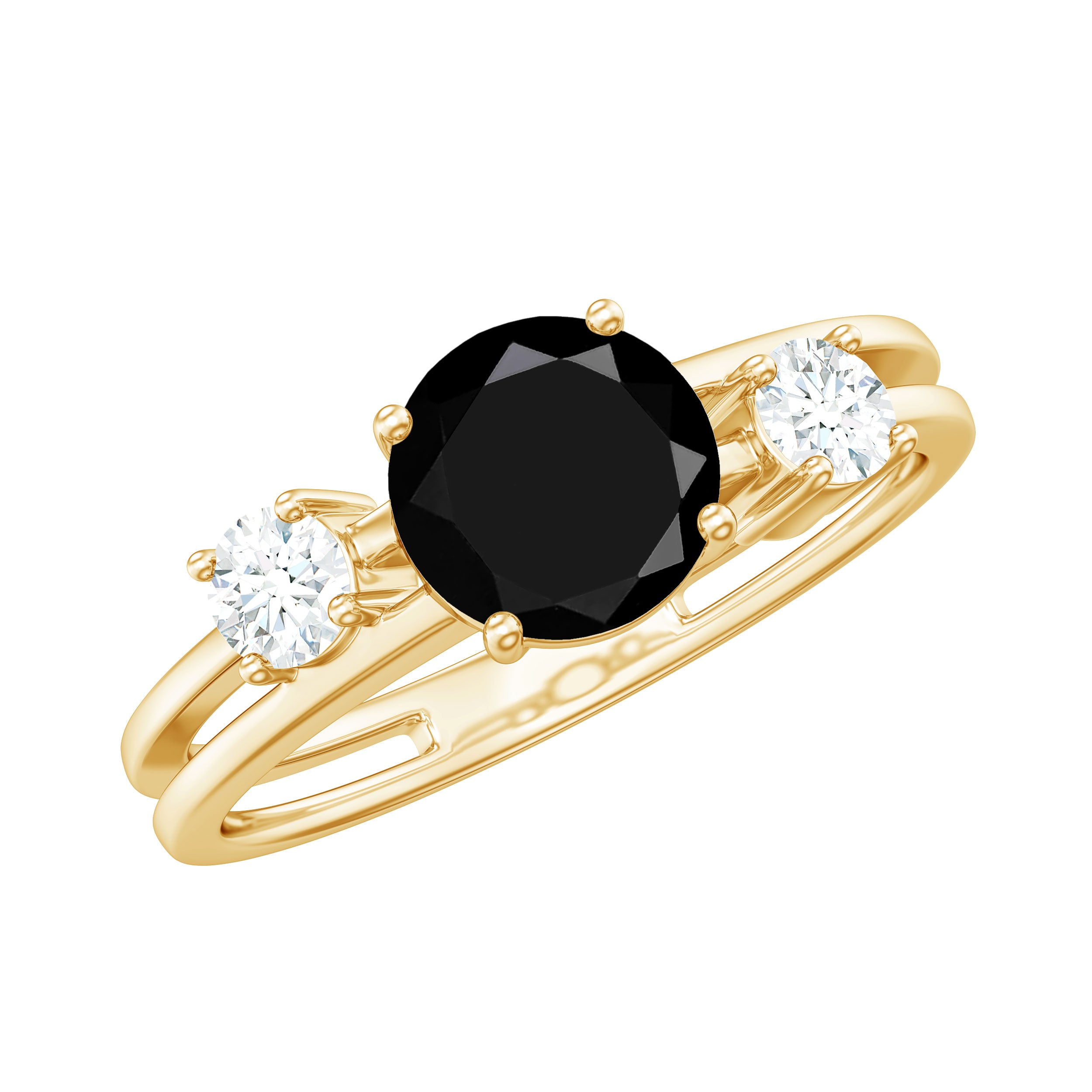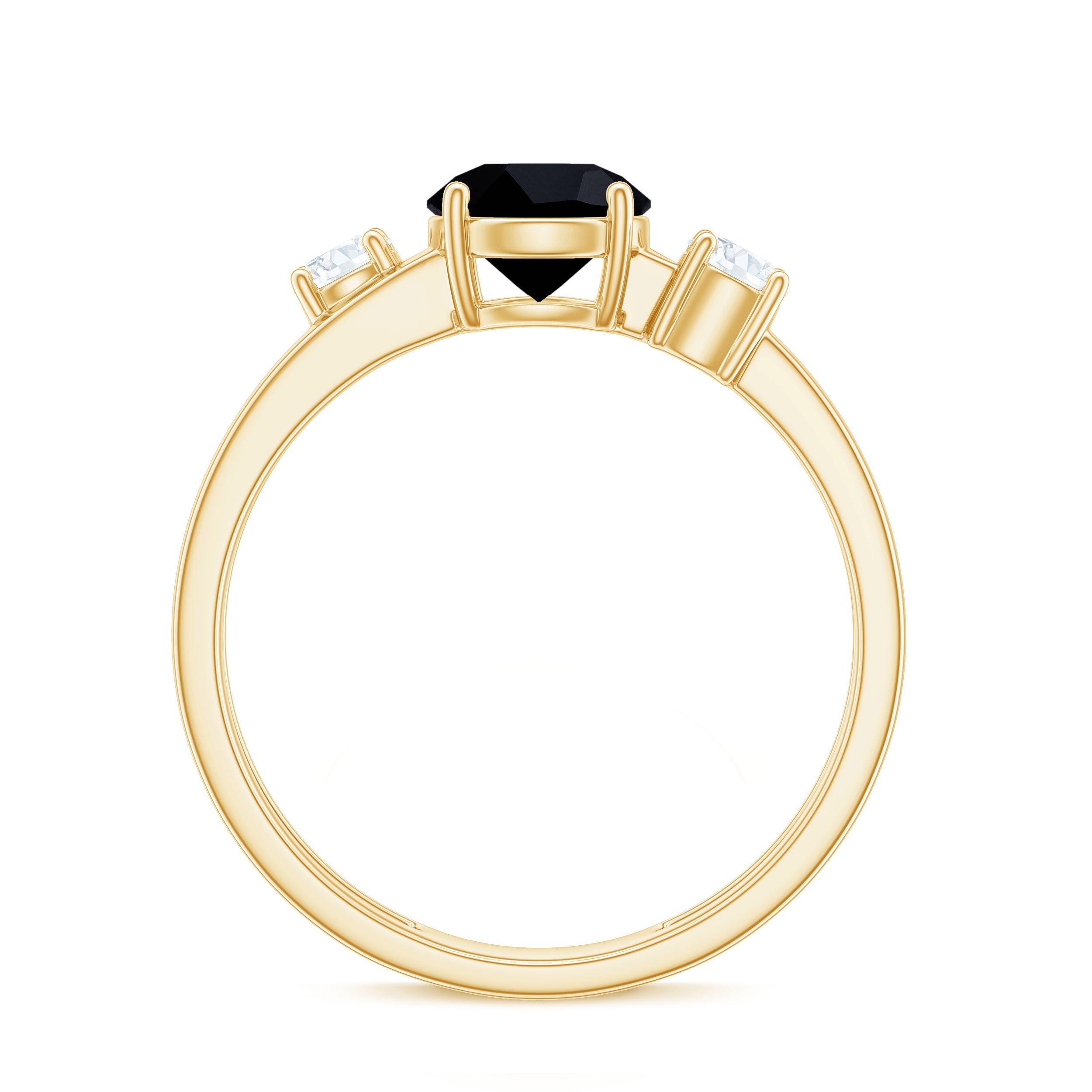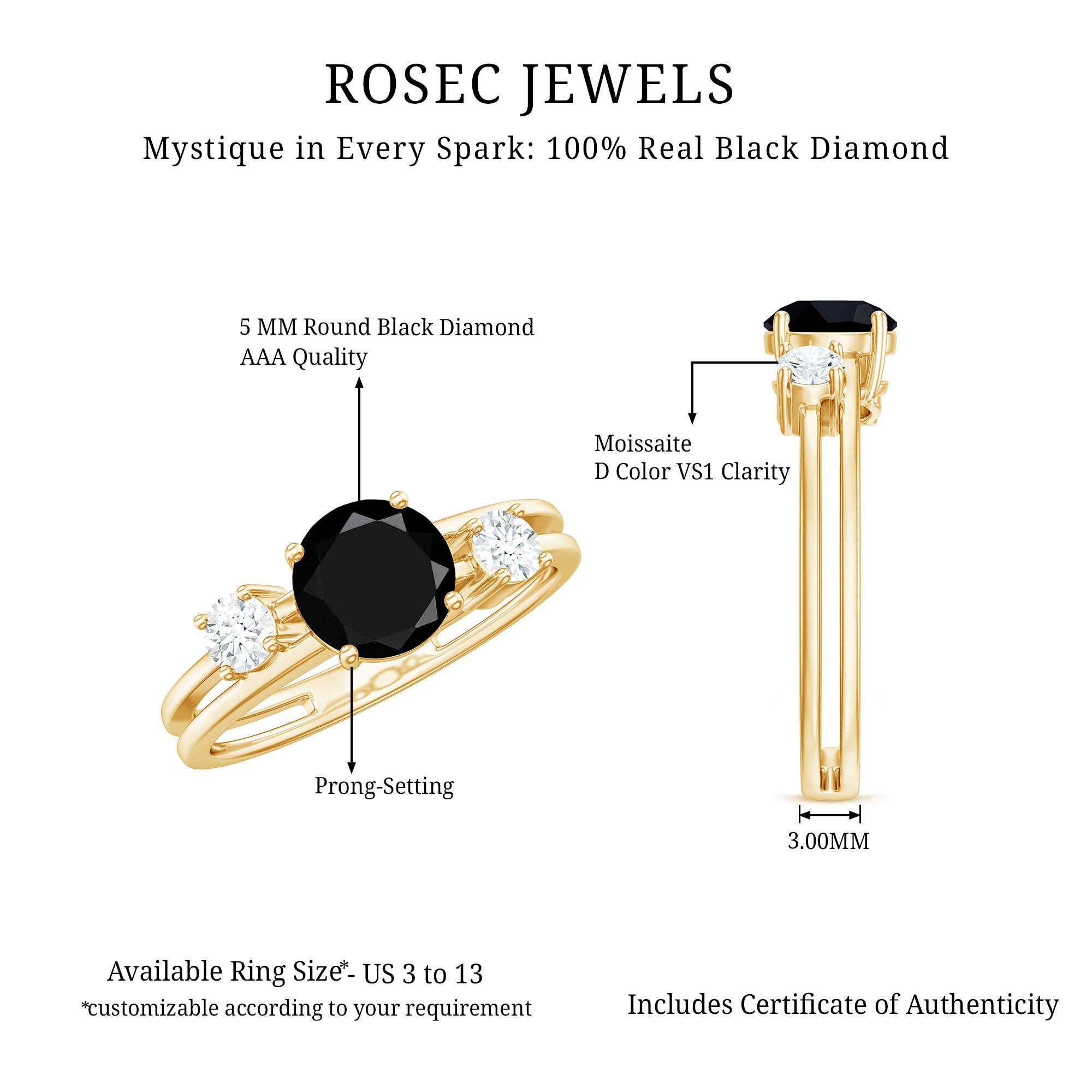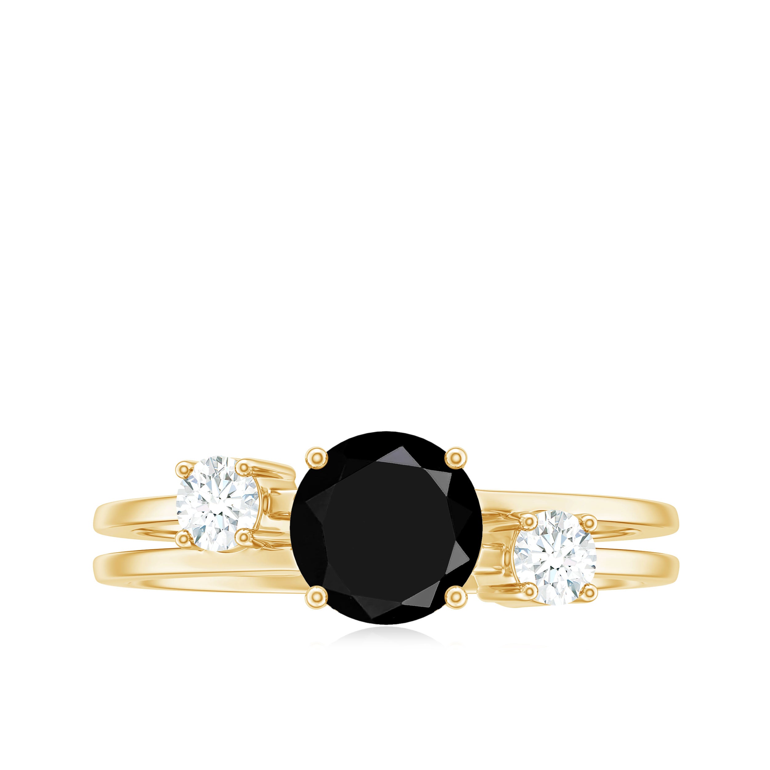 A double band ring should have two main elements: a distinguished look and a stone that makes a statement. The band is a stunning gold with a Round Cut Black Diamond at the center. Moissanite set on both band and adds natural sparkle around the ring.