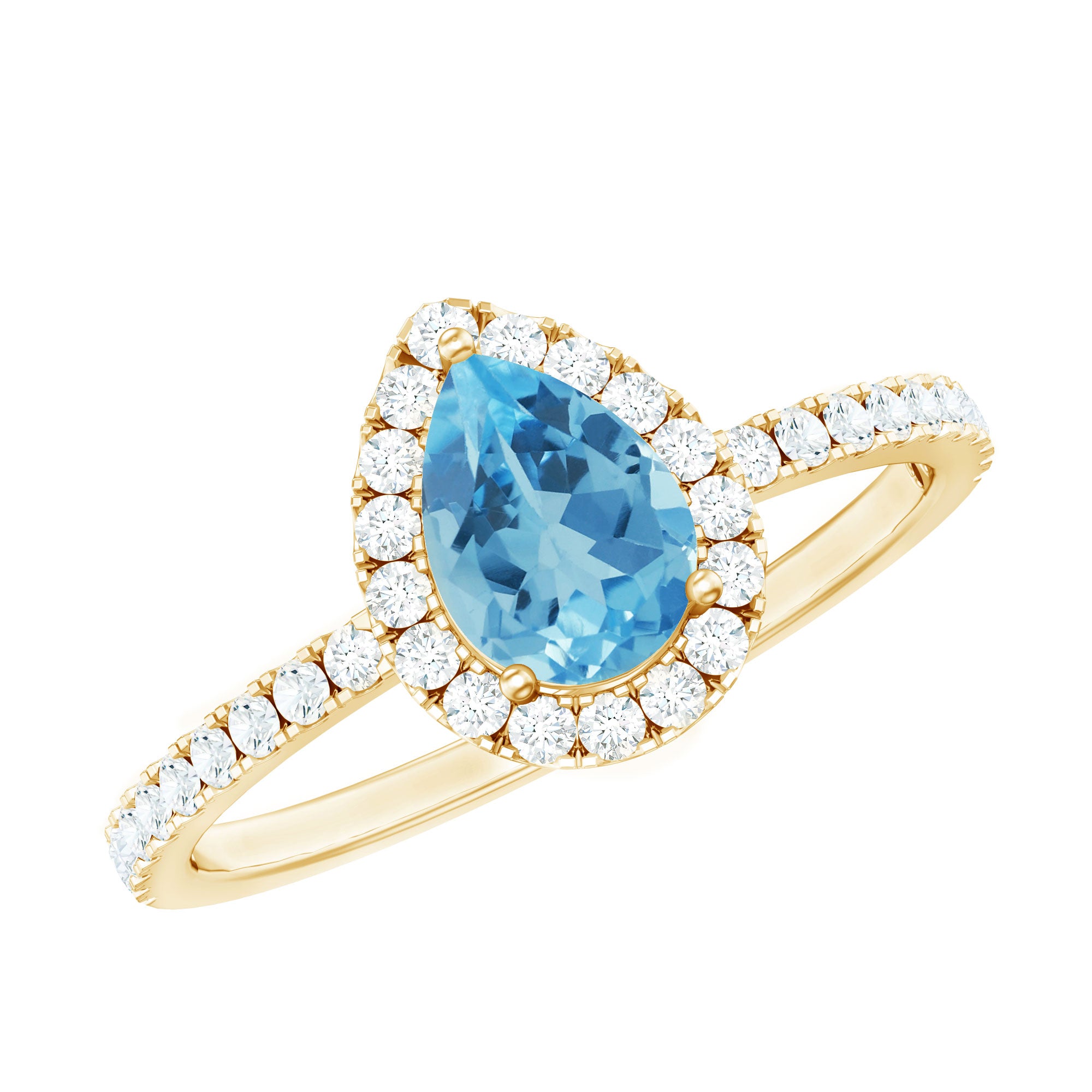 Known as a Halo Engagement Ring for Women in Gold, it consists of Round Shape Swiss Blue Topaz embellished in Prong Setting with Round Brilliant Diamond embellished in Pave Setting for you.