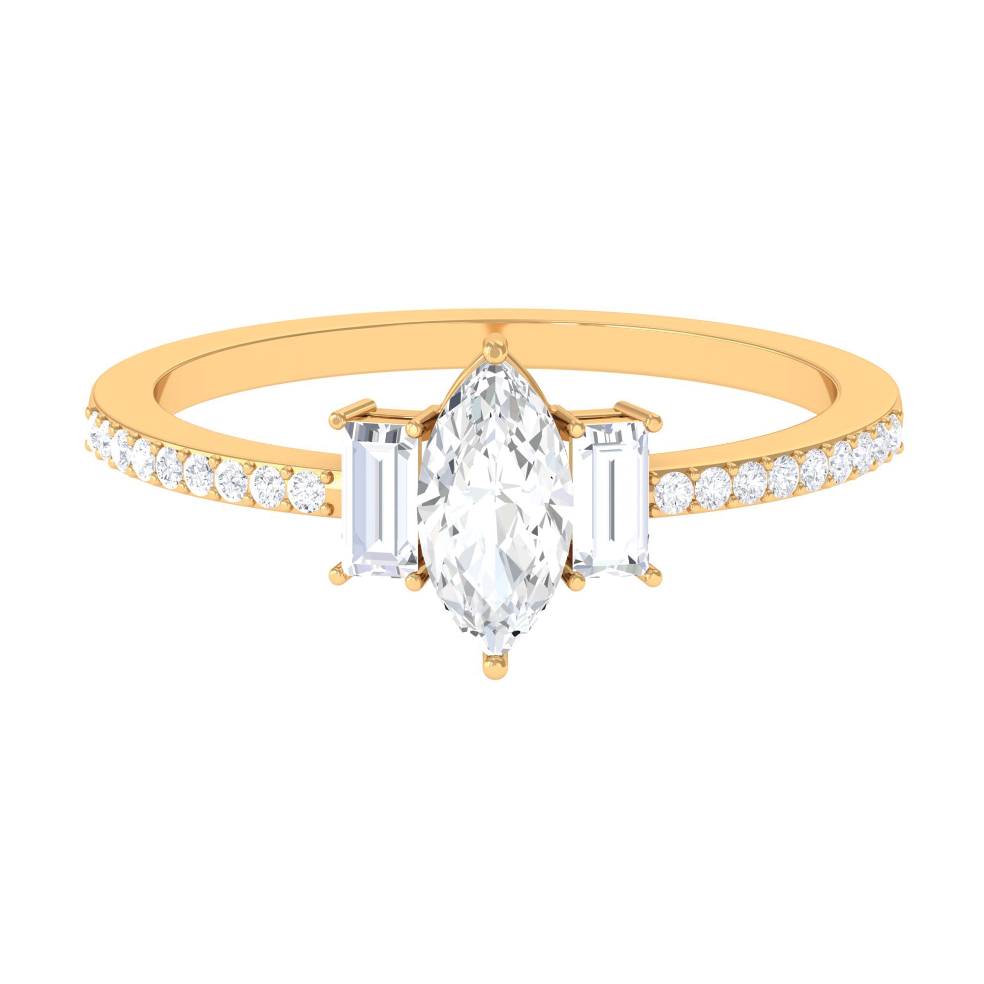 Jewelry has the power to be the one little thing that makes you feel unique. This Three Stone Engagement Ring is embellished with Marquise and Baguette Cut cubic zirconia with side stones. This Simulated Diamond Engagement Ring is crafted in gold. Tell your story by wearing this Beautiful Gemstone Ring.