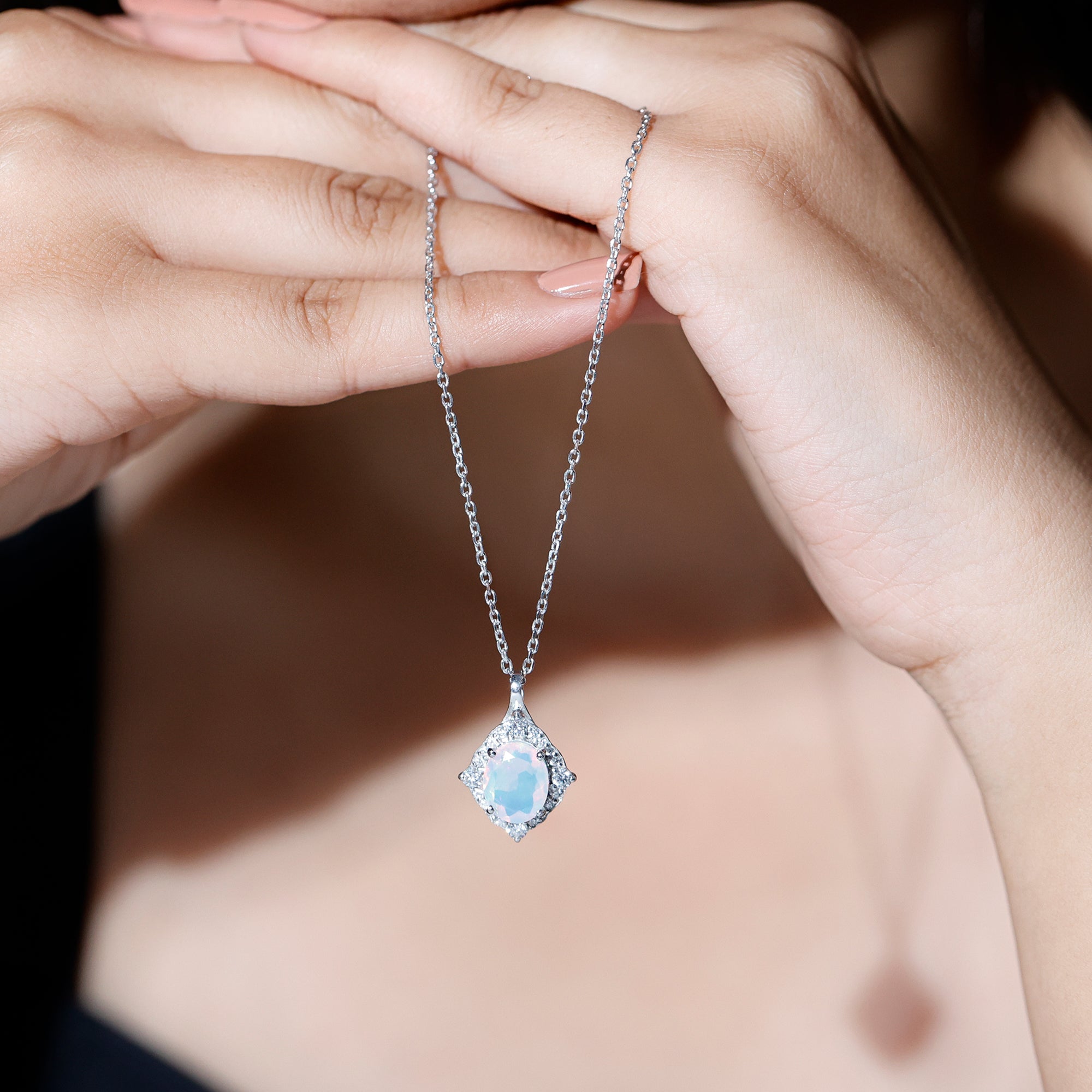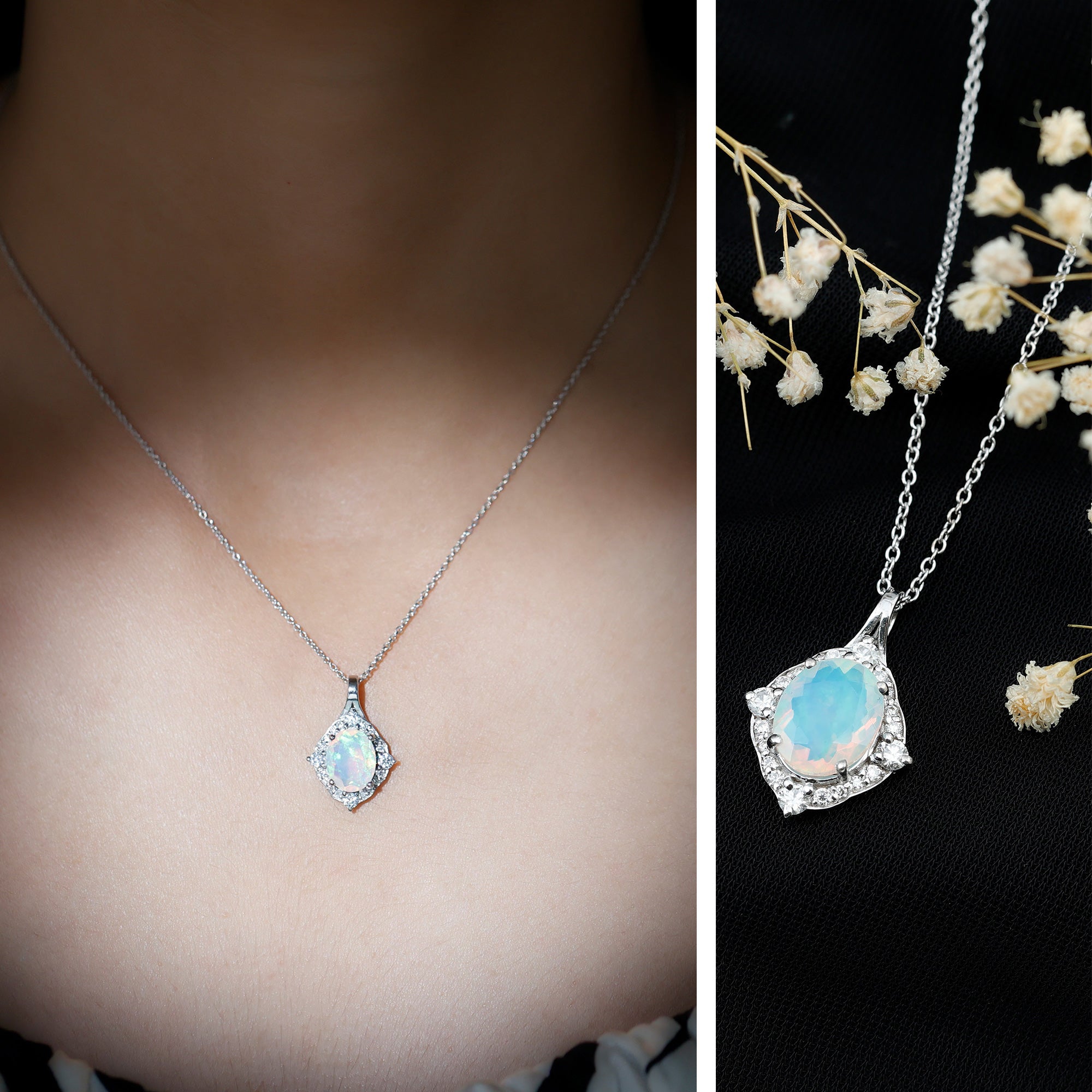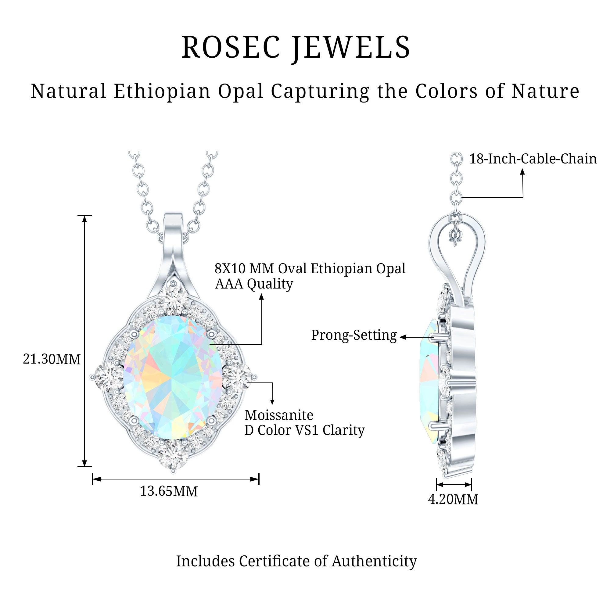 This Ethiopian Opal Pendant has a unique and vintage design defining a sophisticated and classy look. It features an 8X10 MM Oval Shaped Ethiopian Opal securely placed in Prong Setting encircled by a halo of Round Shape Moissanite enhancing the look of the pendant. This Vintage Pendant Necklace exudes the unmatchable shine of AAA Quality Ethiopian Opal making it a perfect present to celebrate the milestone of a relationship. This Oval Pendant Necklace dangles in a sturdy cable chain which makes the pendant beautifully sit on the neckline. The pendant is crafted precisely with 14K White Gold Plated Silver for your special occasion.