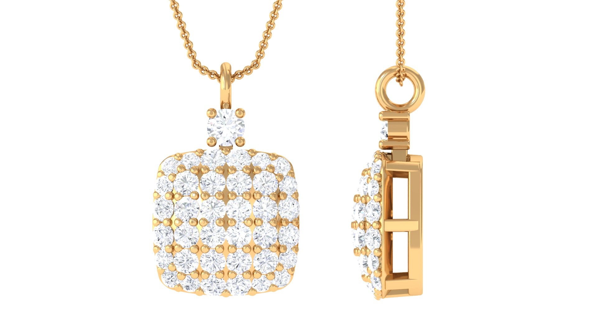 This pendant featuring a round cut Moissanite in a prong setting on a cluster pendant necklace is a versatile accessory suitable for any occasion. Crafted in gold and certified for quality, this piece of jewelry is sure to make a statement. The Moissanite stones brilliance and fire are unparalleled, and its prong setting ensures maximum light reflection. Wear this pendant with confidence, knowing that it is of the highest quality and is sure to draw compliments wherever you go.