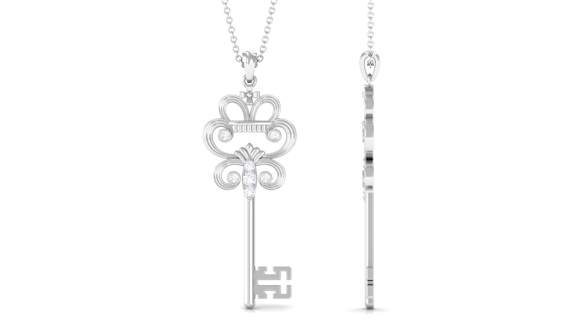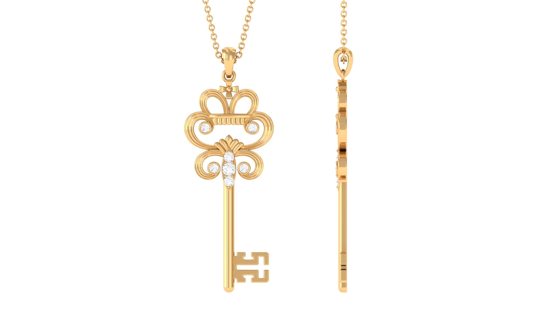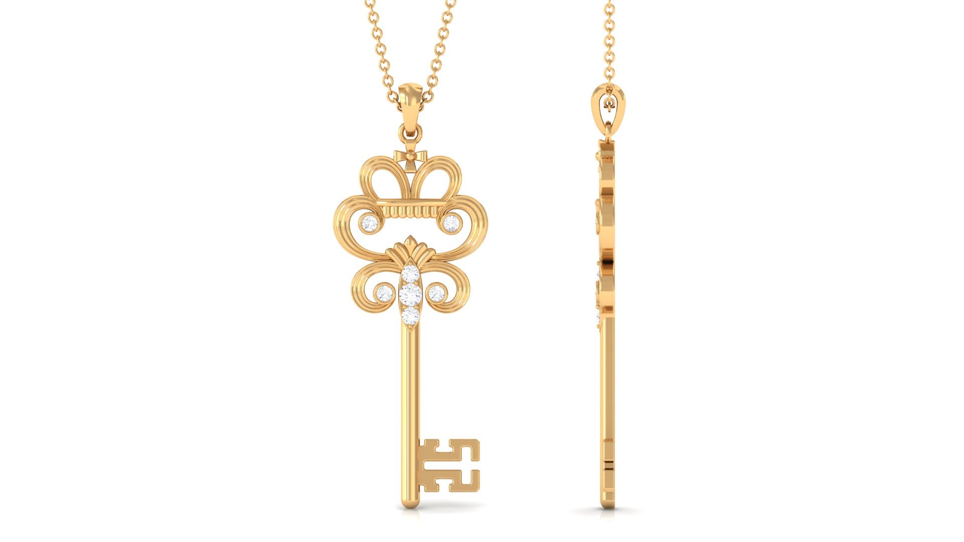 Elevate her style with this stunning Vintage Key Pendant Necklace. The pendant features round cut Moissanite stones expertly set in a combination of bezel and prong settings, creating a gorgeous and sparkling effect. The necklace is crafted from luxurious gold metal, adding a regal touch to her outfit.