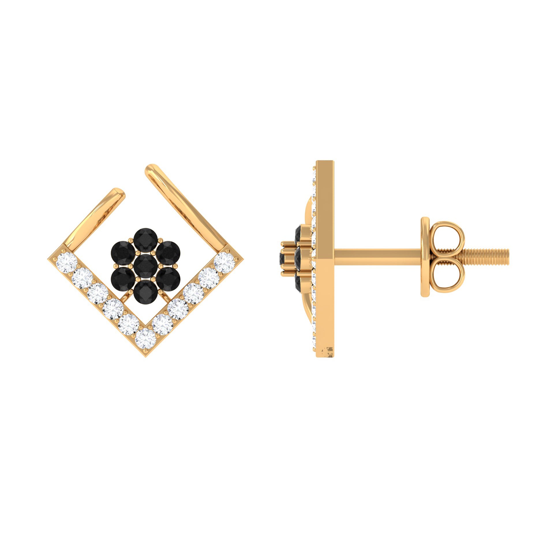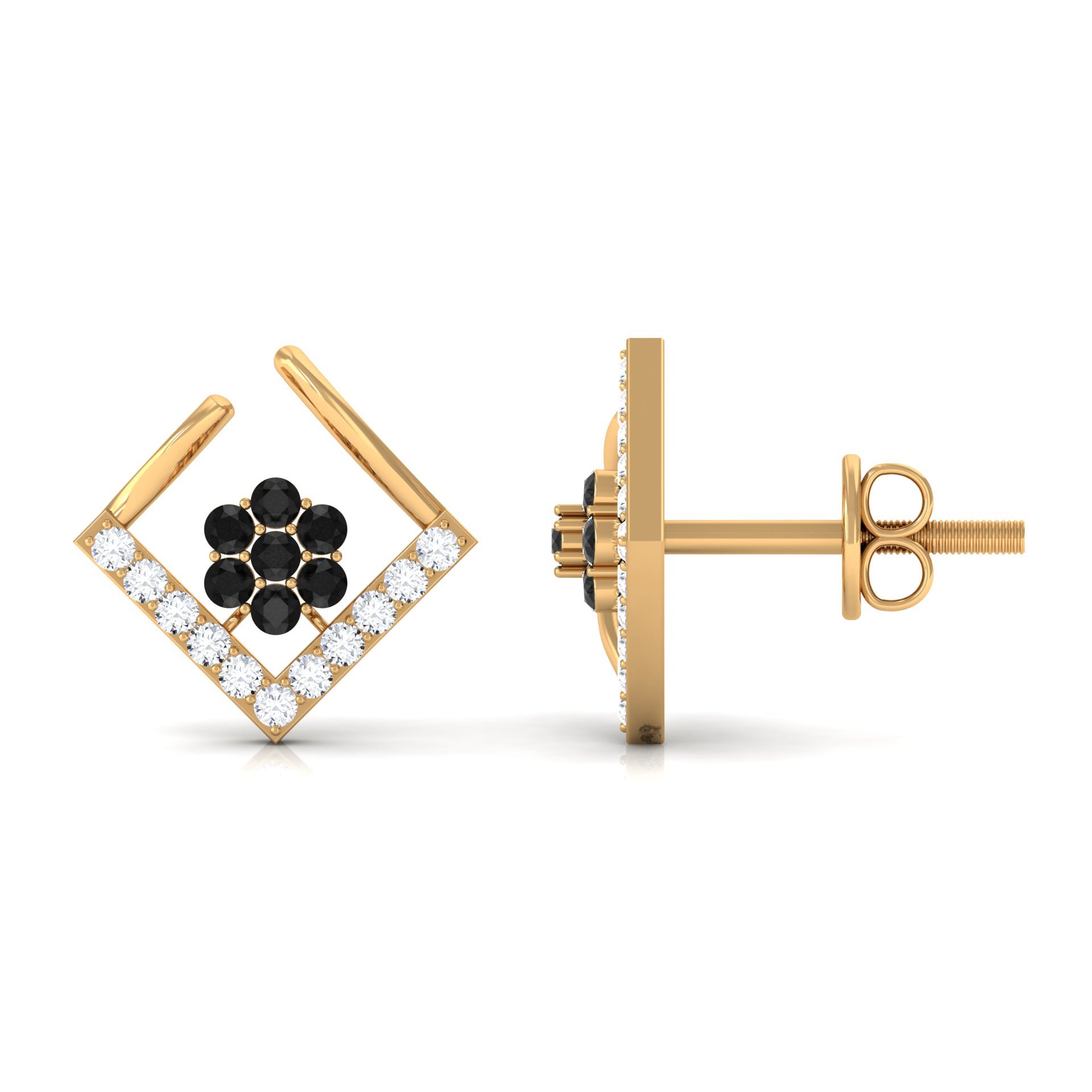 They are a pair of Floral Stud Earrings, adorned in Solid Gold and consist of Round Shape Created Black Diamond embellished in Prong Setting with Round Shape Diamonds embellished in Pave Setting.