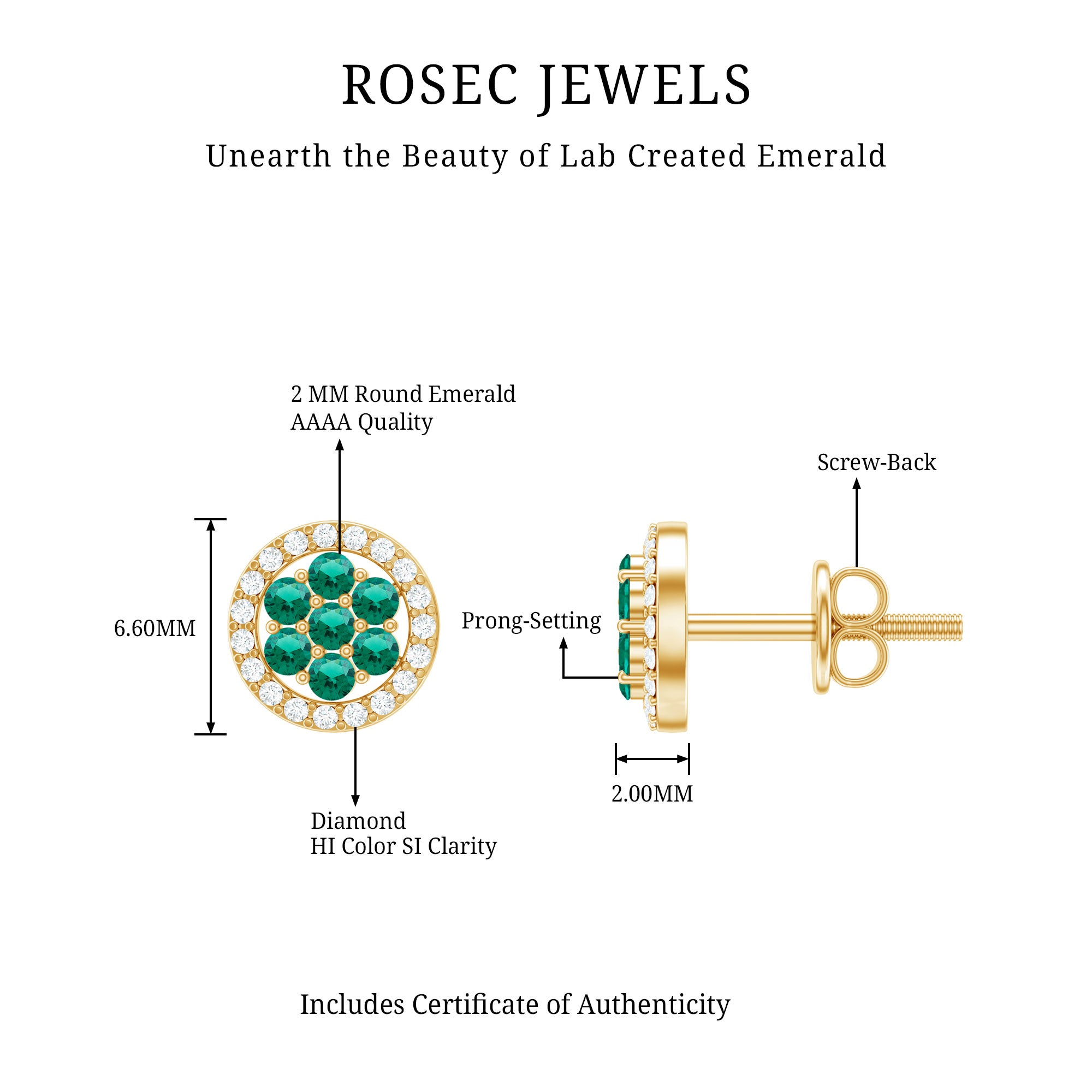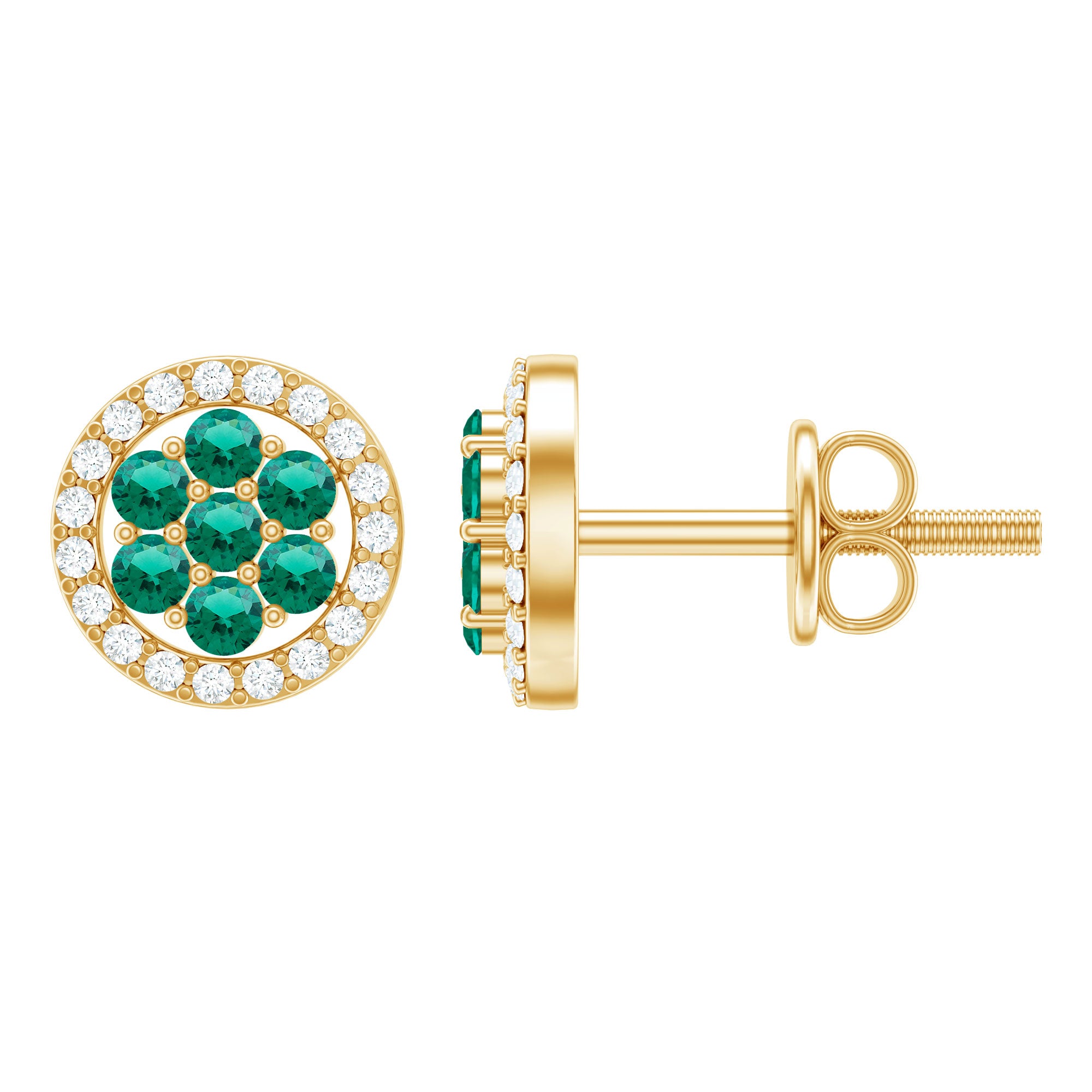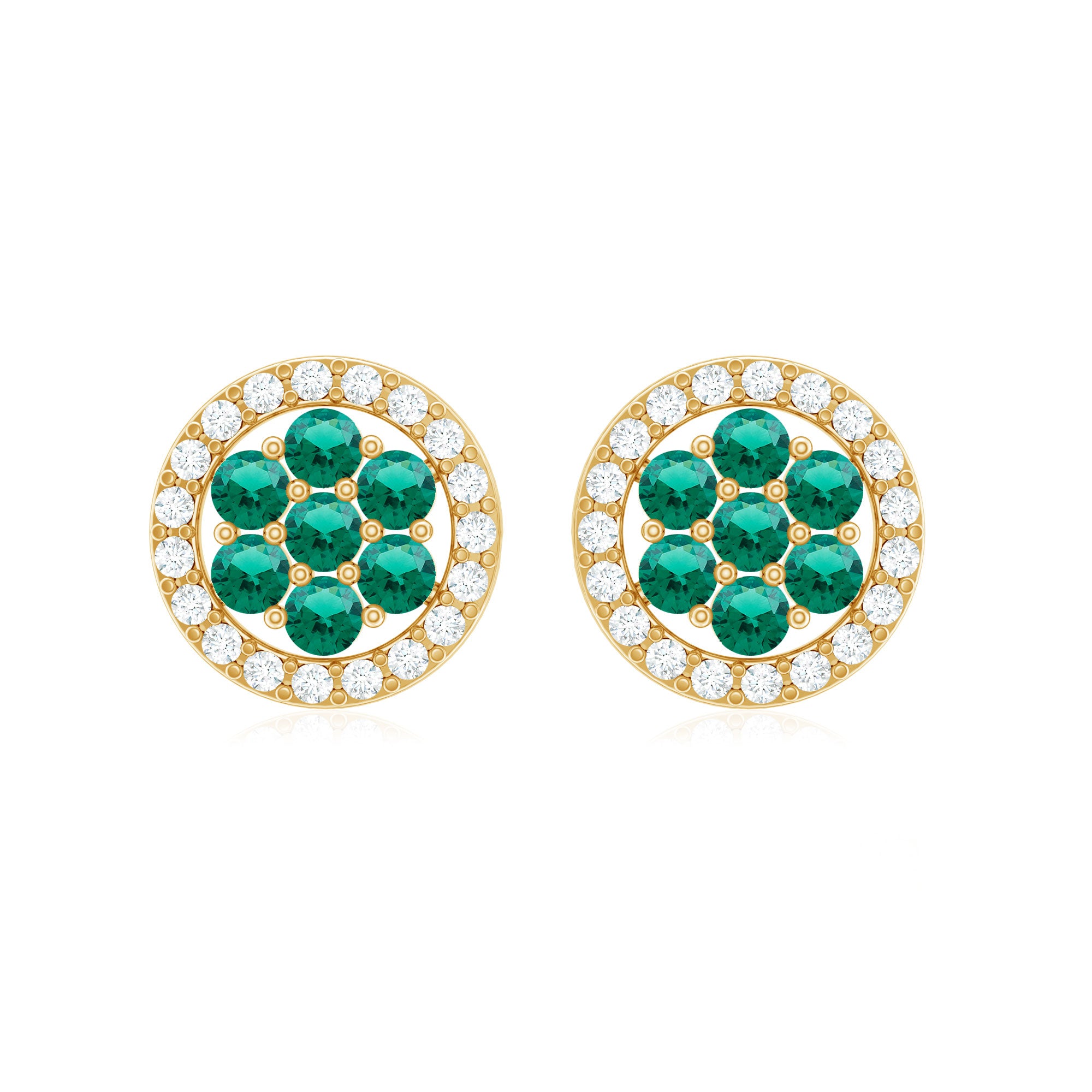 Give a sparkling appeal to your evening outfit with these Halo Stud Earrings is adorned with Round Shape Created Emerald in a cluster with Diamond in a Halo. These Gold Cluster Stud Earrings are mounted in Solid Gold for a luxurious appeal.