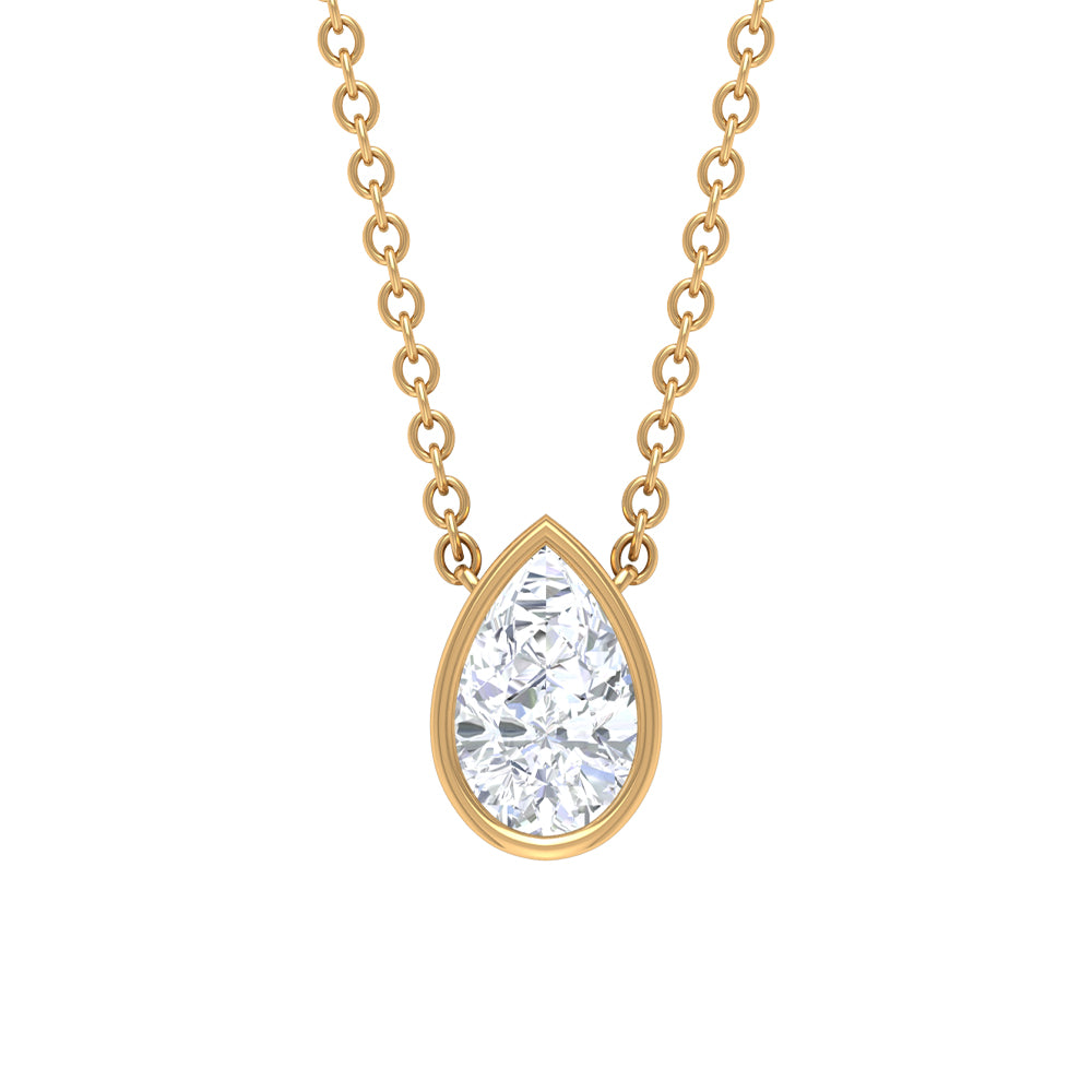 Diamond Solitaire Pendant is embellished with Pear Shaped Diamond is set as Solitaire in a Bezel Setting. This Dainty Diamond Pendant is composed of Solid Gold.