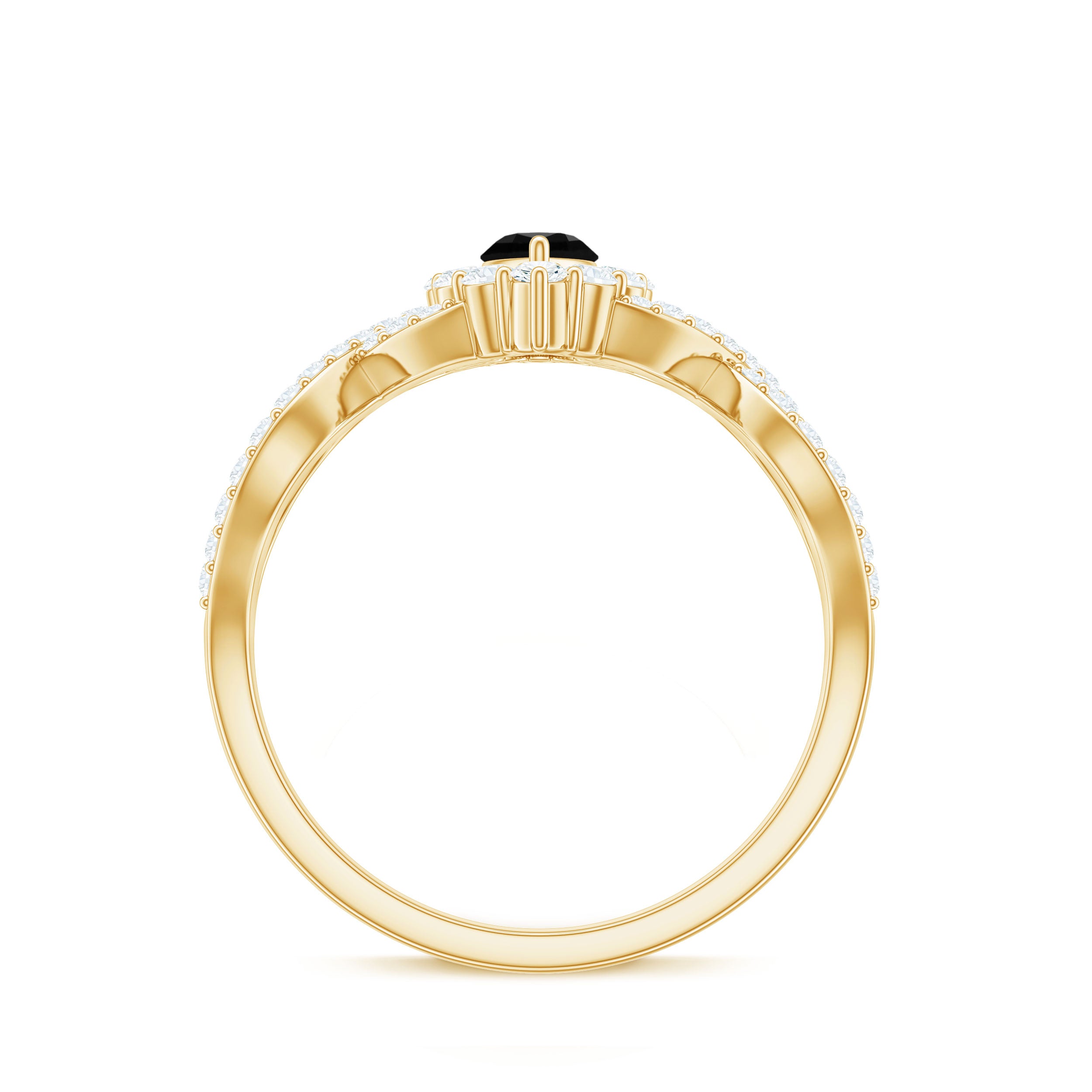 Allow this exquisite Black Onyx Engagement Ring to express your emotions when words are insufficient. At the core of this stunning piece lies a 4X8 MM marquise cut Black Onyx, securely set in a 2-prong setting and surrounded by a delicate halo of round Diamond stones that enables light to pass effortlessly through each facet. The unique criss cross band, tastefully adorned with small diamond stones, adds a contemporary touch while symbolizing the union of two lives. This thoughtful design merges sophistication with sentiment, resulting in a ring that is rich in meaning and modern allure. Carefully handcrafted, this Crossover Engagement Ring serves as an ideal representation of love, whether you are preparing for a proposal, commemorating a significant milestone, or simply indulging yourself with a meaningful piece. The versatile design ensures it appears just as stunning for everyday wear as it does for those special occasions. Presented in a beautiful jewelry box, this Halo Engagement Ring is ready to be gifted or treasured for a lifetime. Embrace the future of fine jewelry with this chic Marquise Onyx Ring, where contemporary design harmonizes with timeless sparkle.