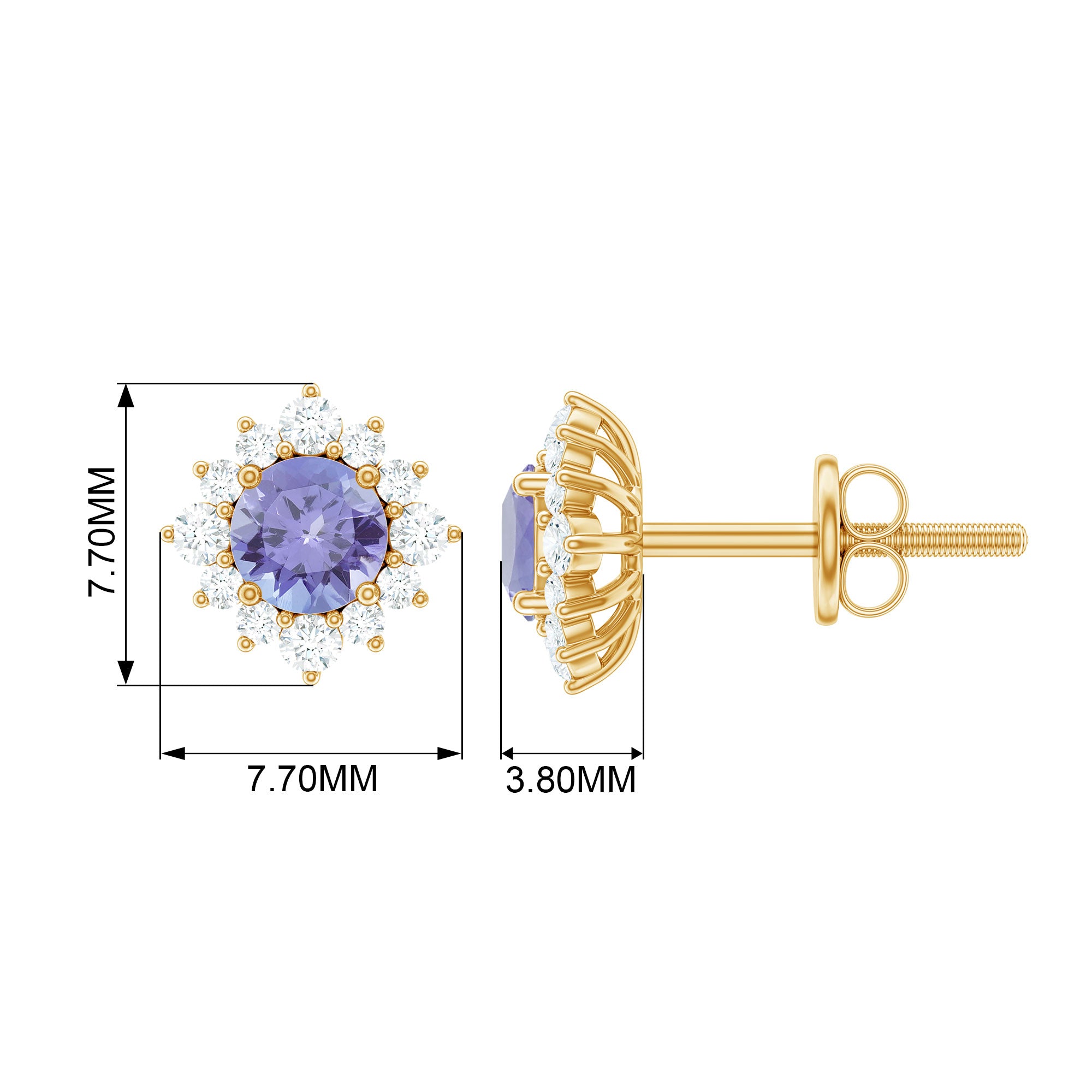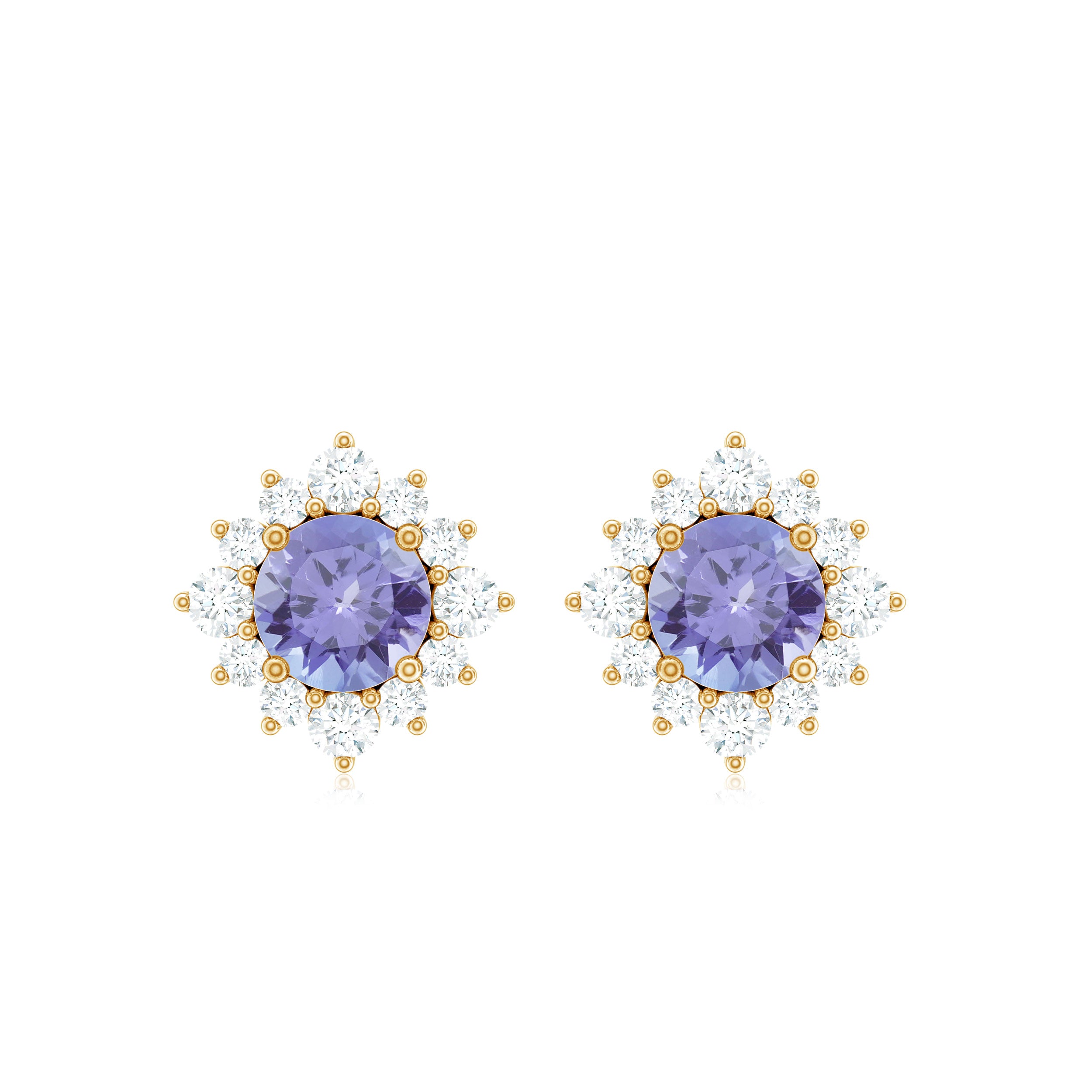 Look as stunning as ever while flaunting this pair of Halo Stud Earrings featuring a Round Shape Tanzanite Gemstone in the center set in prong setting encircled by a Halo of sparkling Round Shape Diamond. The Classic Stud Earrings beautifully crafted in Solid Gold will make you the center of attraction at all your parties.