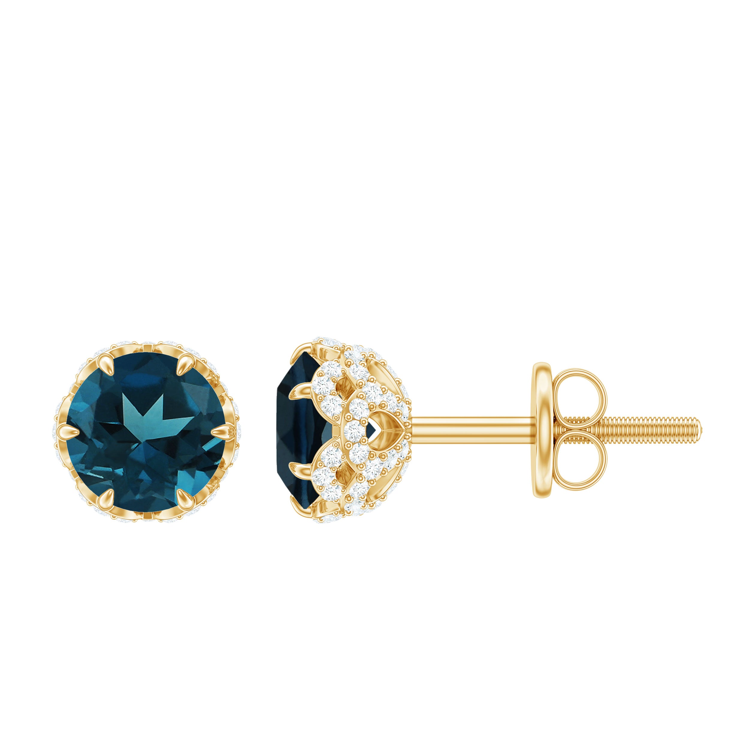 Enhance your look with these elegant stud earrings. Featuring a 5 MM round-shaped London Blue Topaz set in a lotus basket setting and accented with Diamond. These earrings are perfect for any occasion, adding a touch of elegance to any womans jewelry collection.