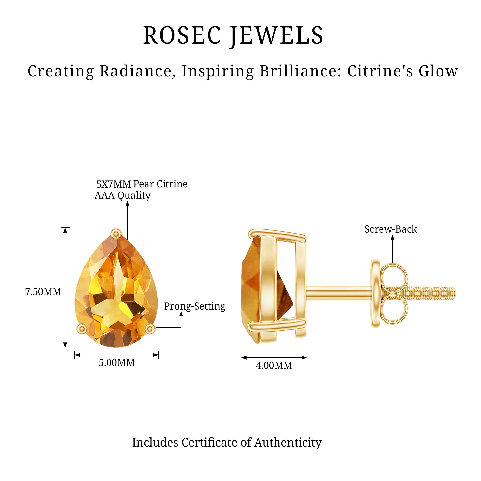 Elevate your everyday look with these gorgeous Citrine Stud Earrings. The vibrant golden hue of the 5X7 mm Pear Shape Citrine set in 3 Prong Setting captures the warmth of autumn sunshine, adding a pop of color to any outfit. Designed with a secure Screw Back Closure, these Citrine Studs are both comfortable and stylish, giving you peace of mind while you wear them. Whether you are dressing up for a special occasion or adding a bit of sparkle to your daily wardrobe, these Pear Shaped Earrings are versatile enough to pair with anything you love. Presented in a beautiful jewelry box, these November Birthstone Stud Earrings are ready to gift, making them an ideal present for birthdays, anniversaries or any special occasion. Timeless yet modern, they are a wonderful way to bring warmth and radiance to your look or to show someone special how much you care. With their classic design, these Citrine Studs are sure to be a favorite for years to come, effortlessly brightening up your jewelry collection.