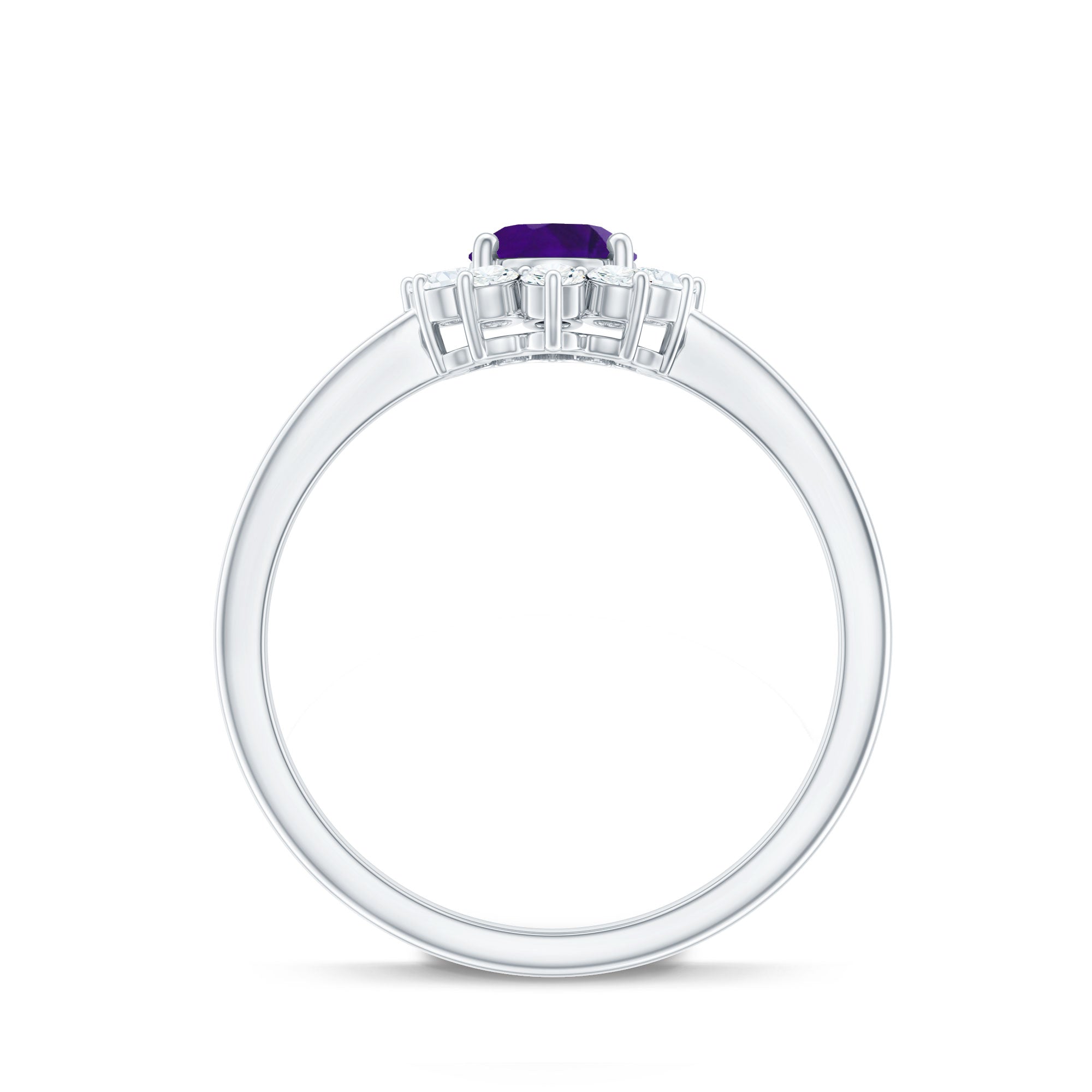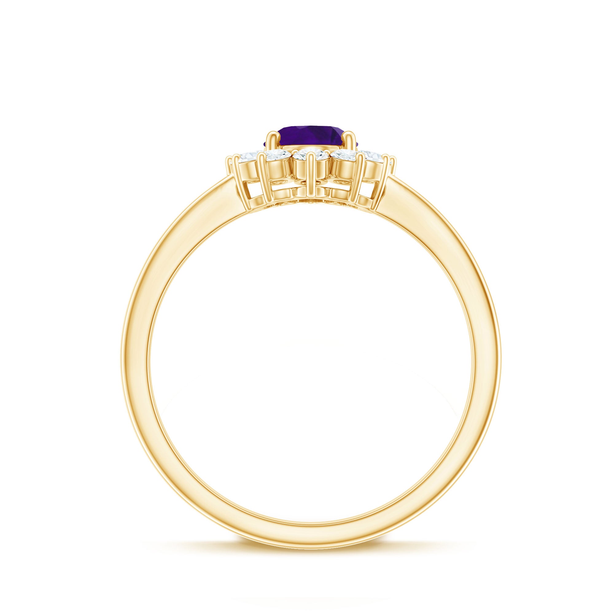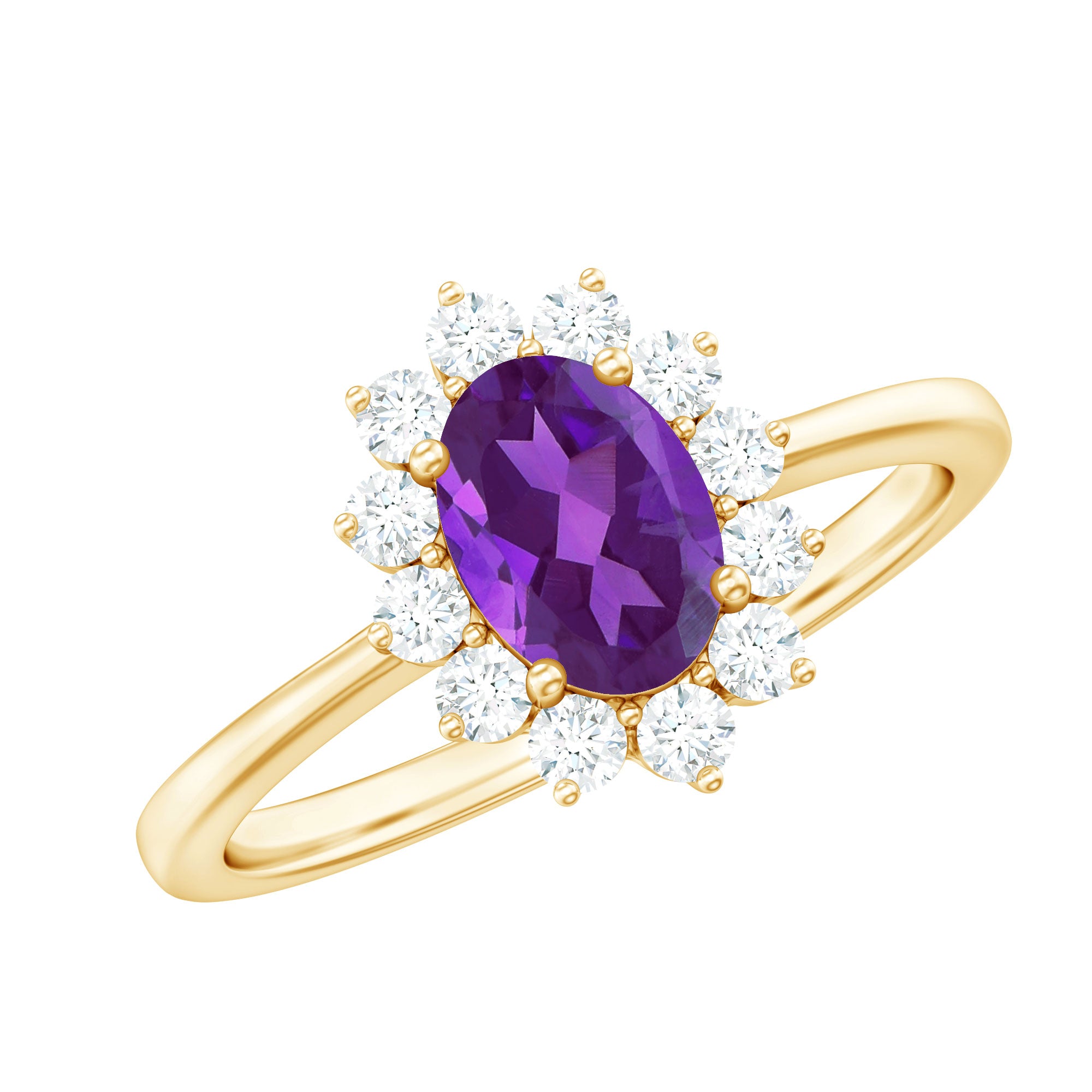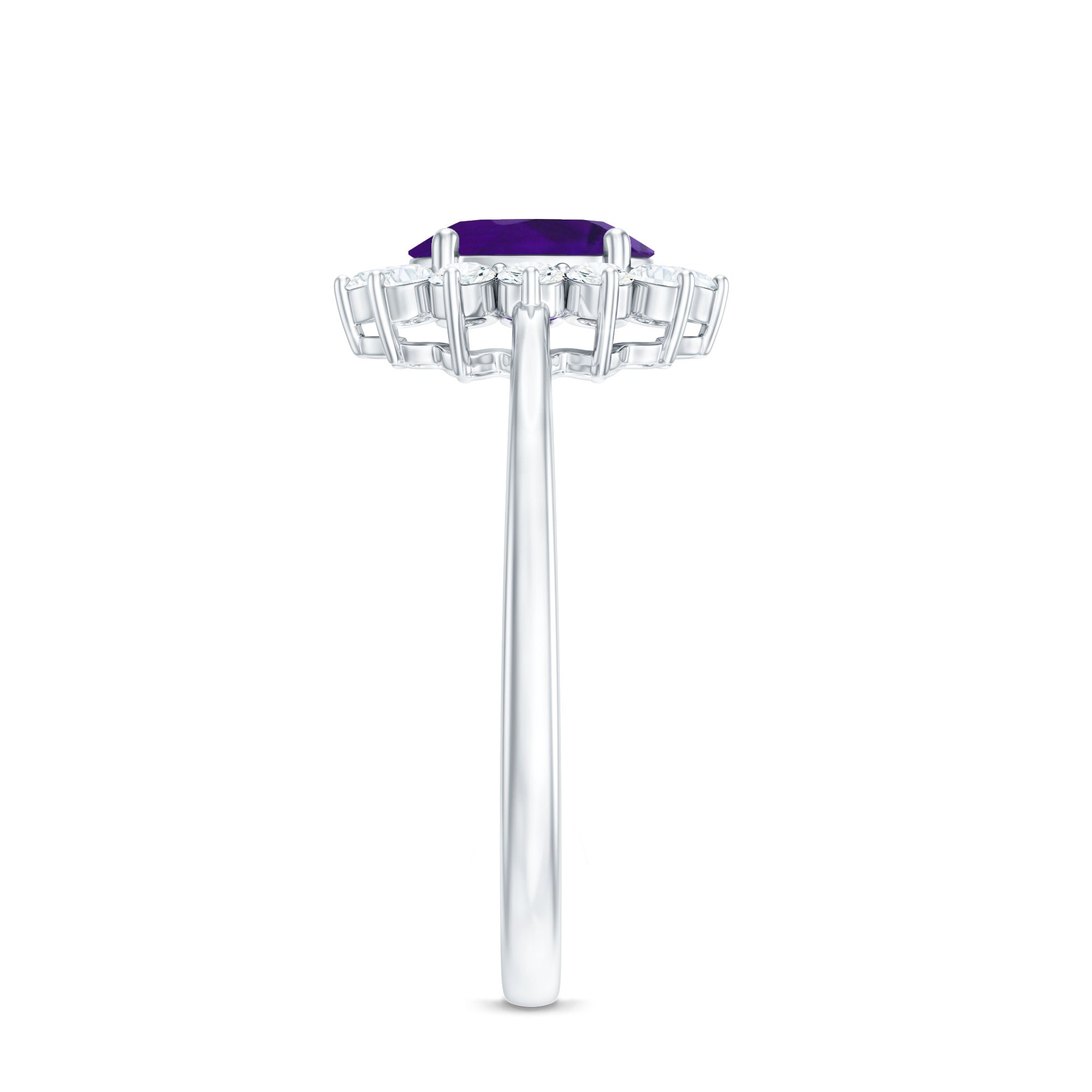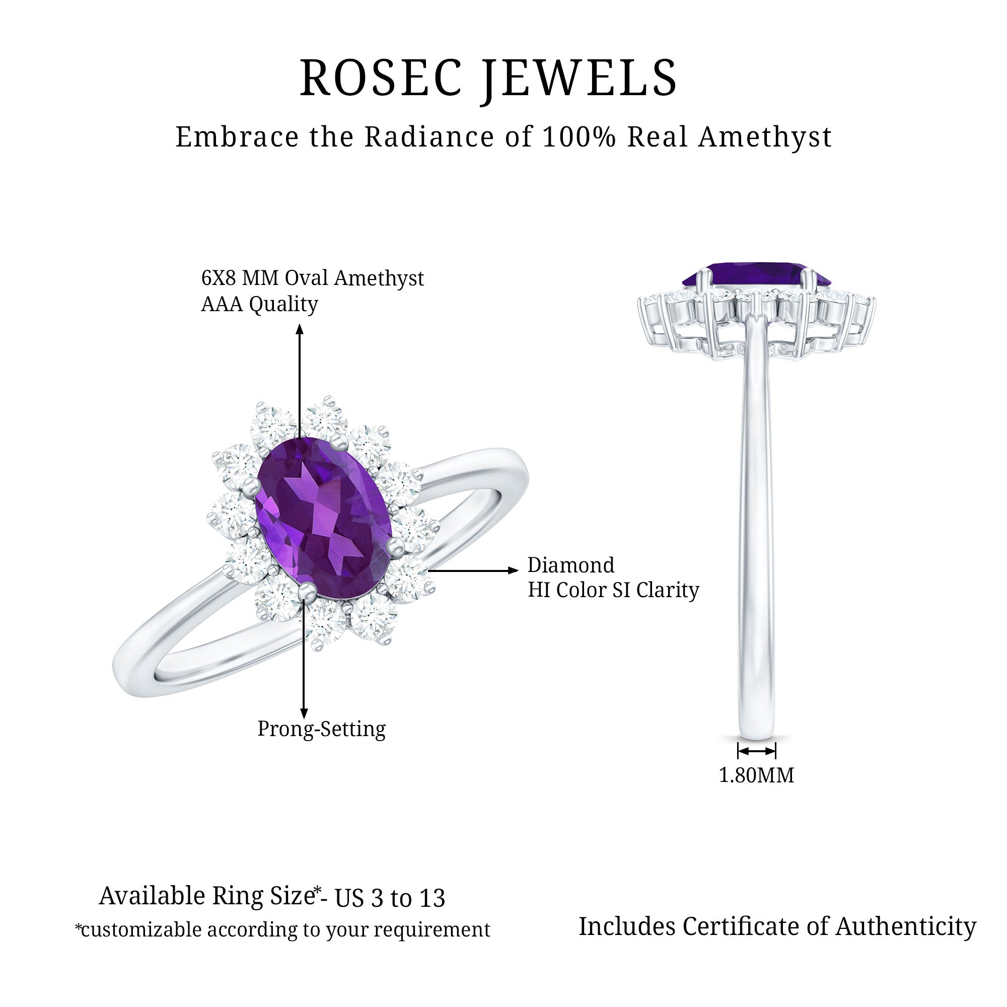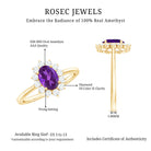 Propose to your beloved with the exquisite Amethyst Ring and make her feel like a princess. This engagement ring is inspired by Princess Diana and features a 6X8 MM oval cut Amethyst gemstone in a prong setting, surrounded by Diamond stones. With this natural Amethyst ring, your love will always be with her, no matter where she goes. The total weight of the ring is 1.50 carats, and the gemstone has a AAA clarity rating. Rest assured, all our gemstones are certified and go through a rigorous quality check process.