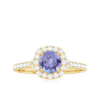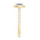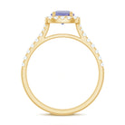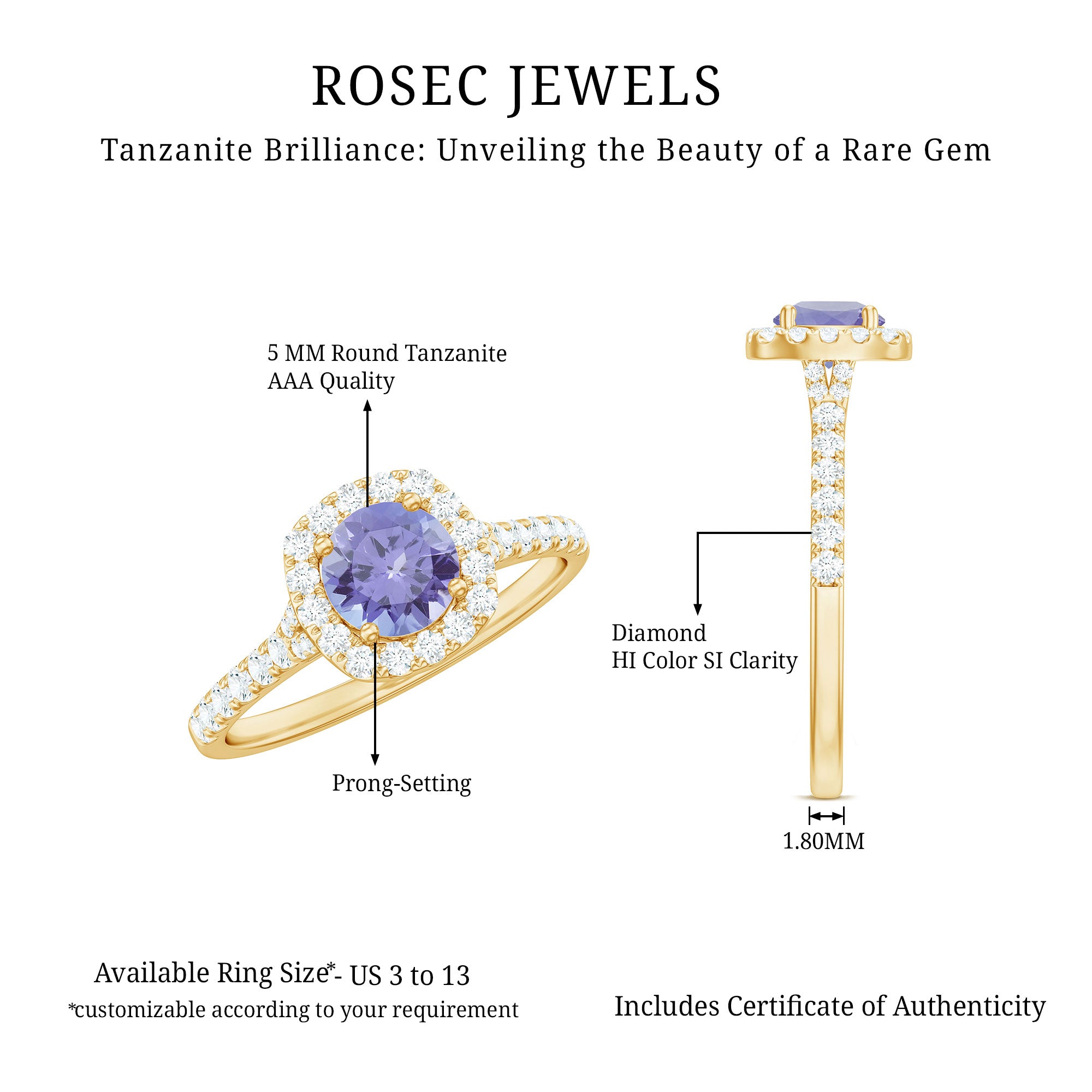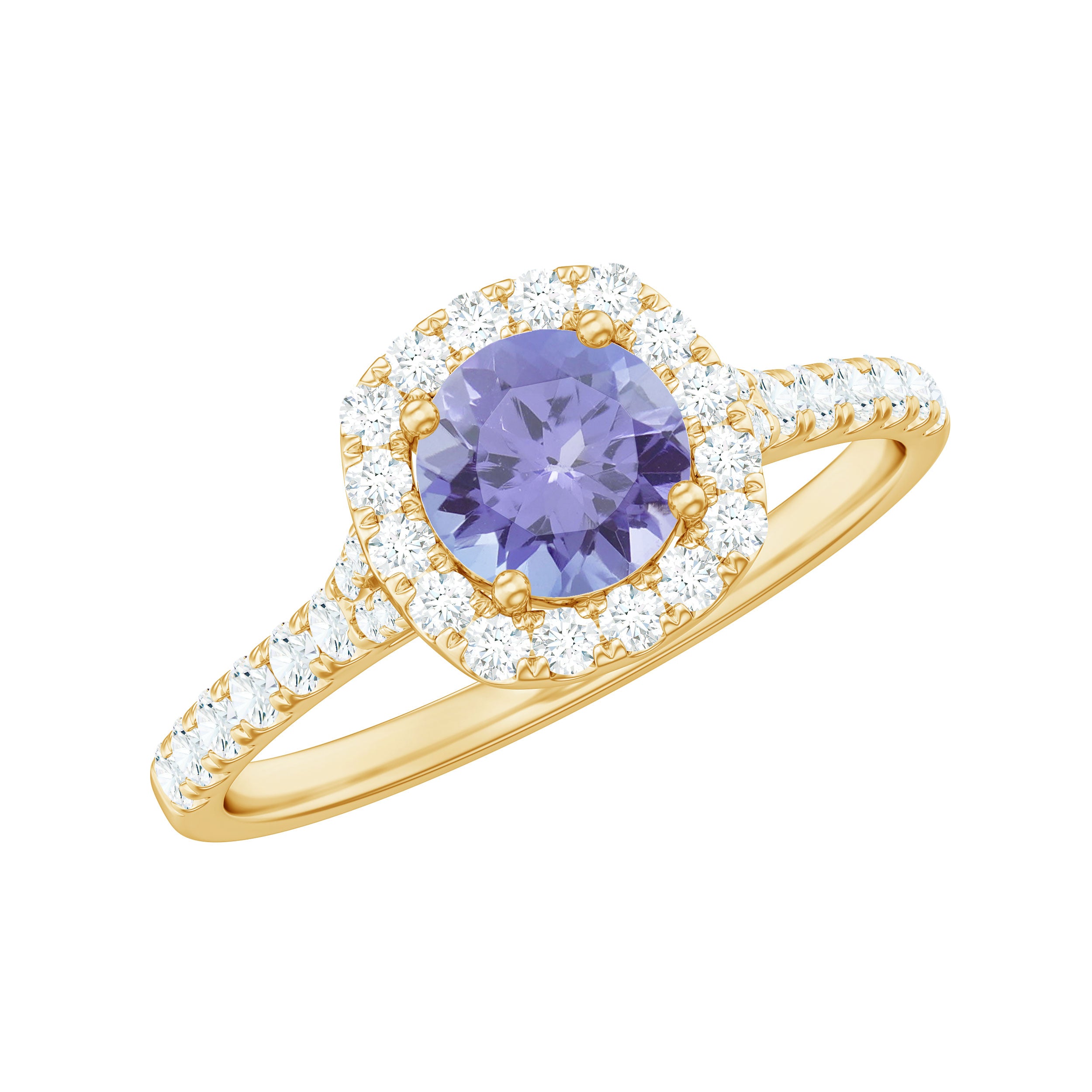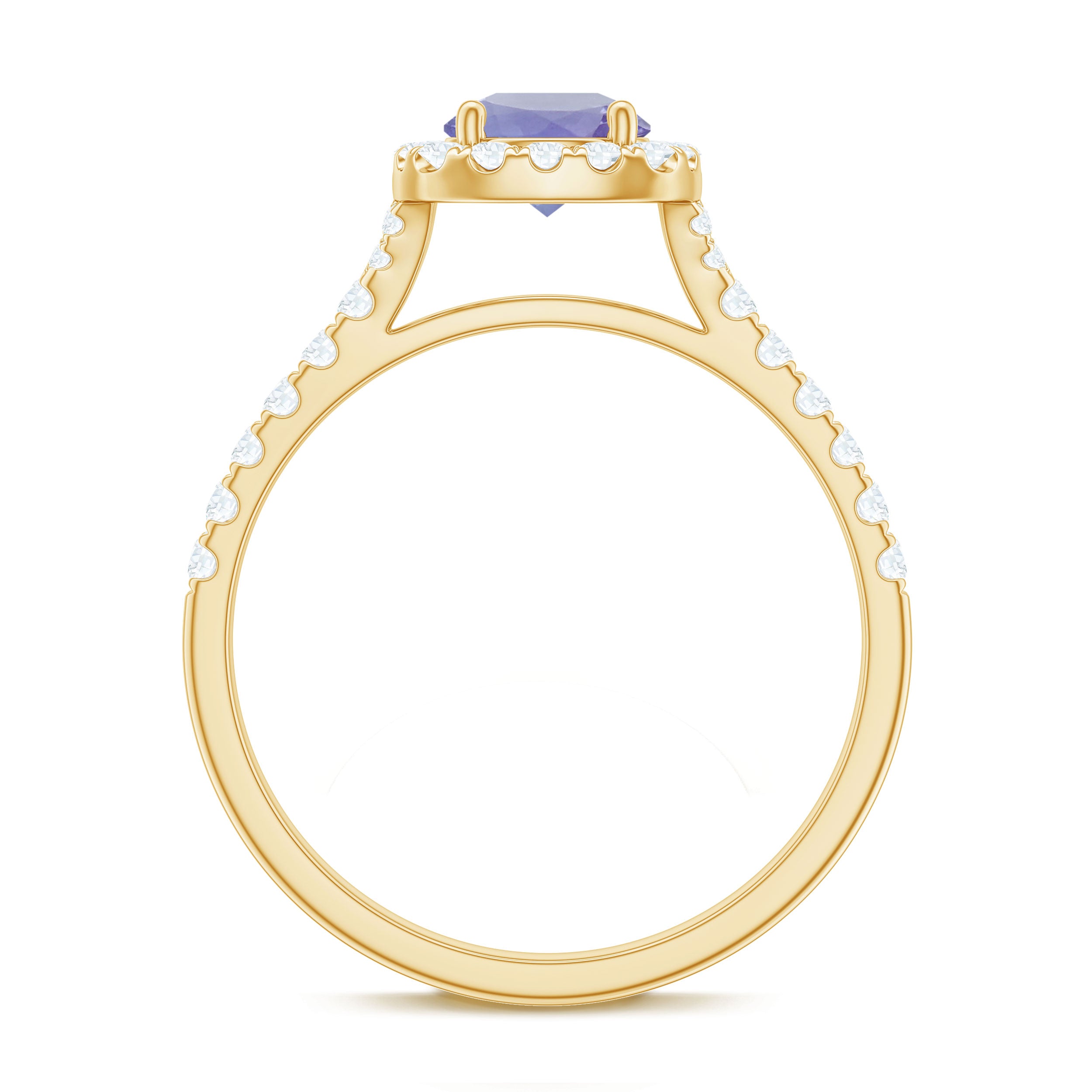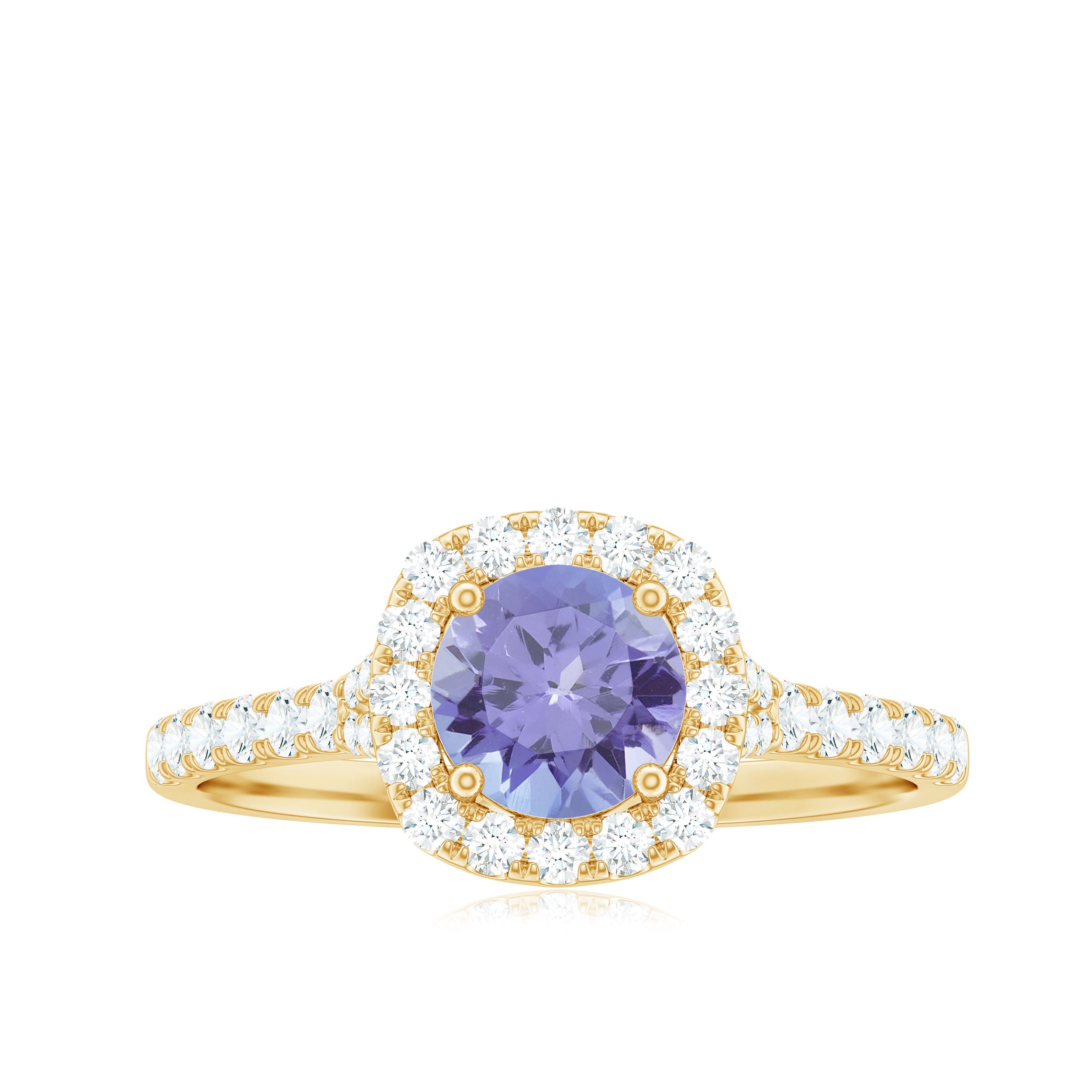 Surprise your beloved with this Designer Ring adorned with Round Shape Tanzanite and Diamond Floating Halo. Crafted with Solid Gold for a luxurious appeal.
