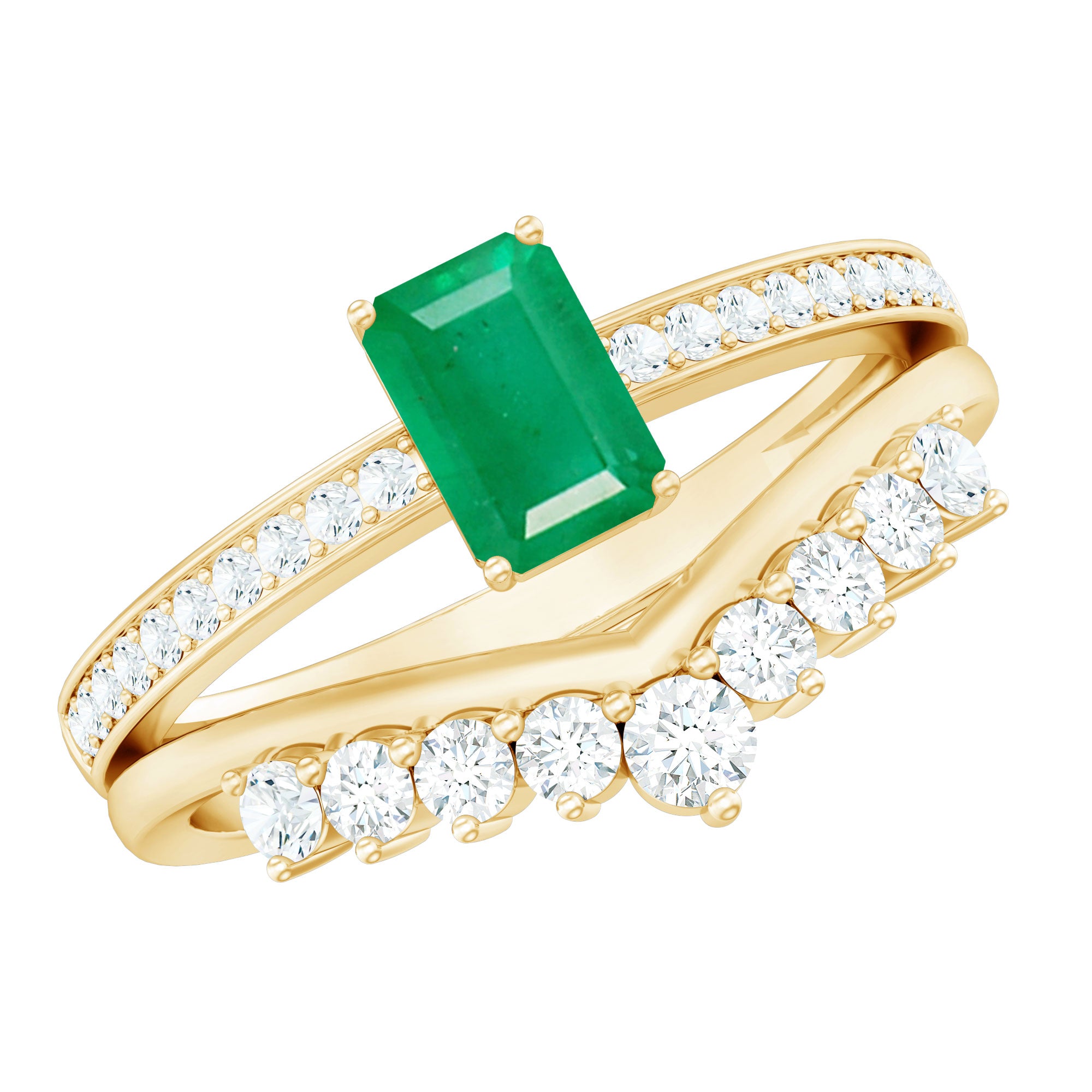 Natural Emerald Diamond Emerald Cut Engagement Ring with Curved Wedding Band
