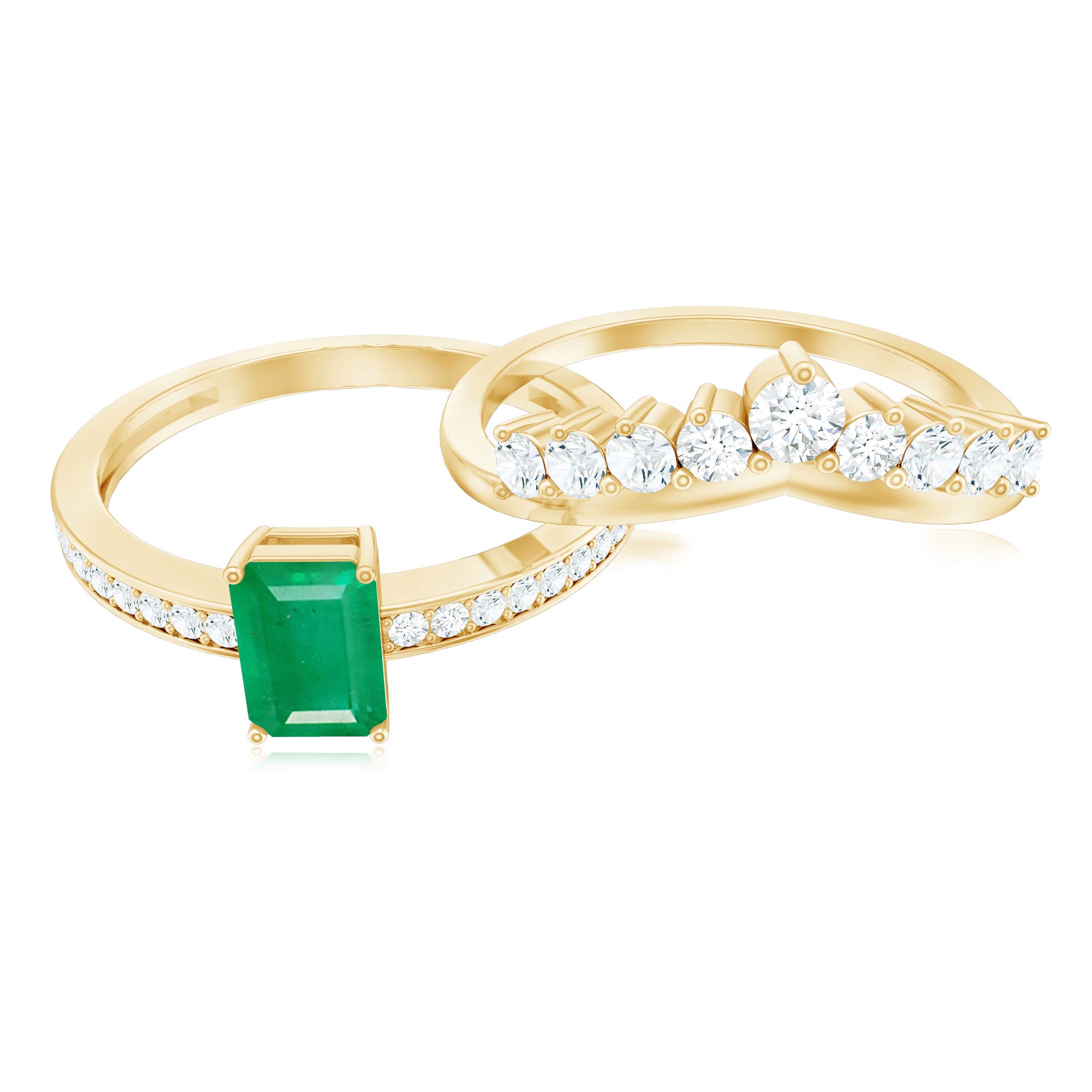 Unveil the brilliance of eternal love with this captivating Wedding Engagement Ring Set, designed to celebrate your most cherished moments. The Solitaire Engagement Ring adorned with 4X6 mm Emerald Cut Emerald set in Prong Setting is beautifully framed by sparkling Diamond Side Stones that catch the light from every angle. Complementing it, the gracefully Curved Wedding Band is adorned with delicate Diamond stones, hugging the Emerald Cut Engagement Ring perfectly to create a seamless, elegant union. Each piece can stand alone for understated sophistication or be worn together for a dazzling, layered statement that reflects your unique love story. Delivered in a signature jewelry box and available in multiple sizes, this Emerald Wedding Ring Set is a symbol of devotion, passion and the promise of forever. Perfect for the bride who dreams of timeless elegance with a contemporary flair, this Emerald Engagement Ring with Wedding Band transforms every gesture into a sparkling celebration of romance. Let this Wedding Bridal Ring Set be a treasured reminder that true love is endlessly beautiful.
