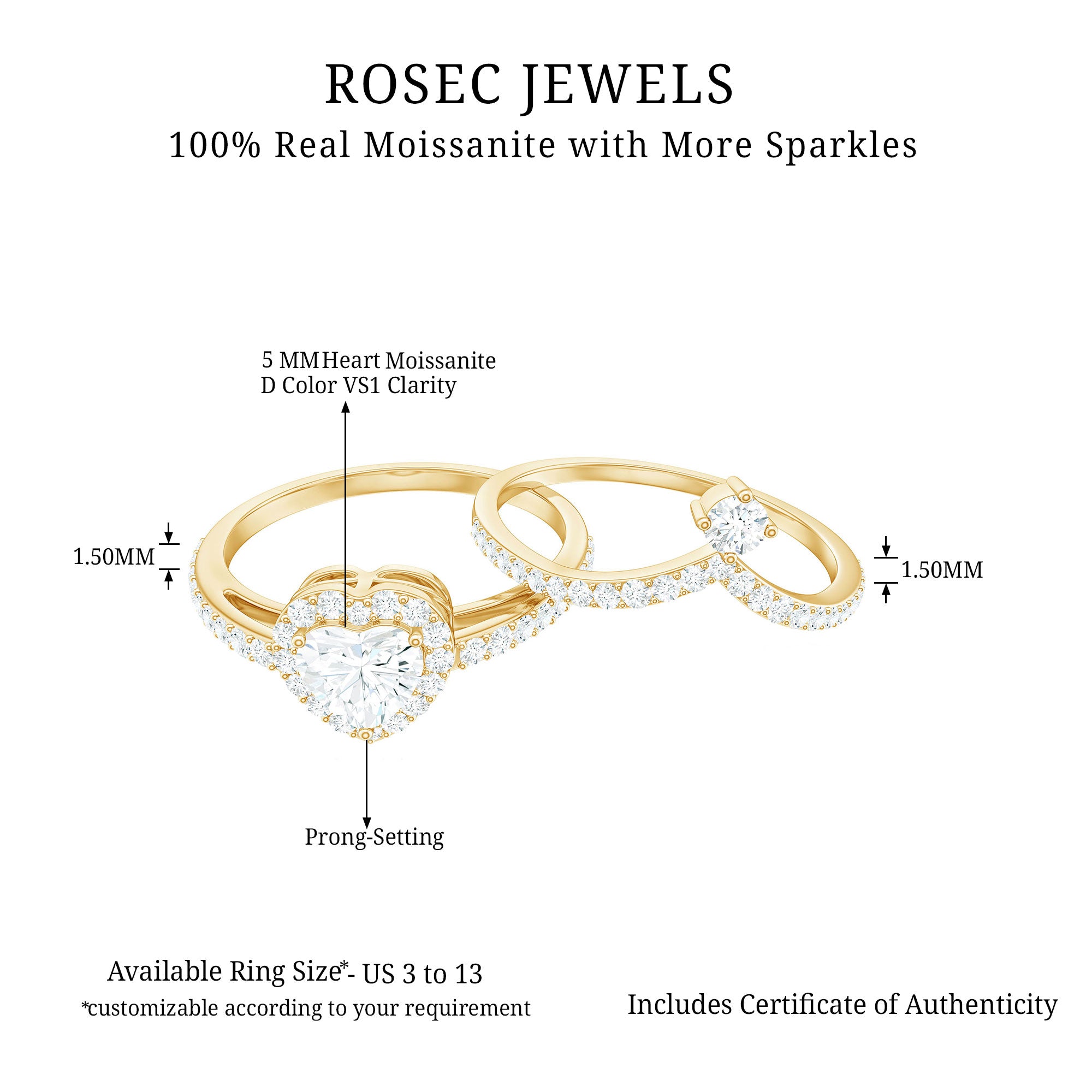 Give a captivating appeal to your look with this sparkling Moissanite Ring Set and make a everlasting statement. This Heart Ring Set has Heart Shape Moissanite Ring with round cut moissanite creating halo and side stone along with a enhancer ring adorn with round cut moissanite to make a classic piece of Fine Jewelry. This Moissanite Wedding Ring Set is crafted in Gold to offer a luxurious look.