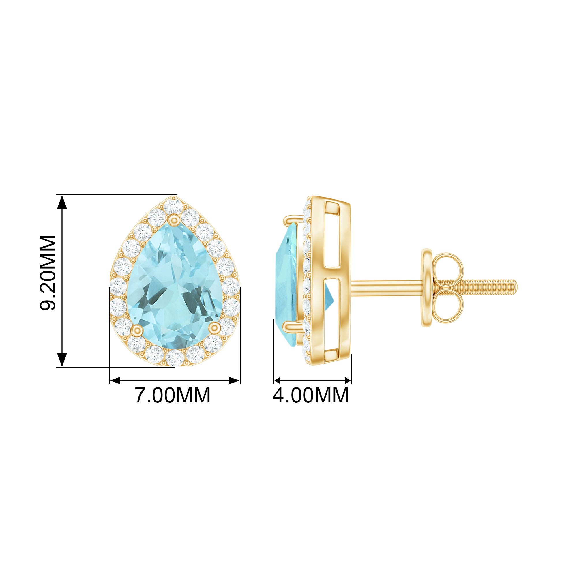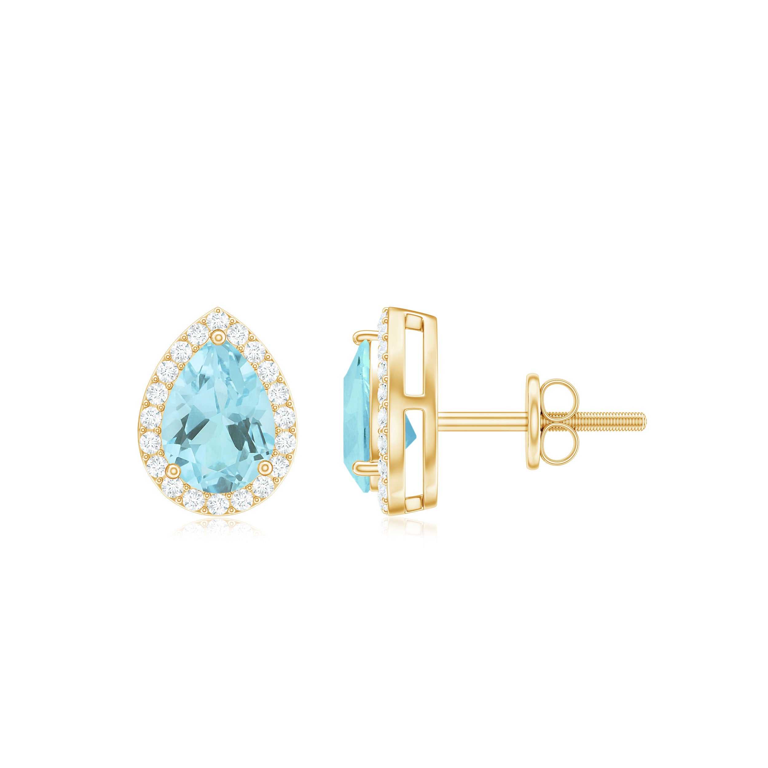 This Beautiful Teardrop Stud Earrings is embellished with Pear Cut Sky Blue Topaz as Solitaire and Diamond set in Halo. This Solitaire Stud Earring is Composed of Solid Gold.