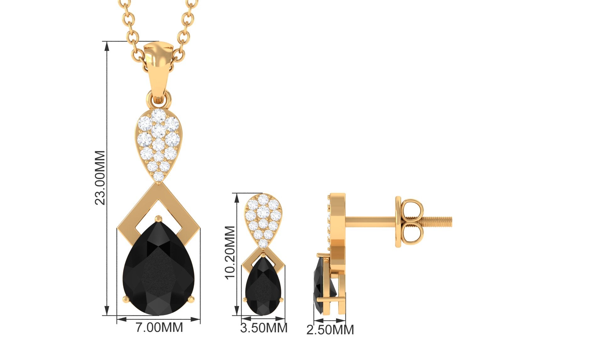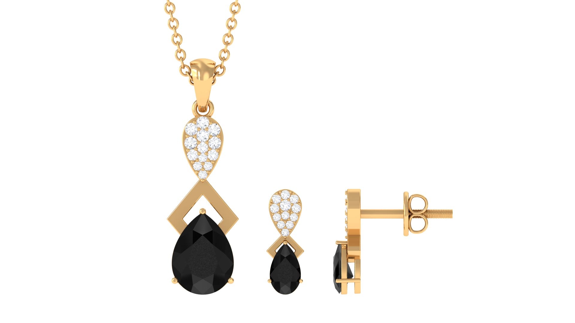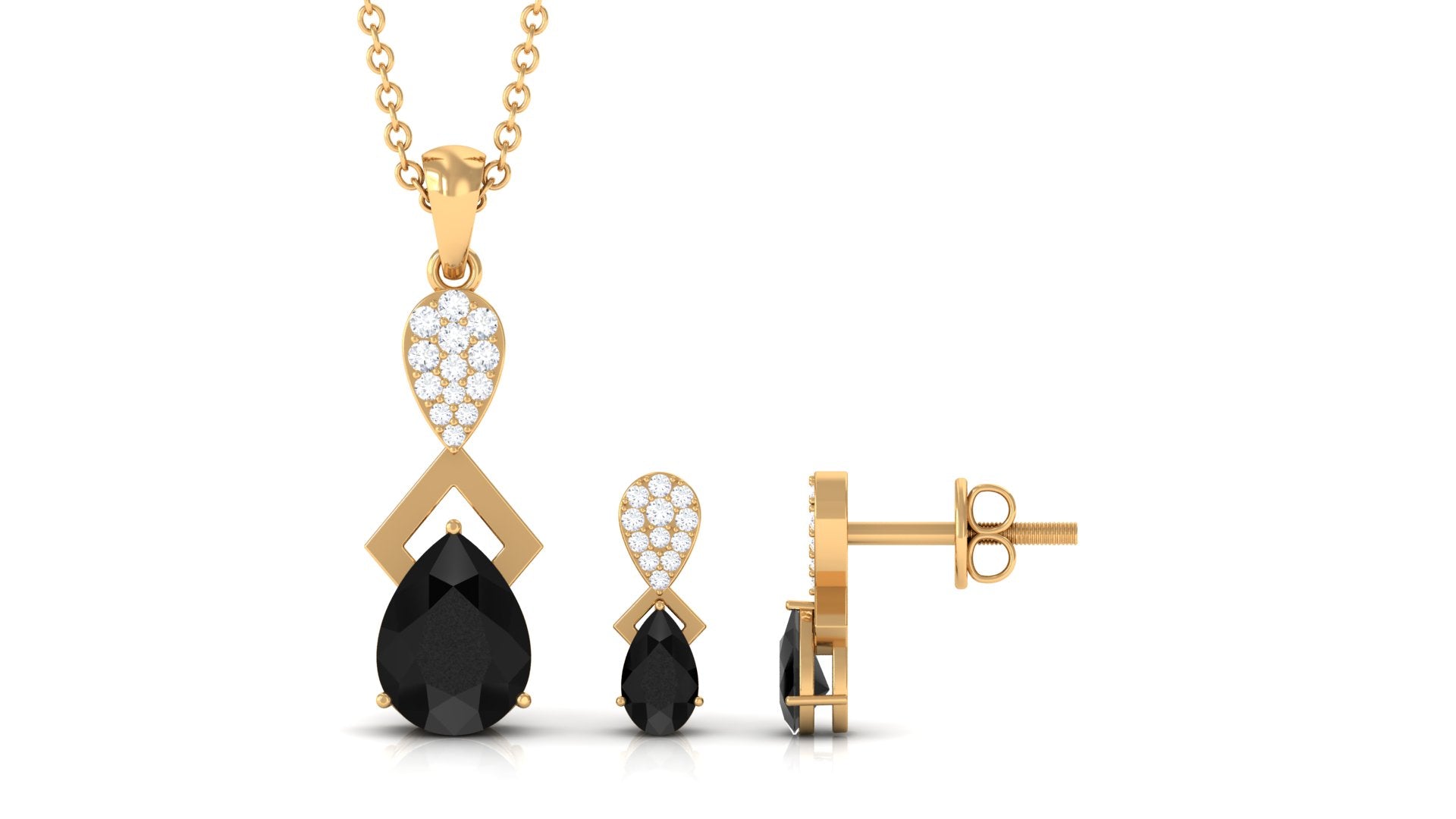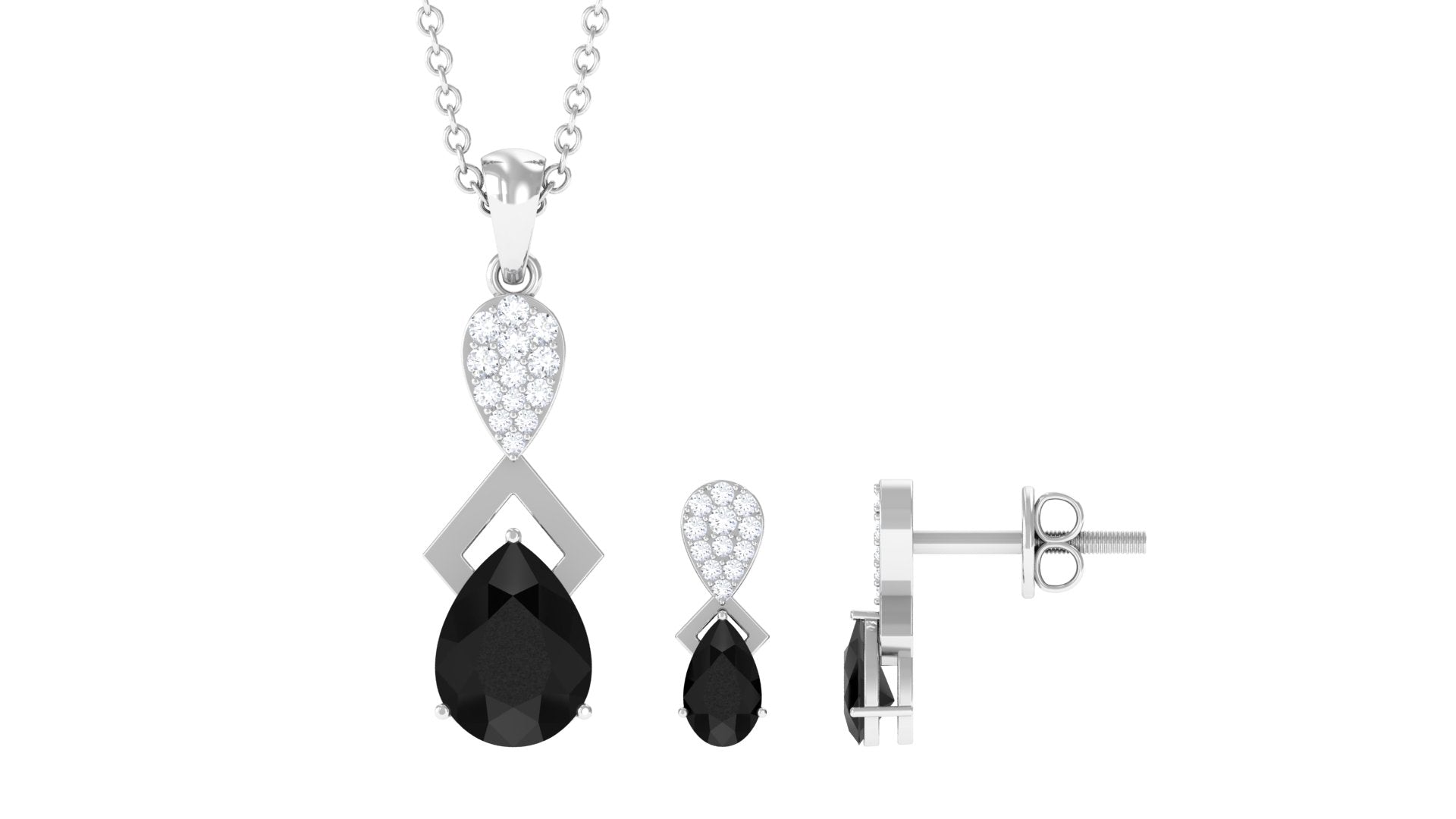 The Black Onyx jewelry Set is a captivating piece of jewelry that is sure to bring joy to your loved ones eyes. The centerpiece of the set is a stunning pear-cut Black Onyx gemstone, set in a prong setting and accompanied by sparkling Diamond stones. With a total weight of 1.50 carats and a AAA quality rating, this jewelry set is a true gem. Our gemstones undergo rigorous quality control and are certified for your peace of mind.
