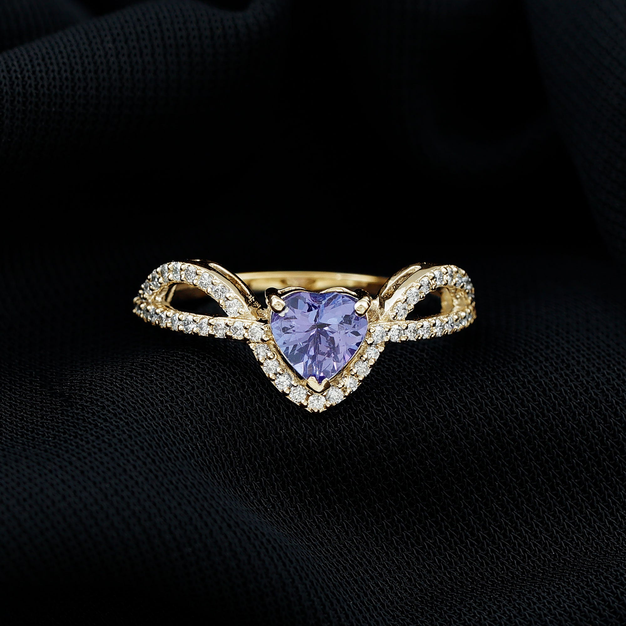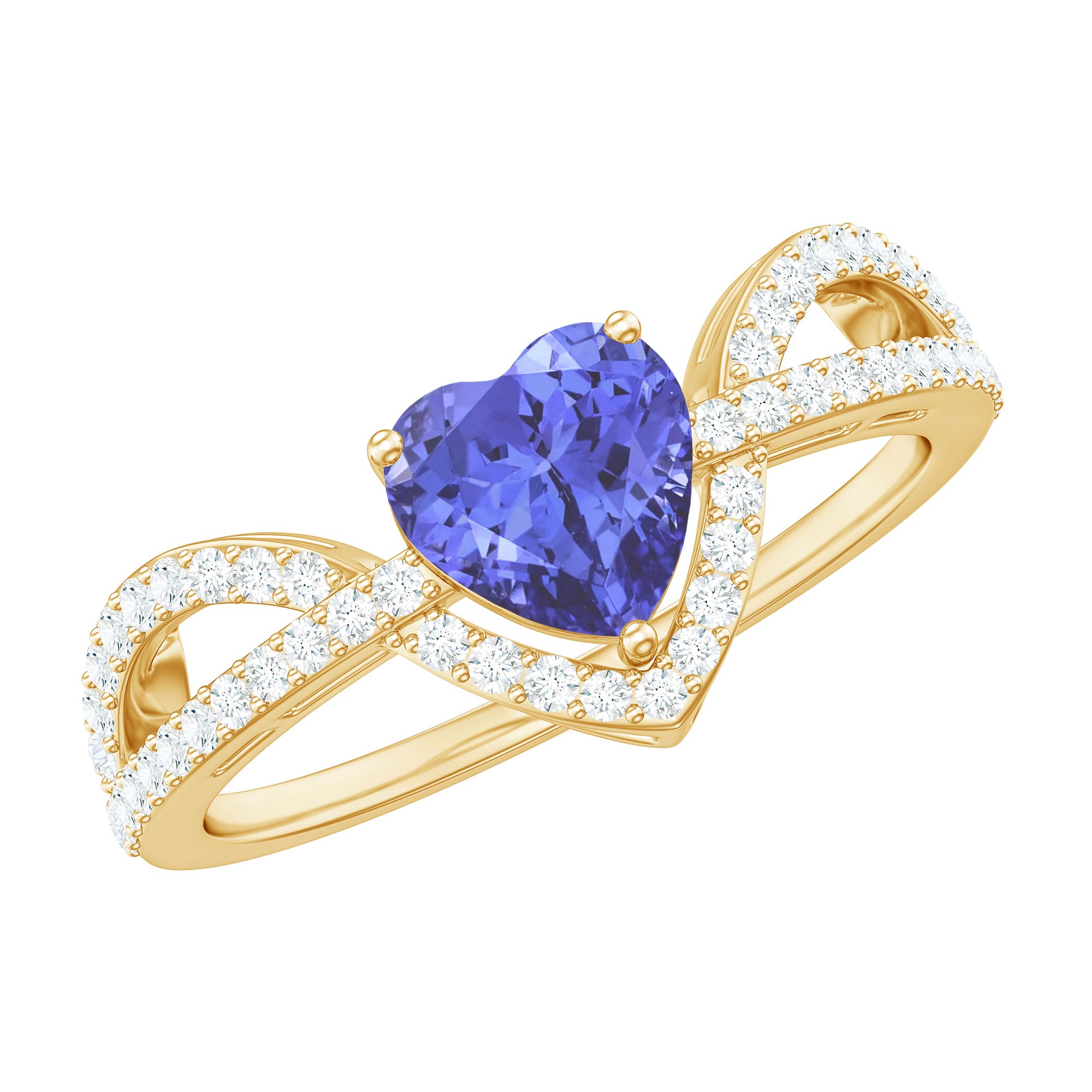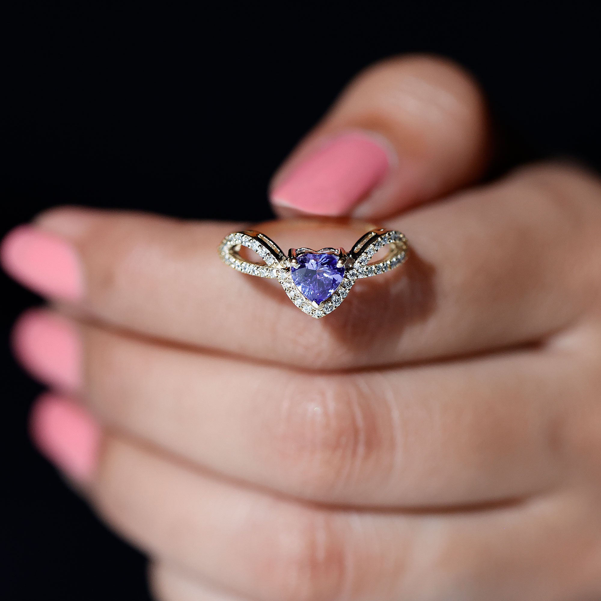 Give a flair of elegance to your look with this Designer Solitaire Ring adorned with Heart Shape Tanzanite set as Solitaire in a Prong Setting with Diamond Accent and Split Shank design gives this ring a amazing look, crafted in Gold, this designer Ring is a timeless treasure.