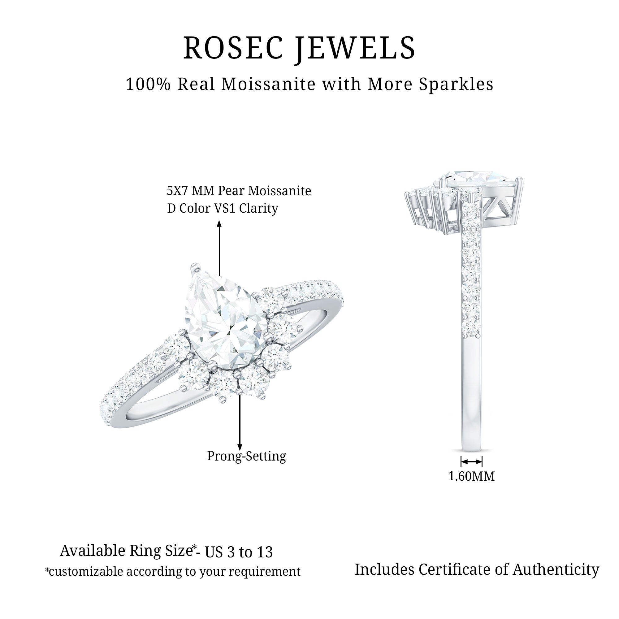 This Designer Engagement Ring is bound to wow anyone who sees it. At its heart, it showcases a 5X7 MM pear shaped moissanite of D-VS1 quality, set in prong setting, and is encircled by additional round cut moissanite stones that form a half halo around the main stone. The sleek band is adorned with delicate round cut moissanite for that added sparkle, and its stylish yet elegant design makes it perfect for everyday wear as well as special occasions. This Moissanite Engagement Ring is more than just jewelry; it radiates beauty and unconditional love. Begin your forever with something that is both stunning and timeless. What sets this Teardrop Engagement Ring apart is its versatility - whether you need an Engagement Ring that truly shines, a Proposal Ring to ask the big question in style, or just a gift for your loved one to commemorate your special moments, this piece is the ideal choice. Plus, it adds a classic charm with a touch of royalty in one breathtaking piece, making it a meaningful and thoughtful addition to your jewelry collection.