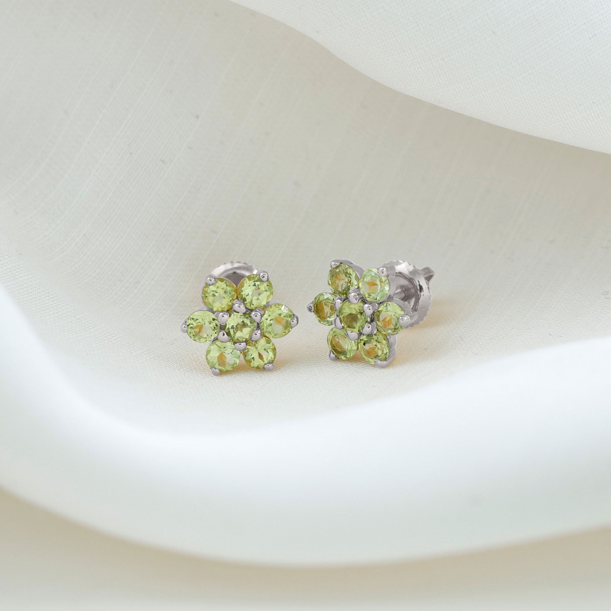 These lovely Floral Cluster Stud Earrings are designed with sparkling Round Cut Peridot over Solid Gold build to make for a charming accessory for your everyday looks.